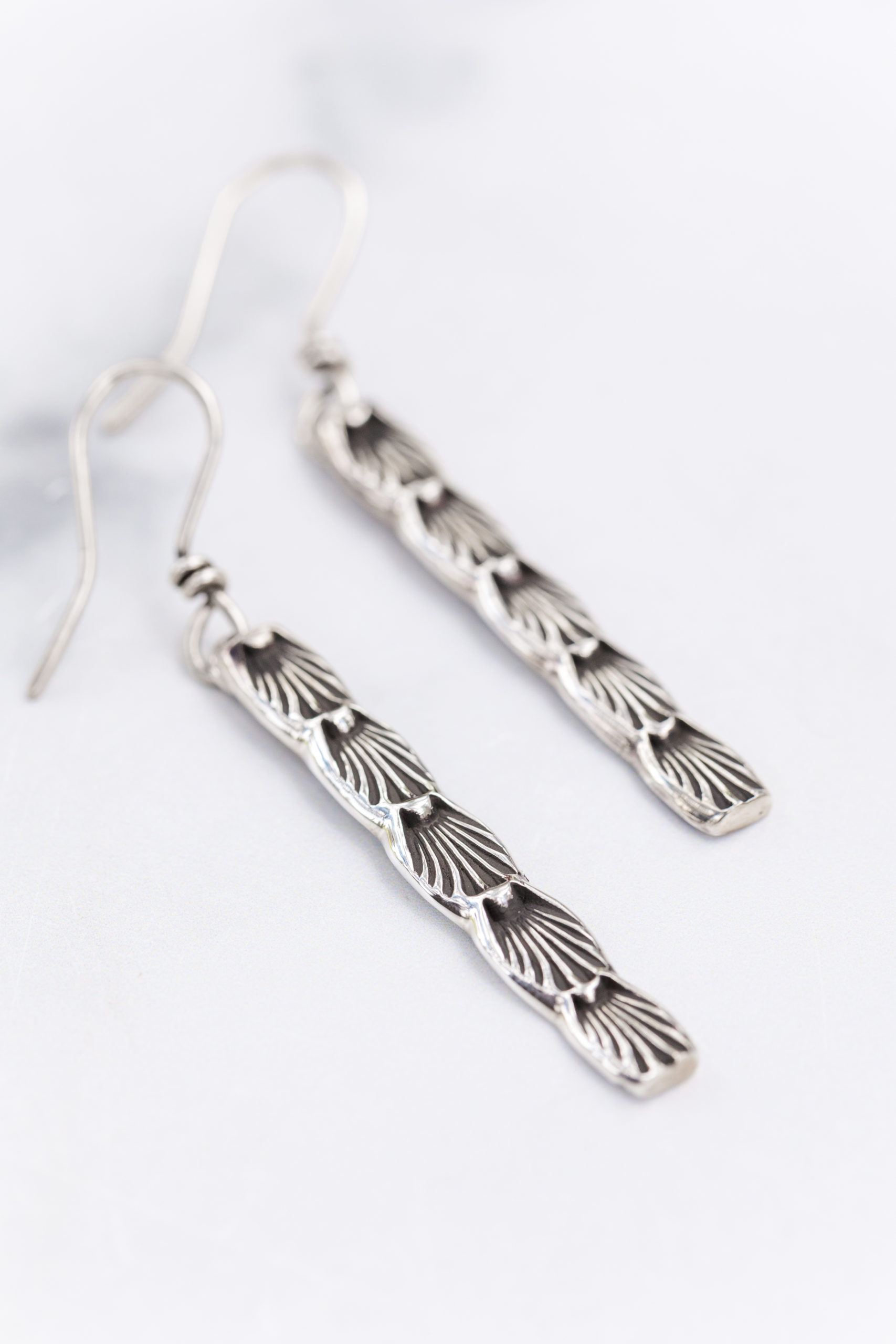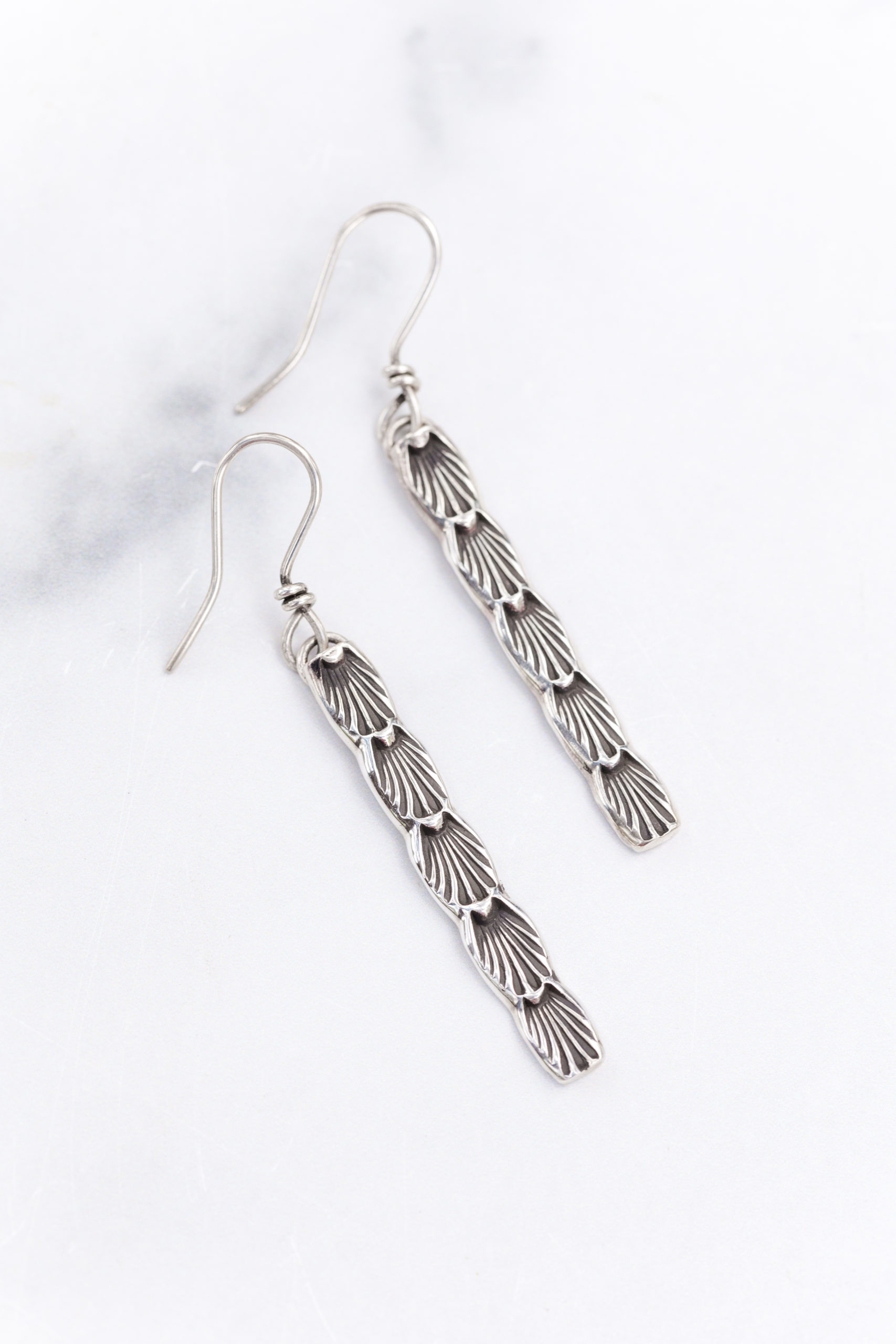 A Reed & Rush classic, the stamped bar earrings are lightweight and add the perfect amount of shine to any occasion. They are oxidized and given a high polish. The earrings measure 2.5″ total from the top of the earwire to the bottom of the pendant.