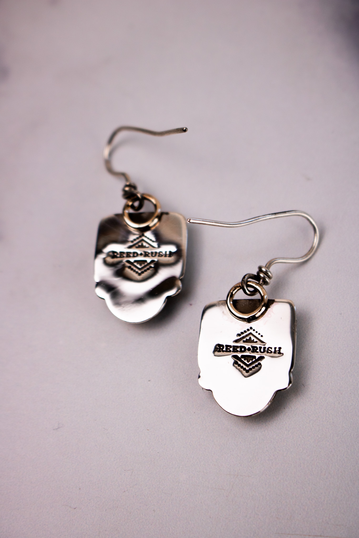 These magical earrings where inspired by my time in the cenotes around Tulum Mexico. They feature vibrant Kingman turquoise, hand stamped embellishment and are hung by 14K goldfill hoops. They are finished with a makers mark on the back of the pendants and given a high shine finish.
