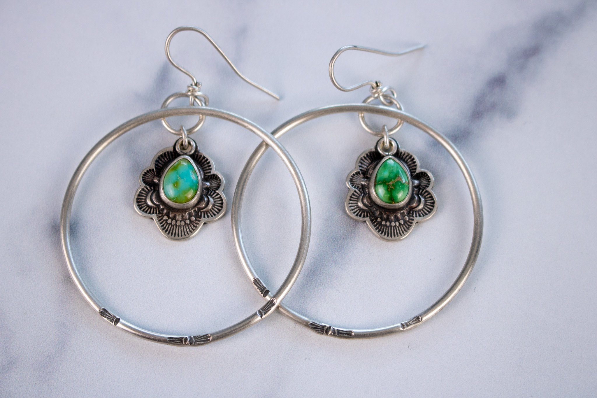 Sierra Bella turquoise teardrops surrounded by hand stamped detail and then given a scalloped edge. The pendants are hung in the middle of 2″ full round stamped hoops. They measure 2.75″ from the top of the earwire to the bottom of the hoop and the center pendant is 1″ long. The earrings are oxidized and given a soft satin finish. All components sterling silver.