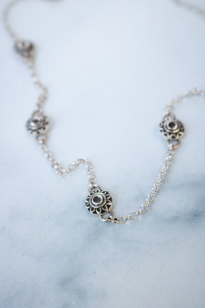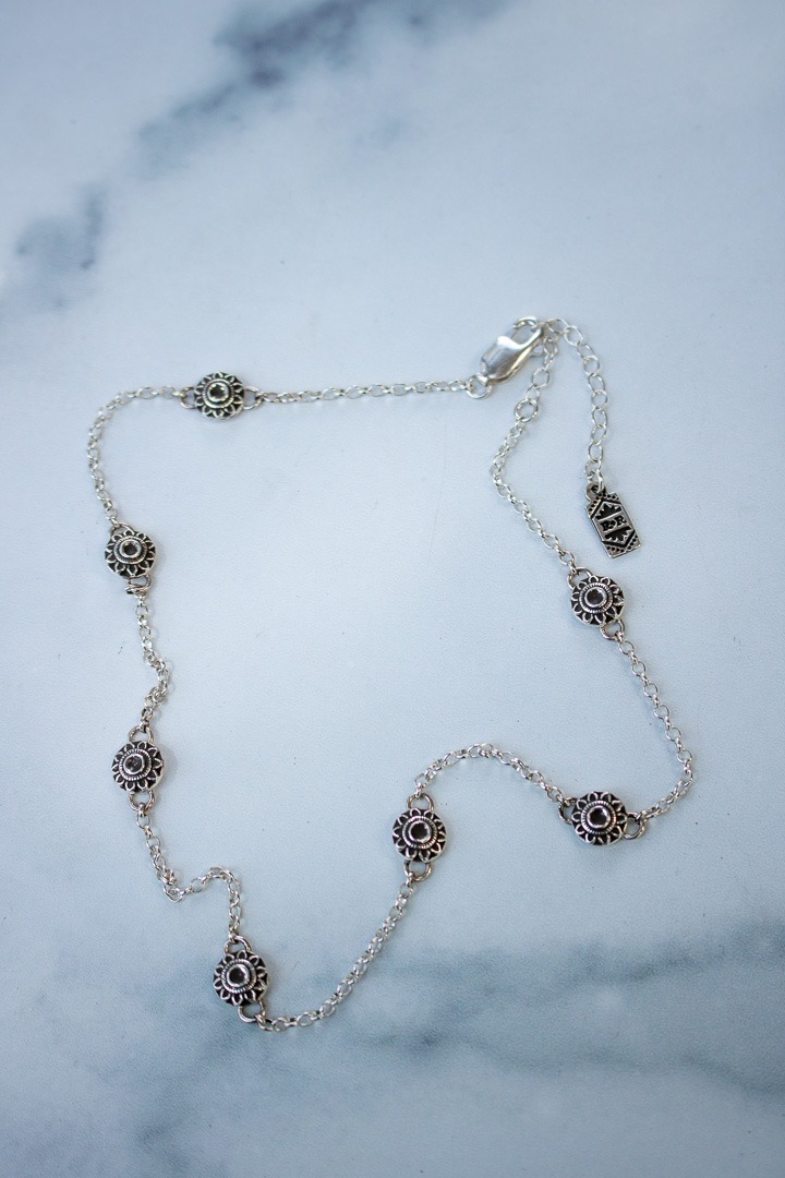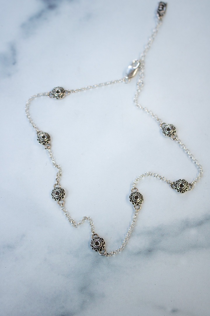 This necklace is inspired for the slow movement of the sun across the winter sky. This delicate choker is the perfect accent to any sundress or tank top and works well alone or with other necklaces for a layered look. It features 7 handcrafted sundance charms on a 2mm oval rolo link chain and a stamped marker’s mark tag.