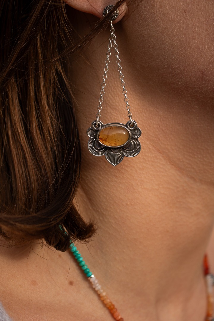 These earrings are a true show stopper. They feature honey yellow Baltic amber surrounded by handstamped sterling silver. I create a cut out behind the stones so the sun can shine through and highlight the amber. The pendants are hung from a sundancer stud that comes with a large ear nut for stability and comfort. They are finished with a scalloped edge and high shine finish.