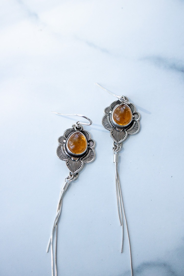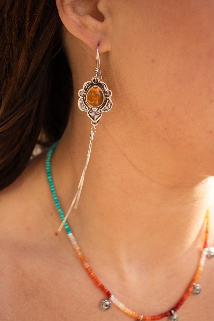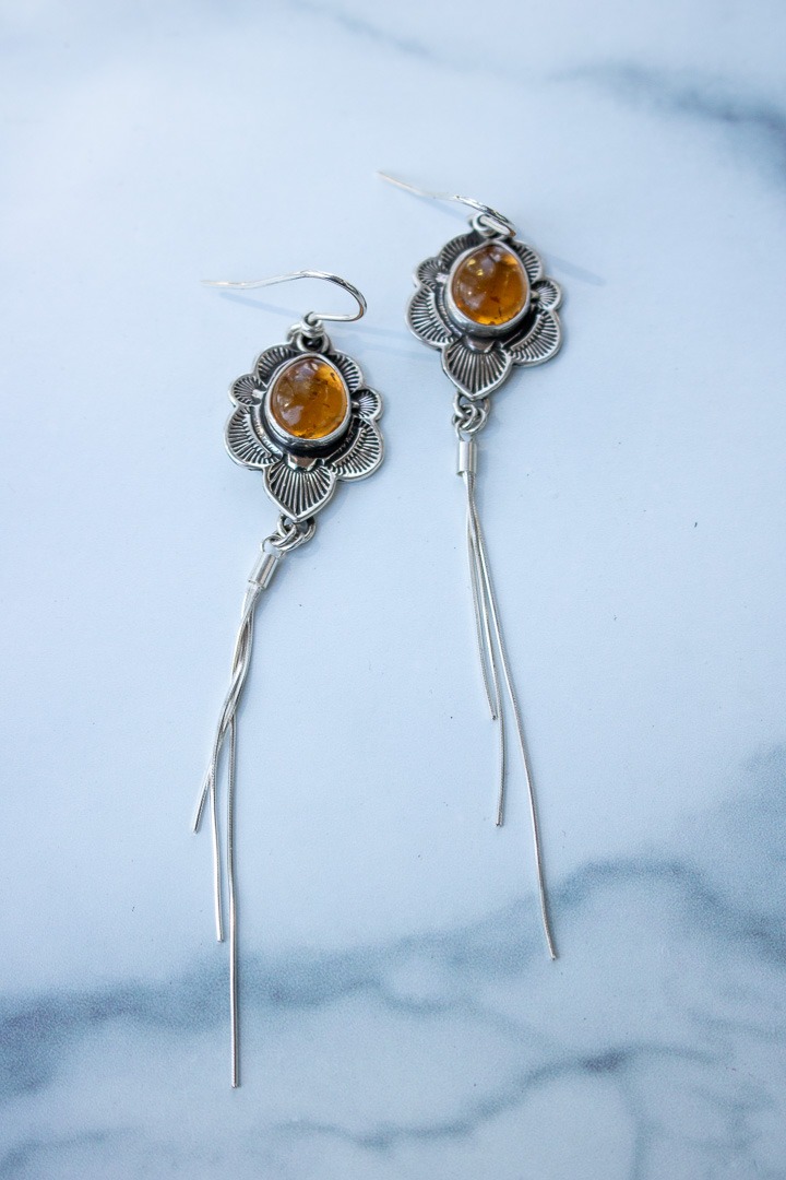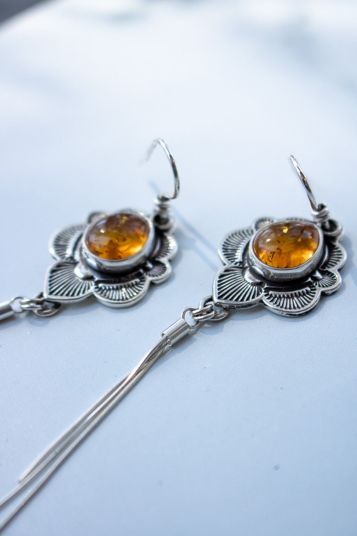 Hand stamped sterling silver surrounding a glowing piece of Baltic amber and finished with a handcrafted scalloped edge. I also cut out the backplate behind the stone so the light can shine through. Attached to the central pendant are 3 strands of sterling silver chain to create a gorgeous fringe. The earrings measure 4.75″ from the top of the ear wire to the bottom of the pendant. Oxidized and finished with a high shine.