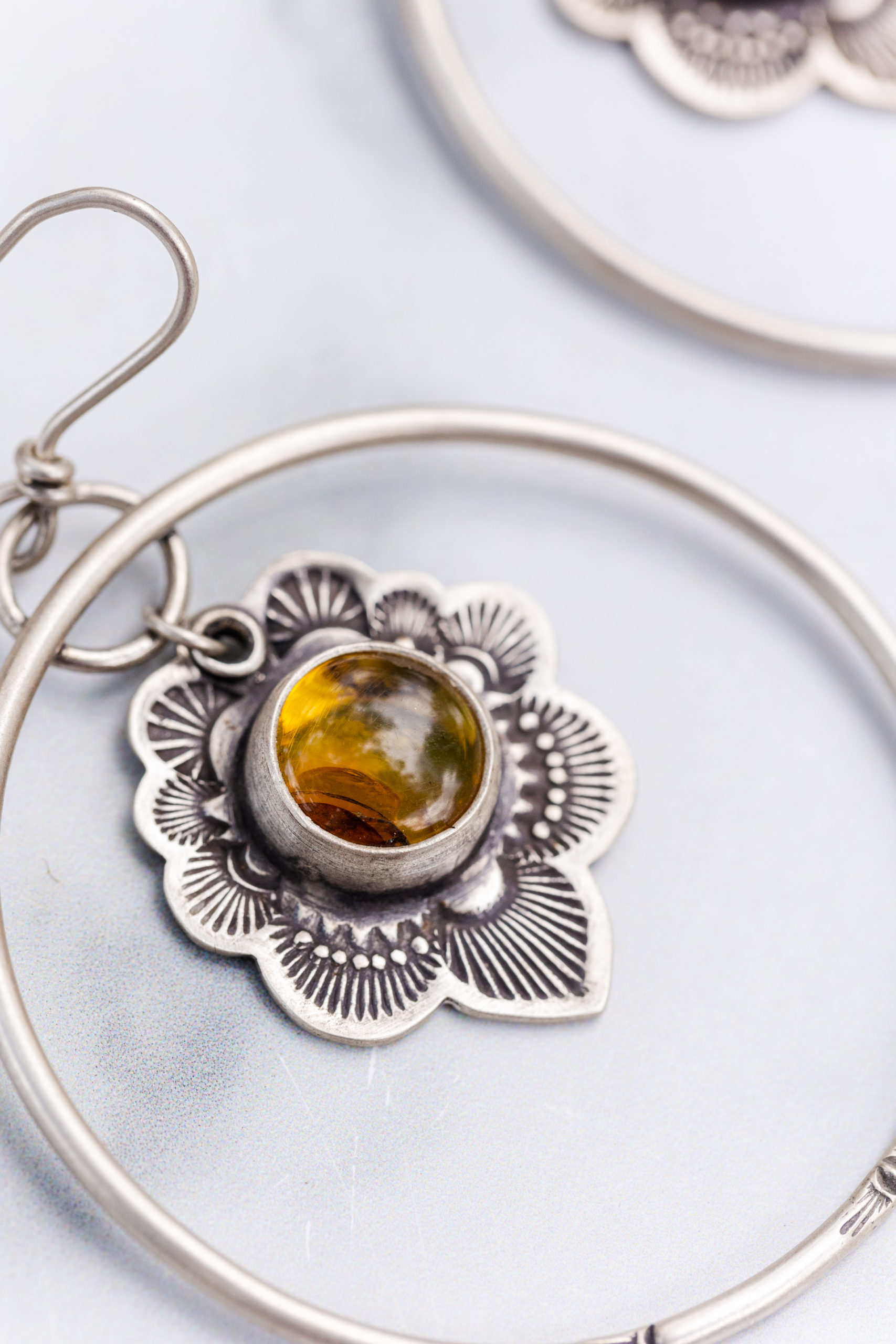 Stamped sterling and handcut, ethically sourced Mexican Amber. The stones are showcased with handstamped detail and then given a scalloped edge. The back of the pendants are cut out so that the light can shine through the amber. They measure 3″ from the top of the earwire to the bottom of the hoop and the center pendant is 1″ long. Oxidized and given a soft satin finish.