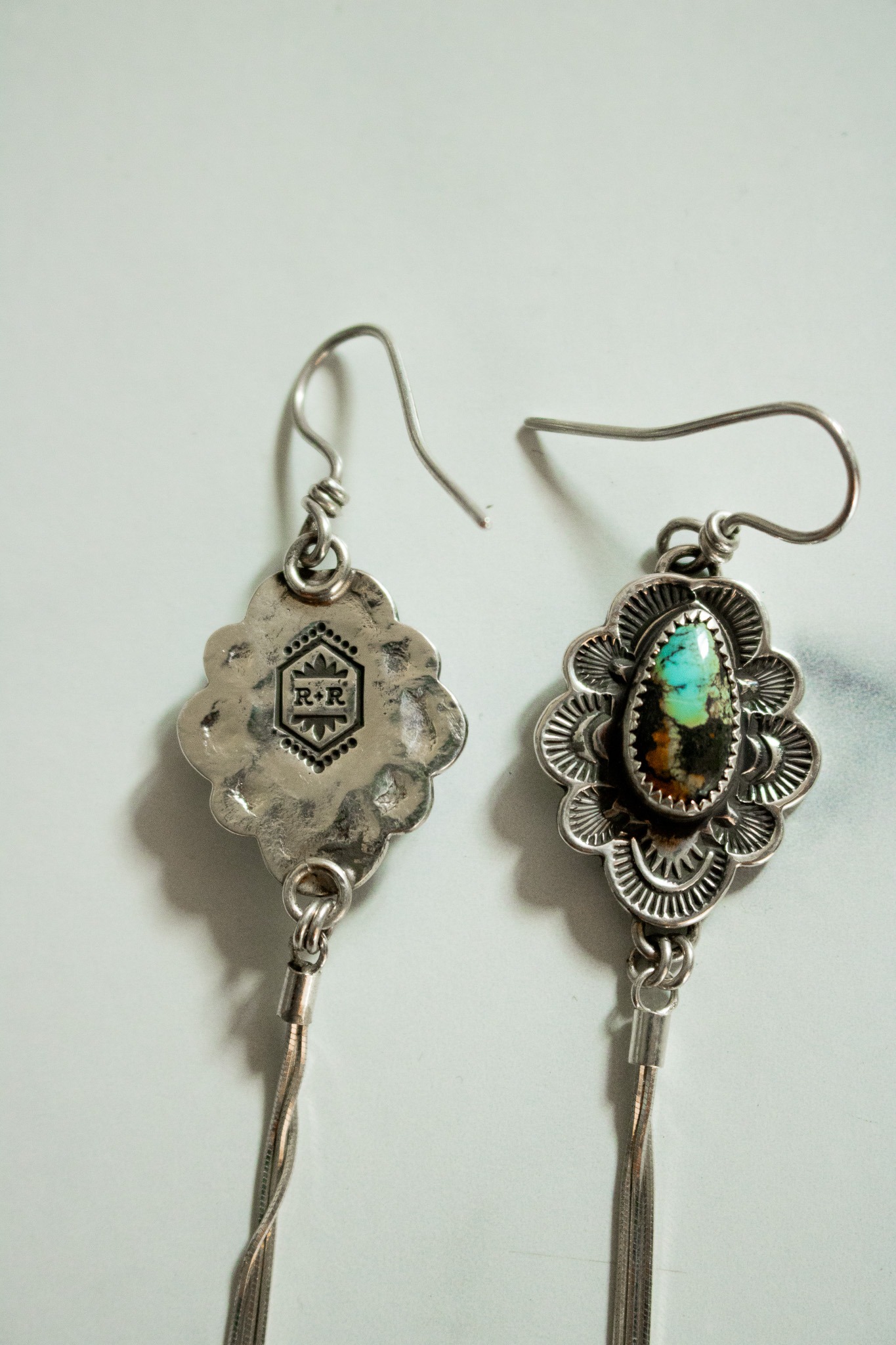 Hand stamped sterling silver surrounding a Black Jack turquoise stone and finished with a handcrafted scalloped edge. Attached to the central pendant are 3 strands of 3″ sterling silver chain to create a gorgeous fringe. The earrings measure 4.25′ from the top of the earwire to the bottom of the pendant. Oxidized and finished with a high shine.