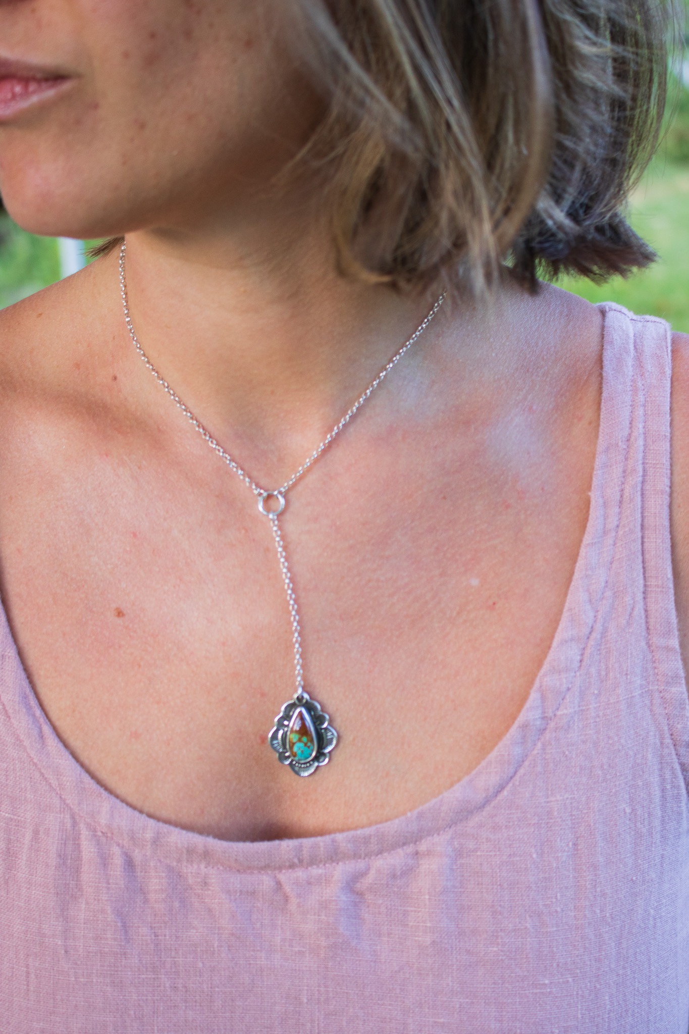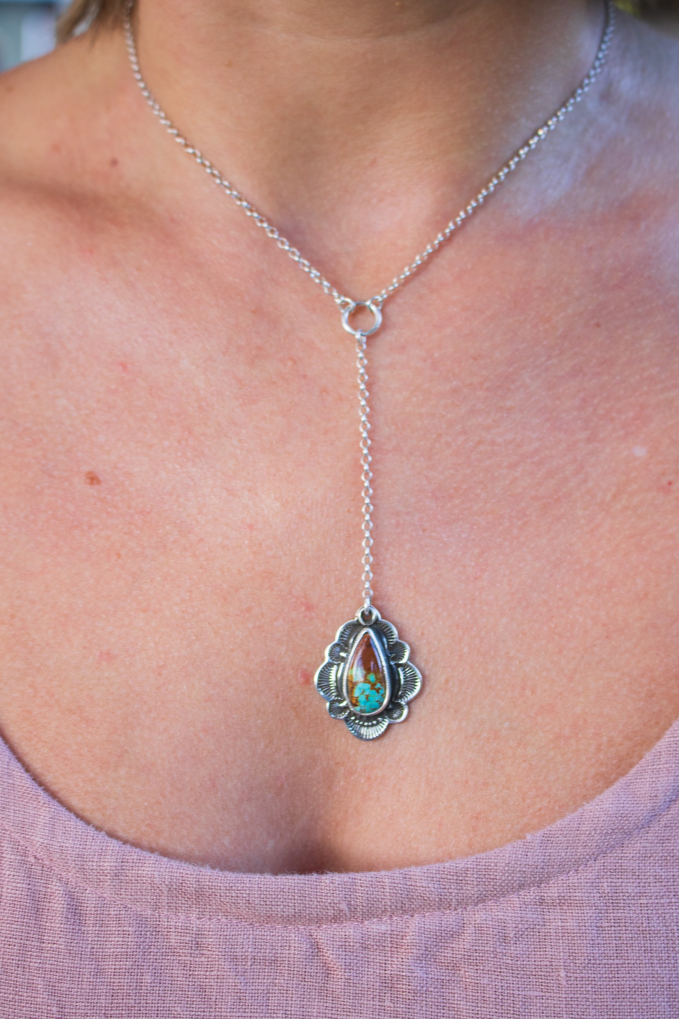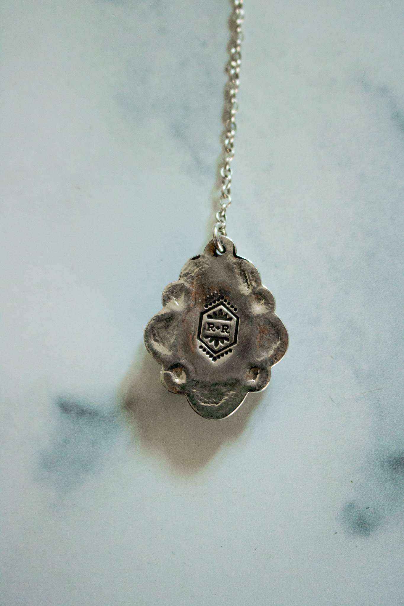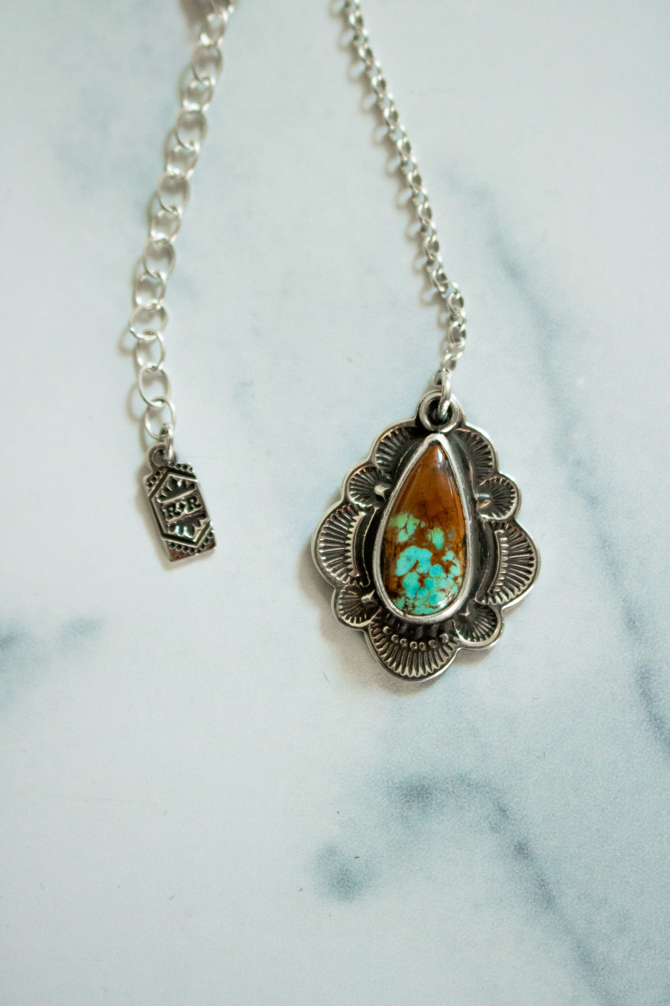 Black Jack turquoise surrounded by hand stamped sterling silver and a handcrafted scalloped edge. The pendant measures 1 1/4” long and hangs on a 2.25” inches from a sterling ring. The main chain is 16-18” so you can adjust it to best compliment your personal style. Oxidized to highlight the details and finished with a high shine finish and given R&R makers mark at the clasp.