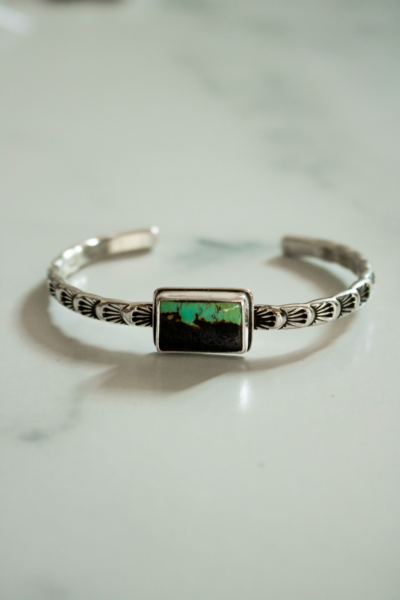 The cuff starts out full round sterling wire that I hammer flat and then hand stamped, including an R+R markers mark inside the band. After its been shaped into a cuff, I solder the bezel for and set a gorgeous piece of Black Jack turquoise. Its then oxidized to highlight the detail and polished to a high shine. Band is 3/16” wide and is in 5.75” length (medium size) but can be sized down upon request.
