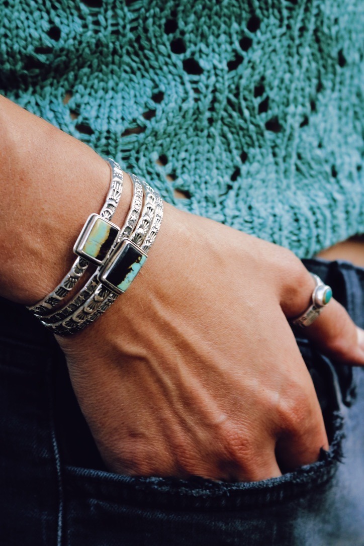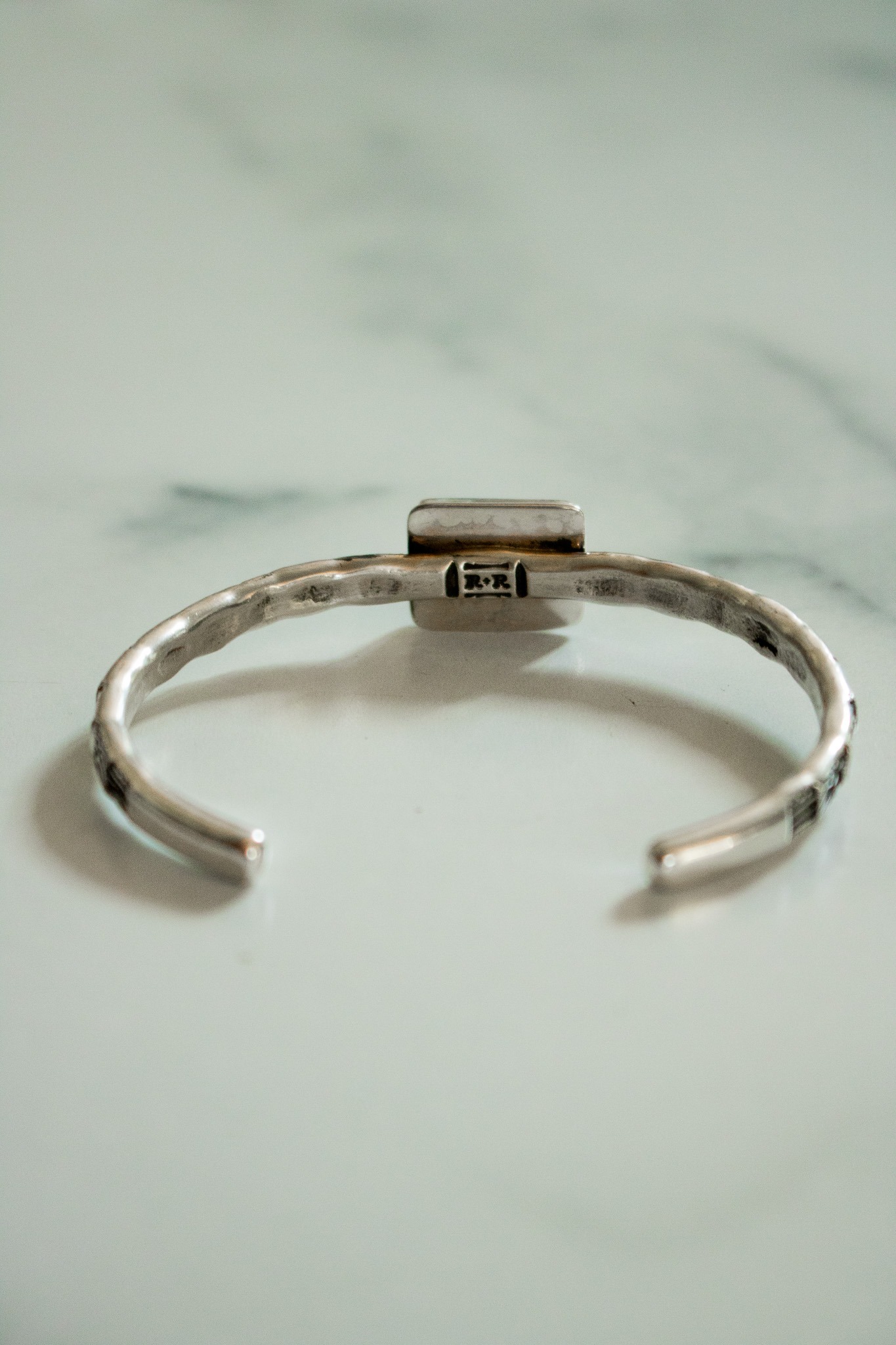 The cuff starts out full round sterling wire that I hammer flat and then hand stamped, including an R+R markers mark inside the band. After its been shaped into a cuff, I solder the bezel for and set a gorgeous piece of Black Jack turquoise. Its then oxidized to highlight the detail and polished to a high shine. Band is 3/16” wide and is in 5.5” length (medium size) but can be sized down upon request.