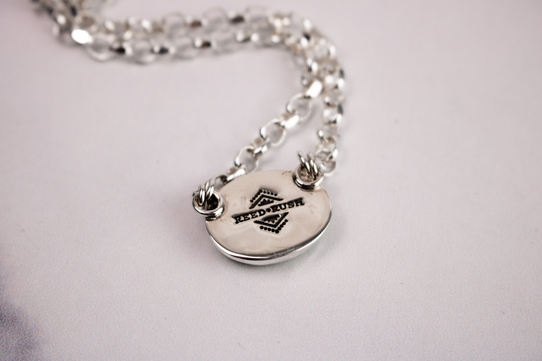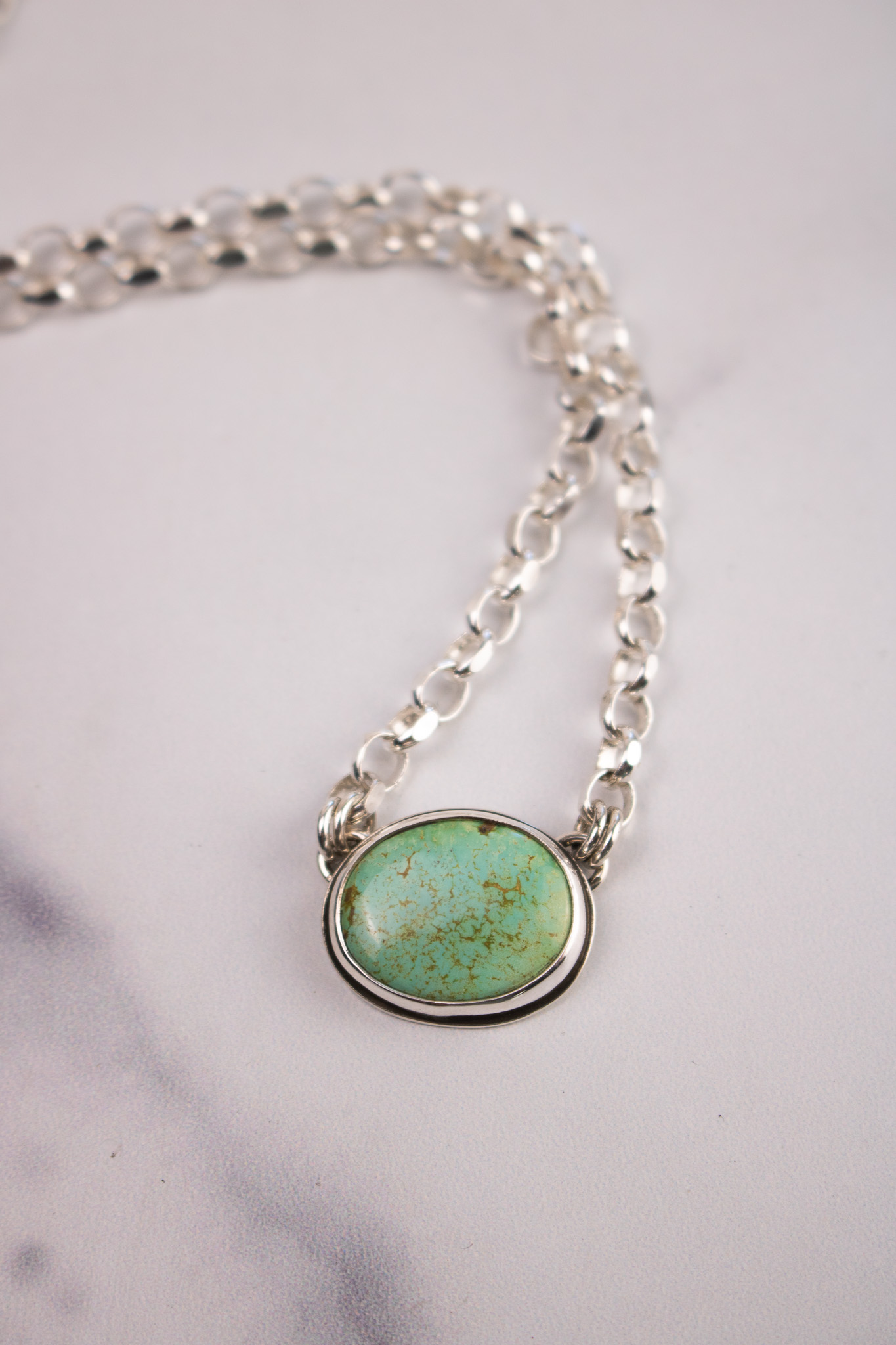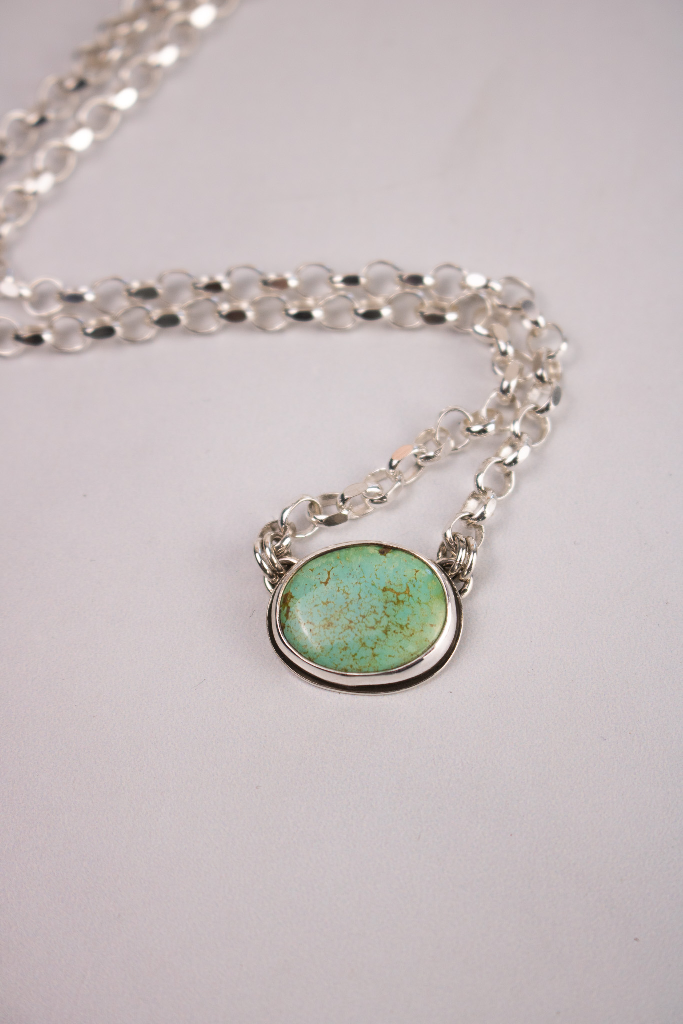 Made with 5.1mm sterling silver rolo chain, these necklaces are perfect simple, statement making pieces. The center pendant is vibrant Sonoran Gold turquoise and has a R+R maker’s mark on the back. The s-hook clasp makes this necklace adjustable in size and perfect for any neckline.