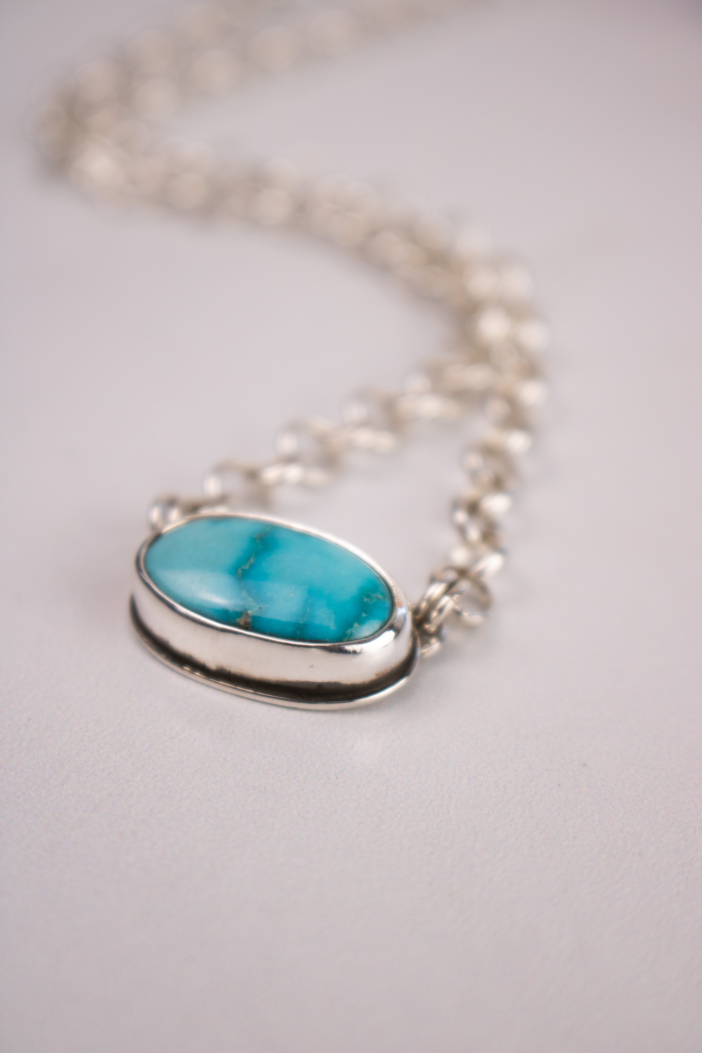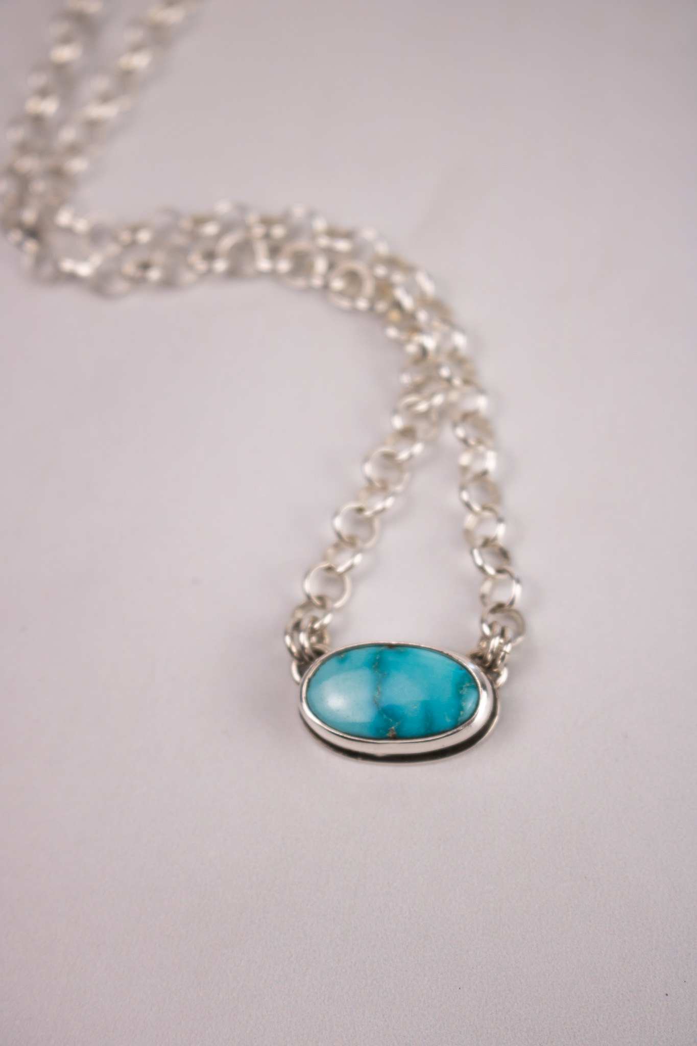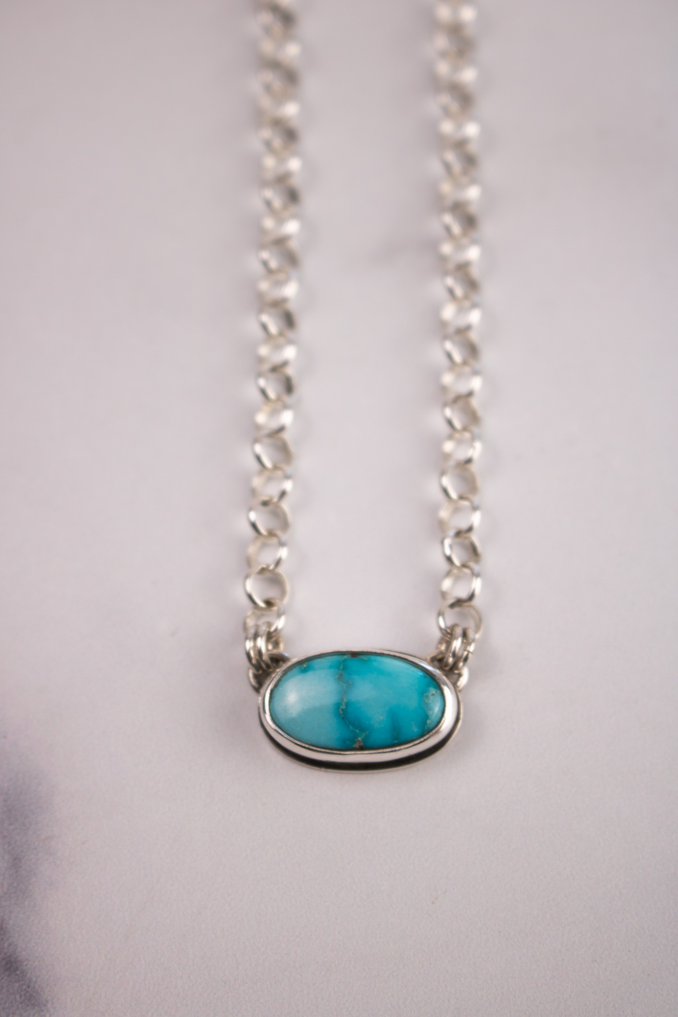 Made with 5.1mm sterling silver rolo chain, these necklaces are perfect simple, statement making pieces. The center pendant is vibrant Sonoran Gold turquoise and has a R+R maker’s mark on the back. The s-hook clasp makes this necklace adjustable in size and perfect for any neckline.