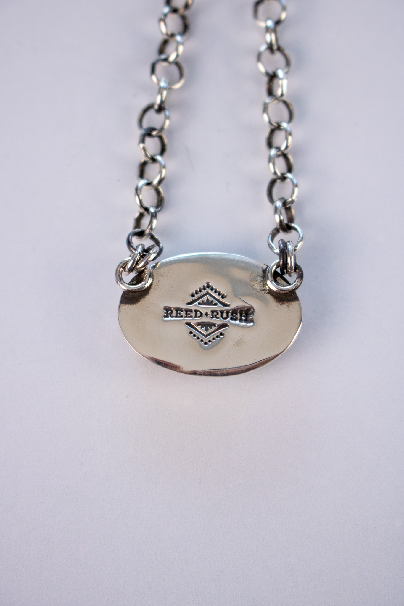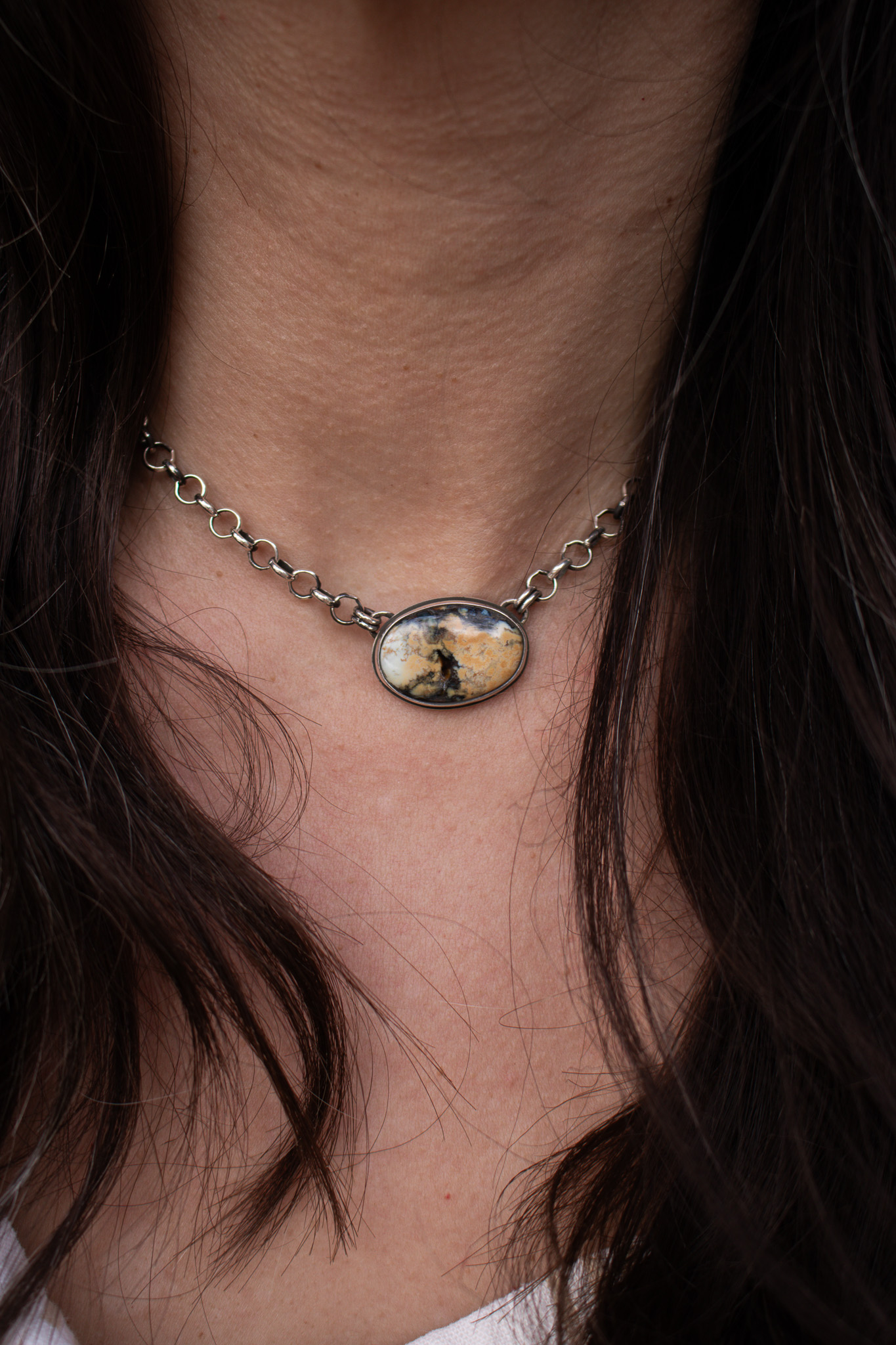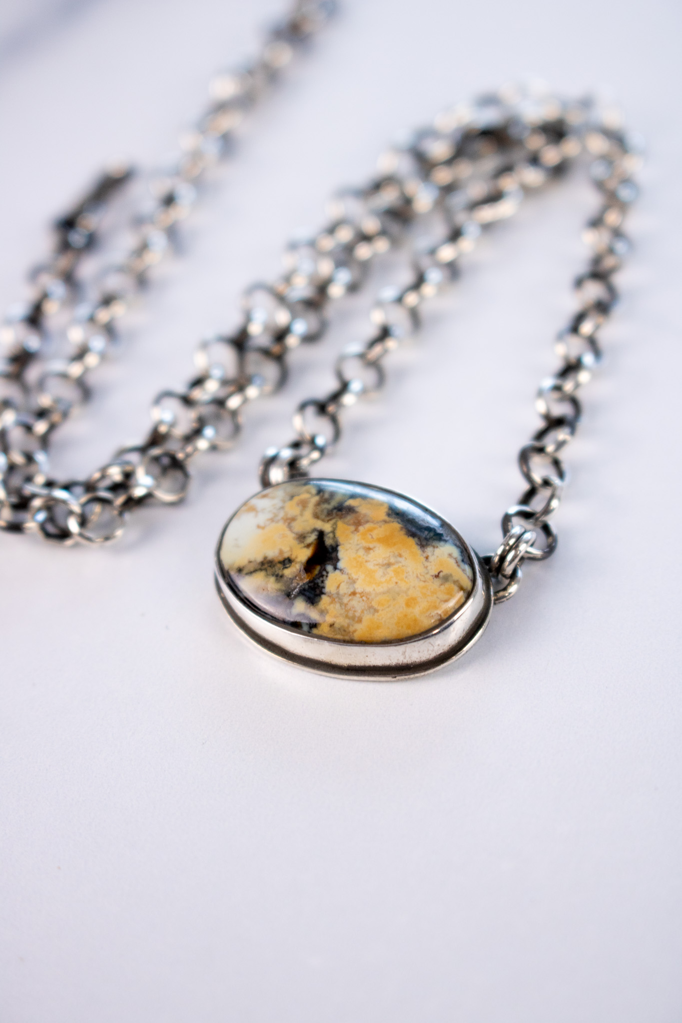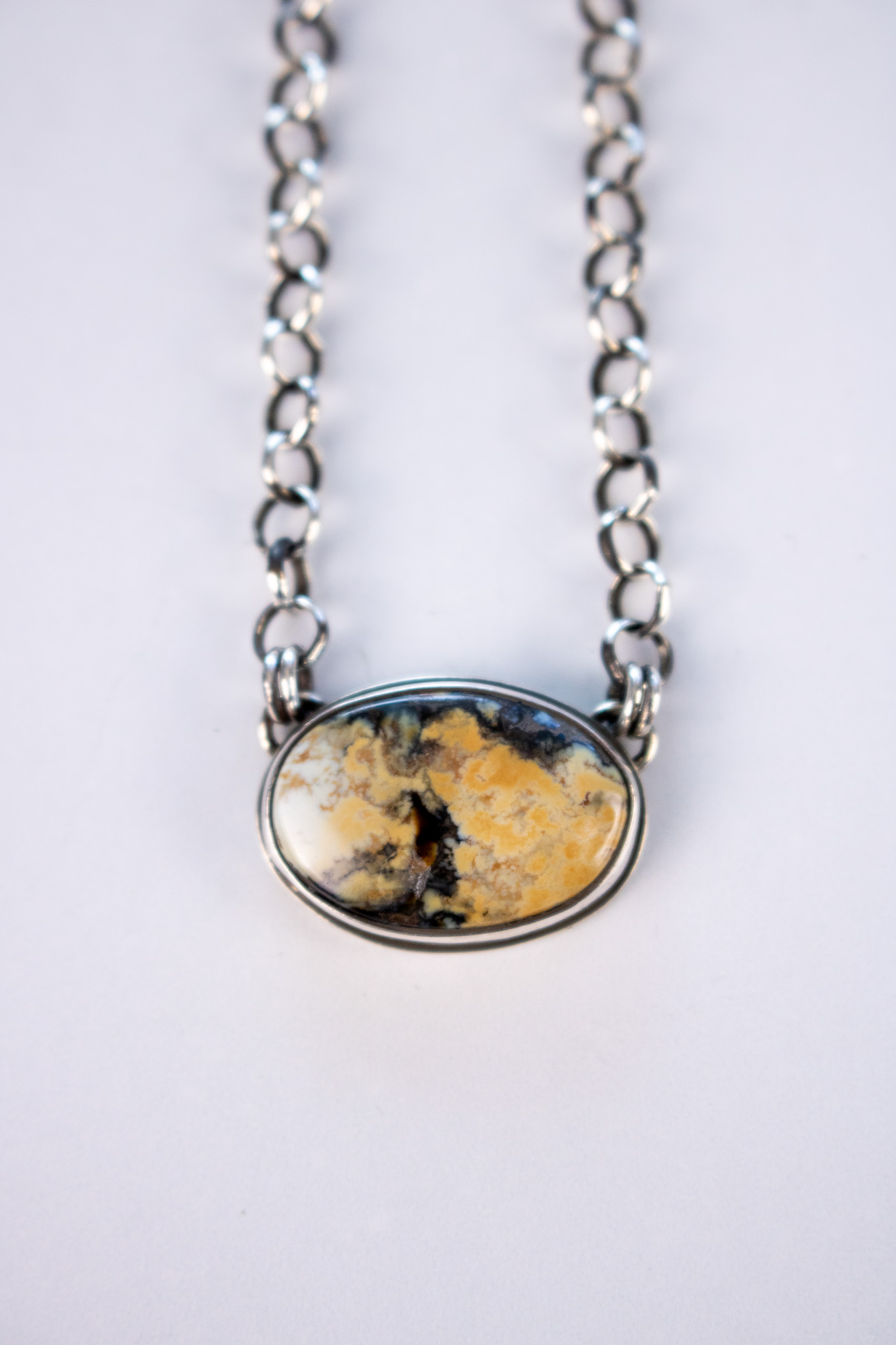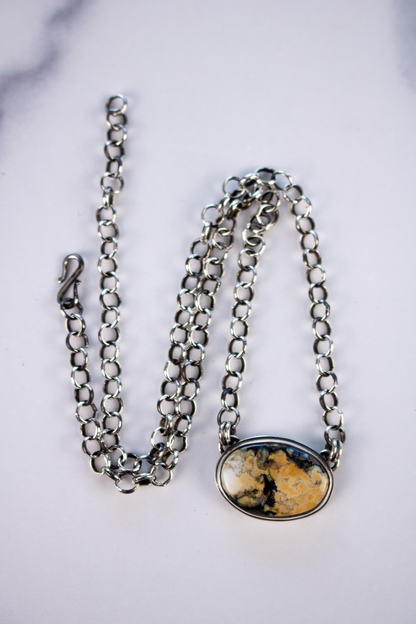 Made with 5.1mm sterling silver rolo chain, these necklaces are perfect simple, statement making pieces. The center pendant is dreamy Snow Cloud turquoise and has a R+R maker’s mark on the back. The chain has been oxidized and then given polished to a high shine for extra dimension. The s-hook clasp makes this necklace adjustable in size and perfect for any neckline.