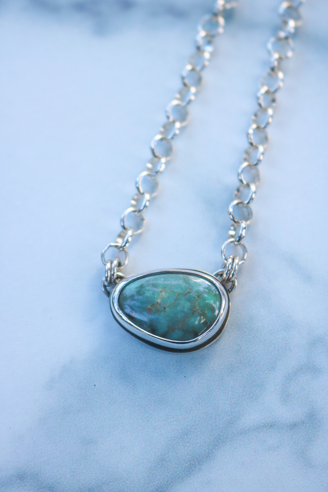 Made with 5.1mm sterling silver rolo chain, these necklaces are perfect simple, statement making pieces. The center pendant gorgeous Damele turquoise and has a R+R maker’s mark on the back. The s-hook clasp makes this necklace adjustable to any size 18″ and under and perfect for any neckline.