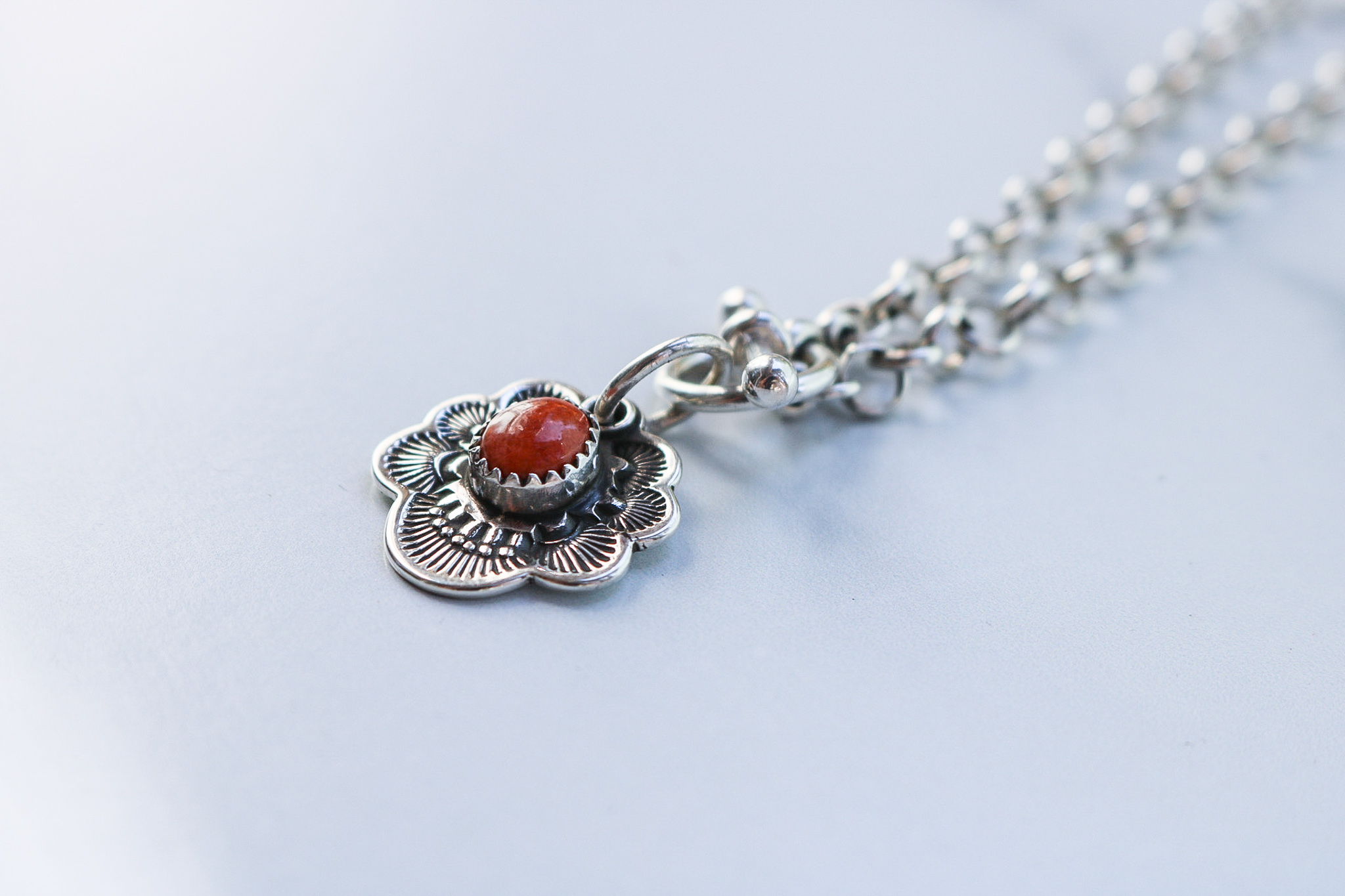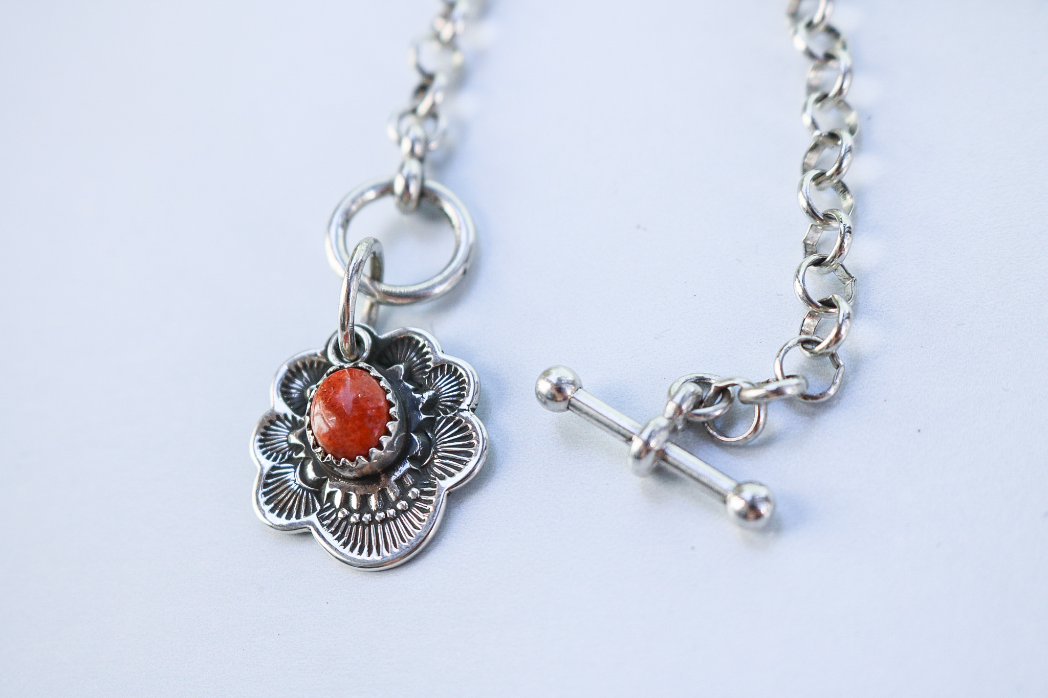 Hand cut Sponge Coral surrounded by hand stamped 16 gauge sterling silver and a handcrafted scalloped edge. Oxidized to highlight the details and finished with a high shine polish. The pendant measures just under a 1′ long and hangs on a thick 5.1mm rolo chain with toggle clasp. This bracelet measure 7″ long but can be sized down upon request. All components are sterling silver.