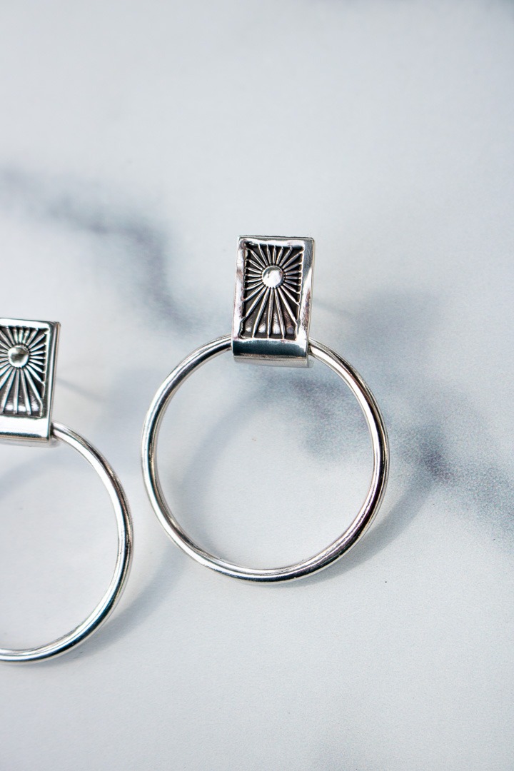 When I found this sunrise stamp used to create these hoops, I instantly knew what I wanted to make. They reminded me of a tarot card and I wanted to showcase the stamp with a fixed sterling hoop to make a pair of stud earrings that could be worn all day and with anything. They have been oxidized to highlight the detail and finished with a high shine polish. They include a large earnut to keep the earring secure and easy to wear.