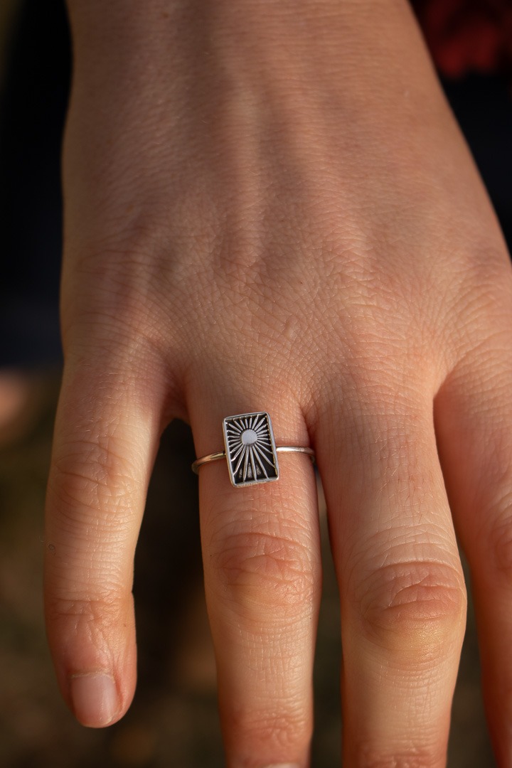 Once stamped, the central feature is soldered to a 16g wire band, oxidizes and given a high shine polish.This stacker can be worn alone or with other stacking rings.