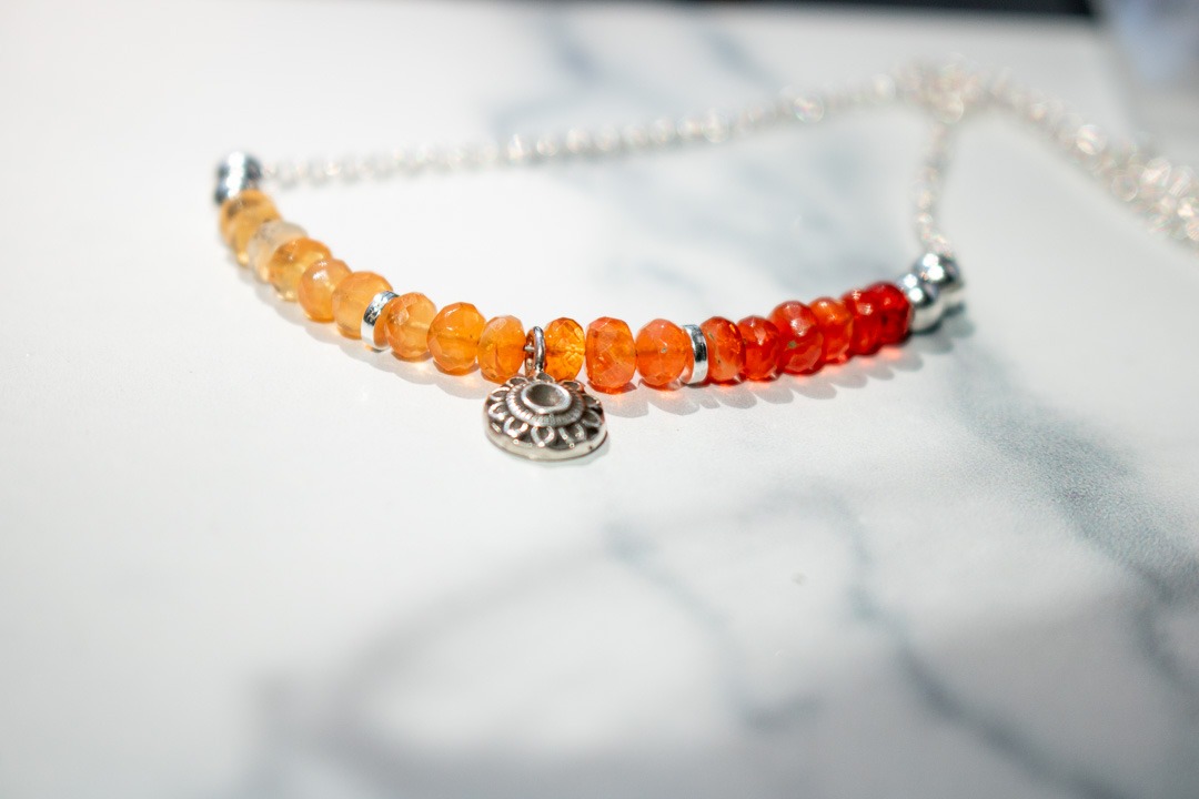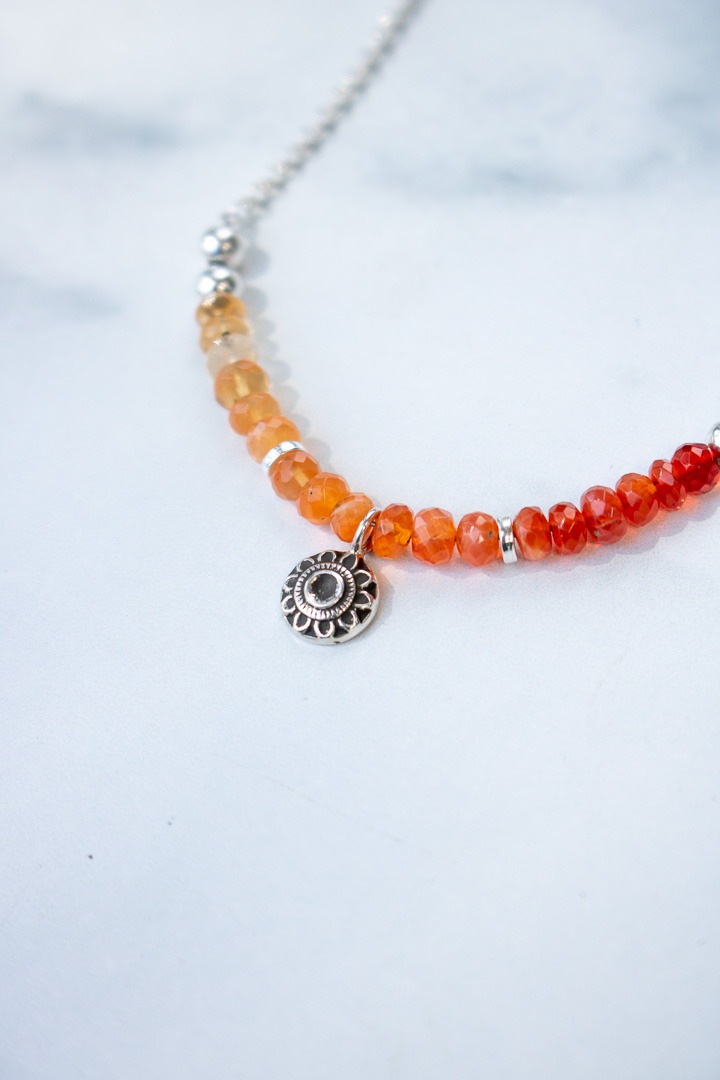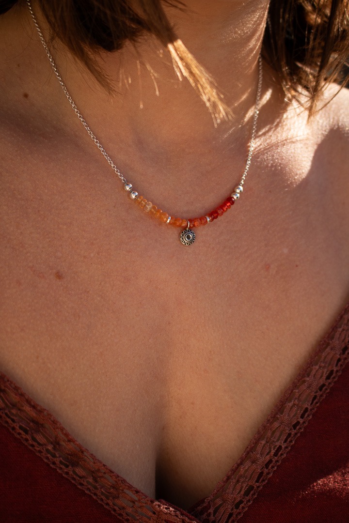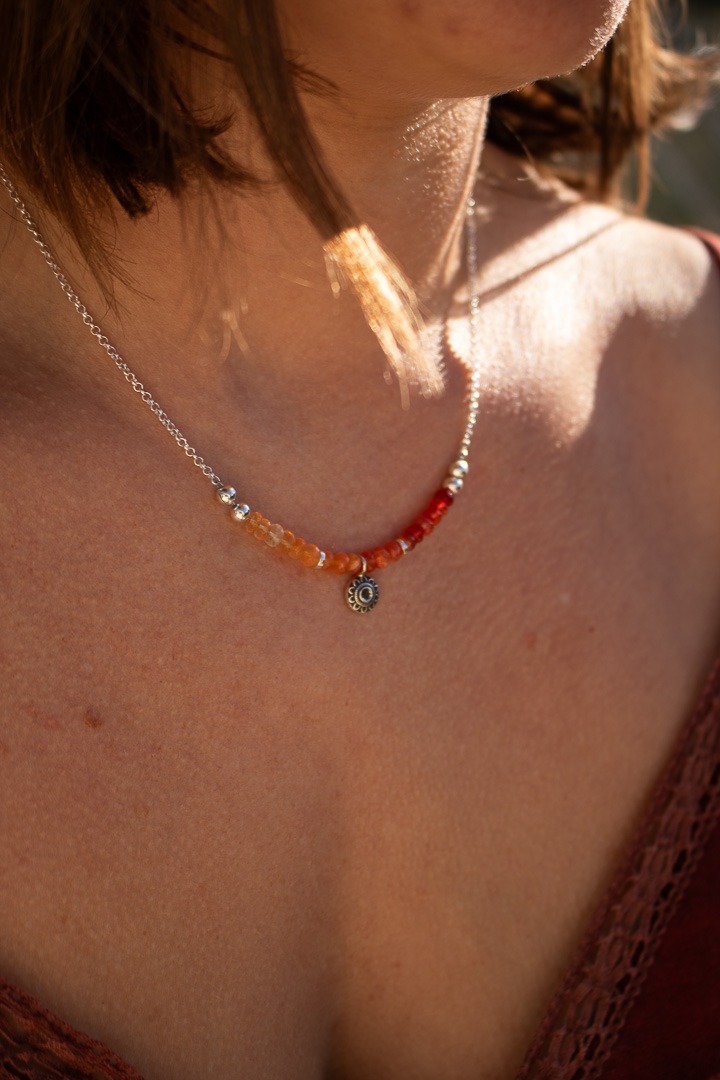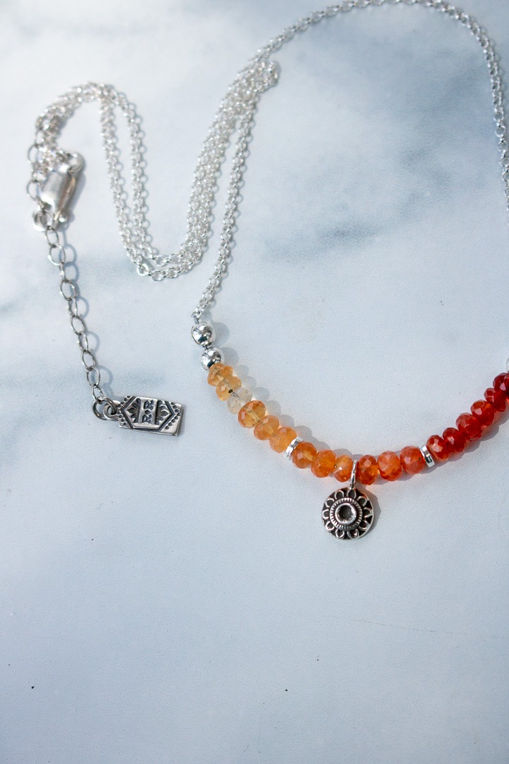 The mini charm necklaces are one of my daily drivers. Lightweight, subtle and stackable, this design checks all the boxes. This one is composed of 2” an ombre set of fire opal beads, a single hand formed sterling sundance charm made from recycled silver and a 1.9mm sterling rolo chain. It includes a 2″ sterling silver extender that makes it adjustable between 16-18″ and is finished with a signature R+R makers tag.
