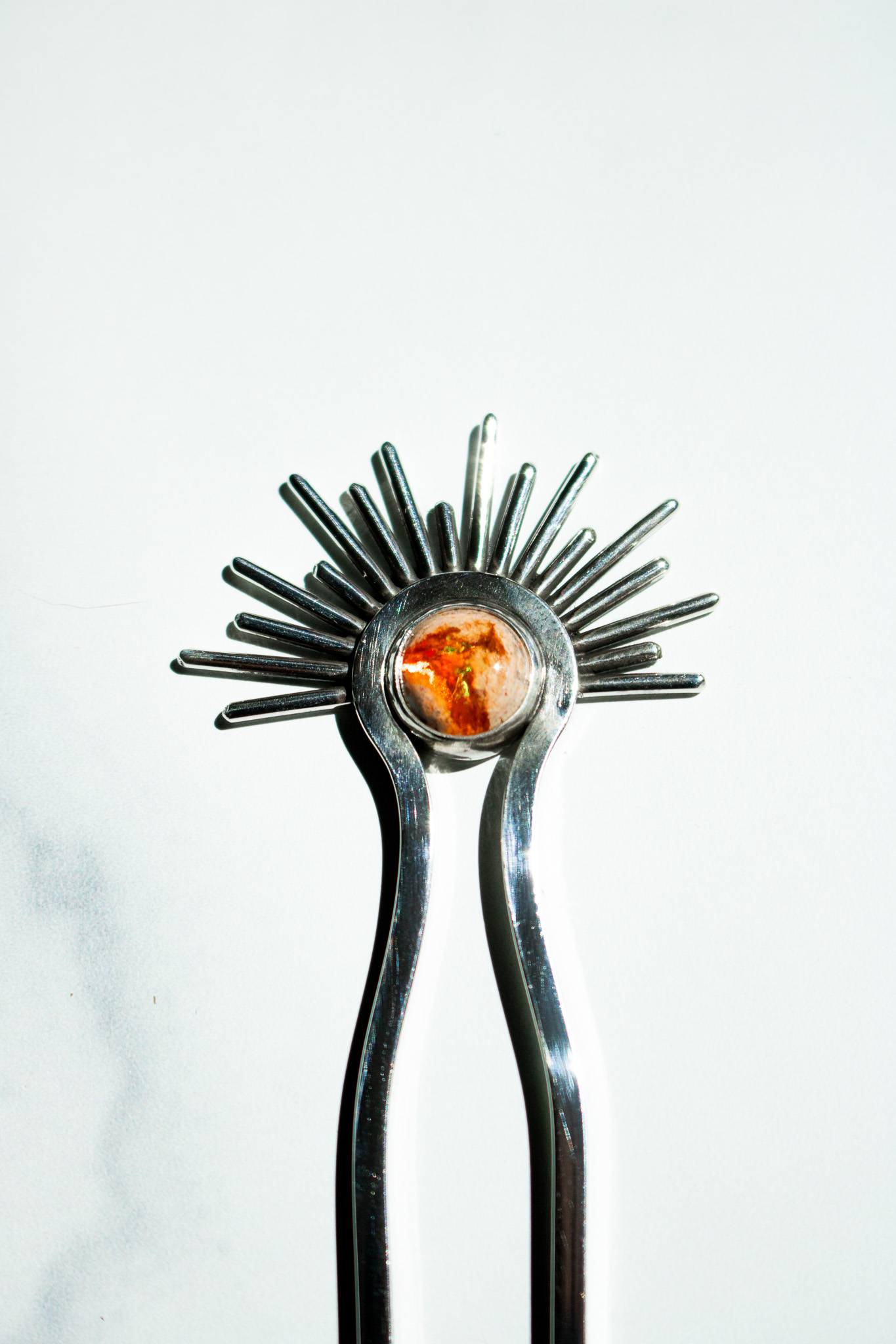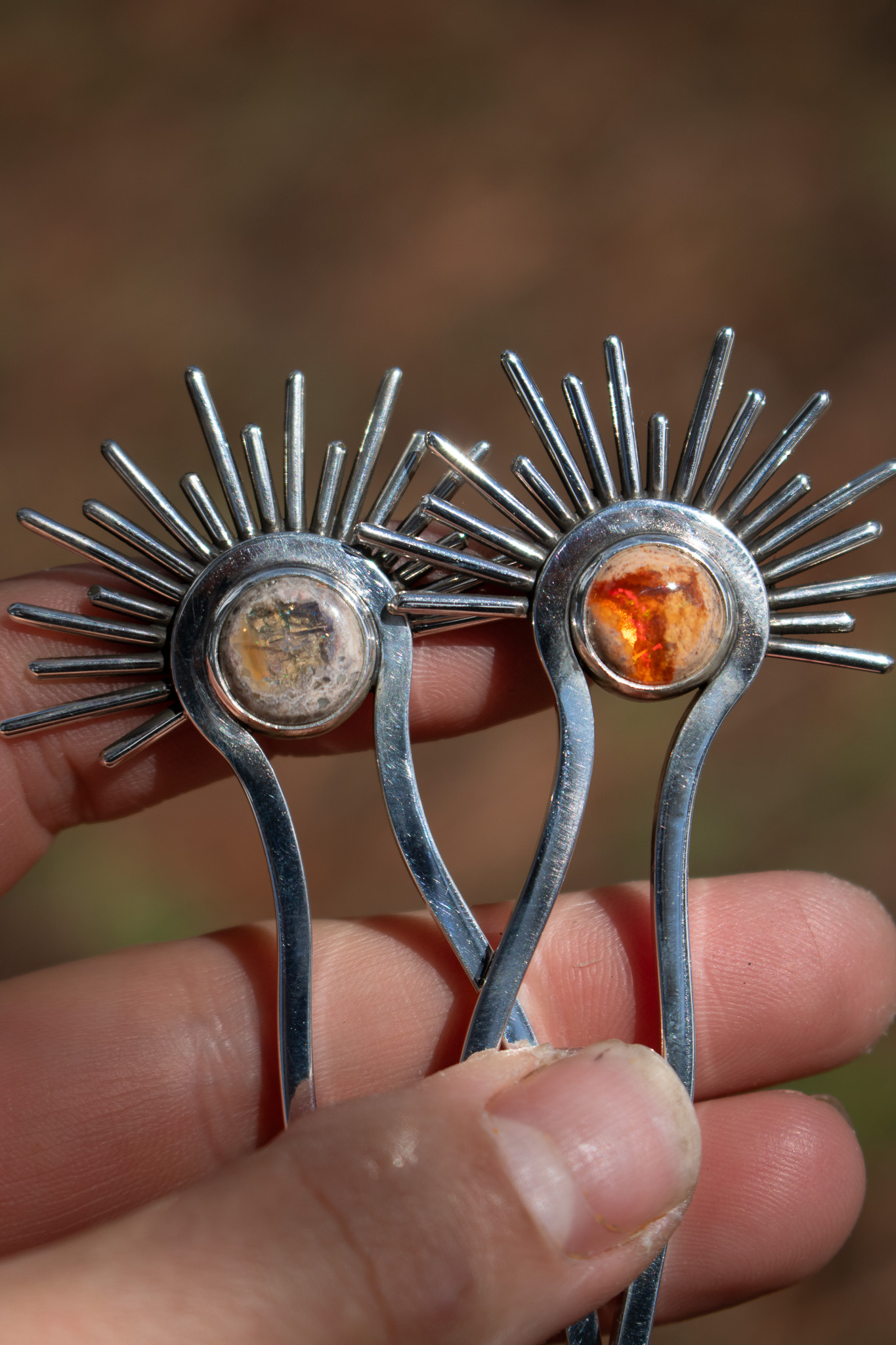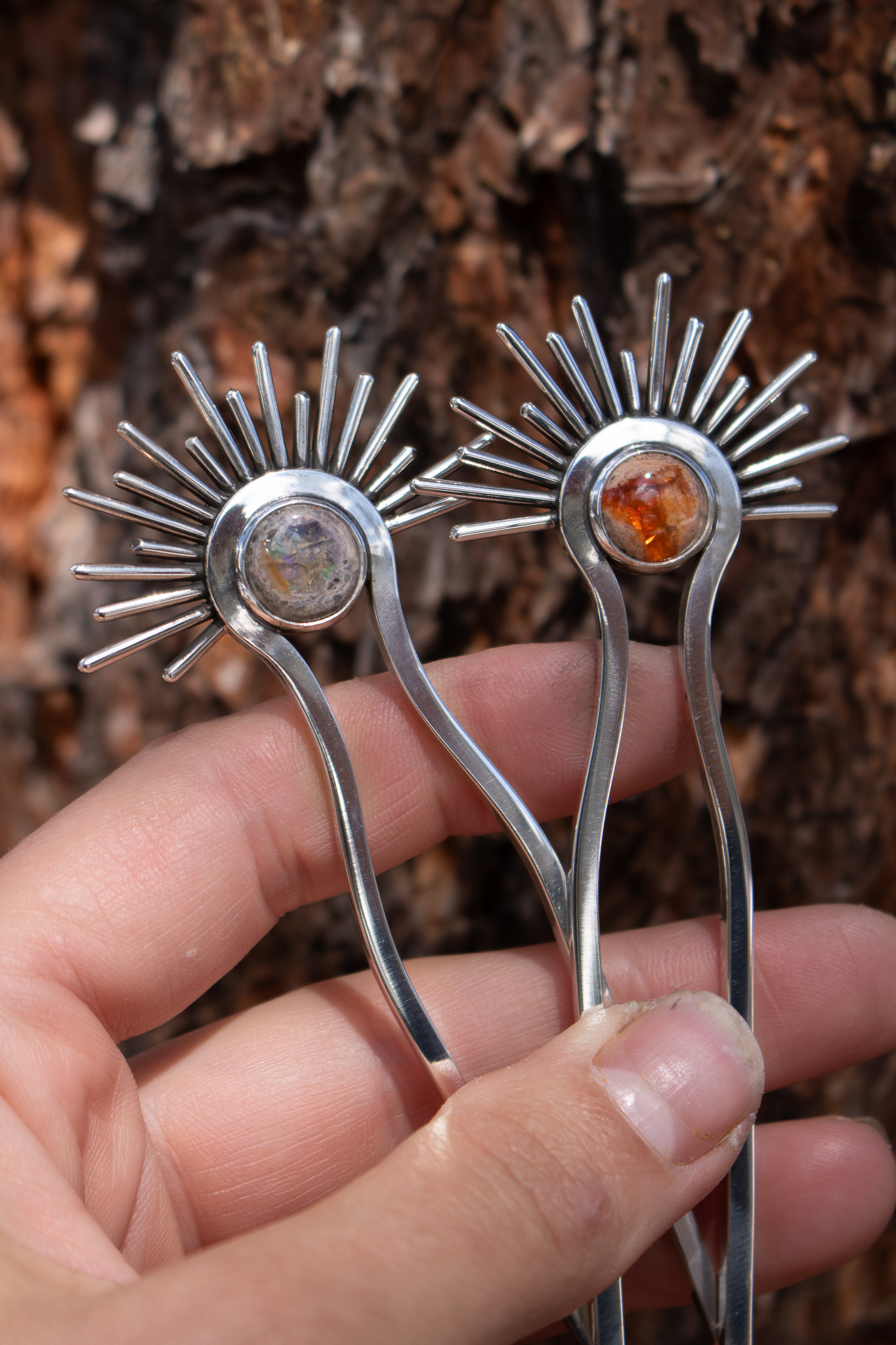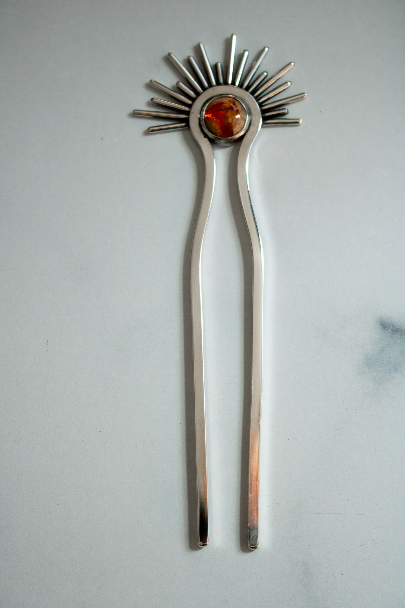 Each hairpin is hand formed and like its wearers, no two are exactly the same. This particular hair pin features lush and vibrant orange Mexican Fire Opal surrounded by a halo of hand cut and individually soldered sterling rays. Its then oxidized and then finished with a high shine polish and signature maker’s mark.