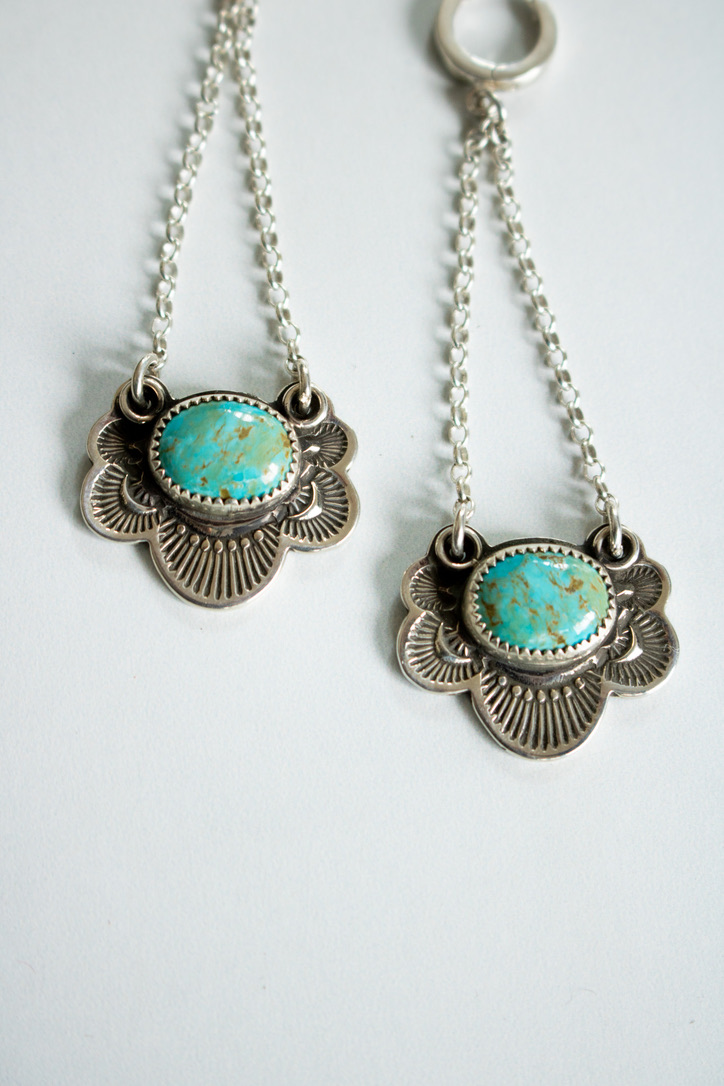 Verde Valley turquoise surrounded by stamped sterling silver and a handcrafted scalloped edge. The pendants are hung from a 20mm clipping huggie hoop with 1.5″ chains and are oxidized and finished with a high shine.