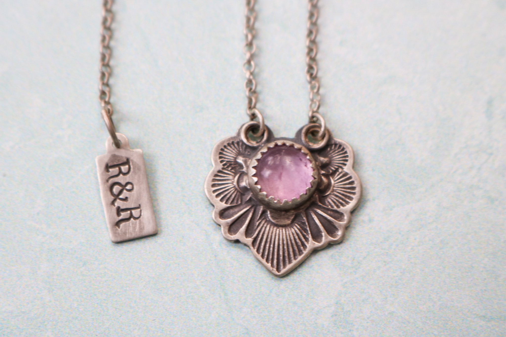 This sweet pendant is named for the last full moon in spring. The flower moon rises in May and brings a soft glow to the last of the bright spring flowers. Amethyst stone with a serrated bezel, set on sterling silver pendant and surrounded by hand stamped detail. Oxidized and given with a soft satin finish. Hung from a sterling chain with 16” and 18” length settings for layering or stand-alone wear. Hand stamped R&R retail at the clasp.