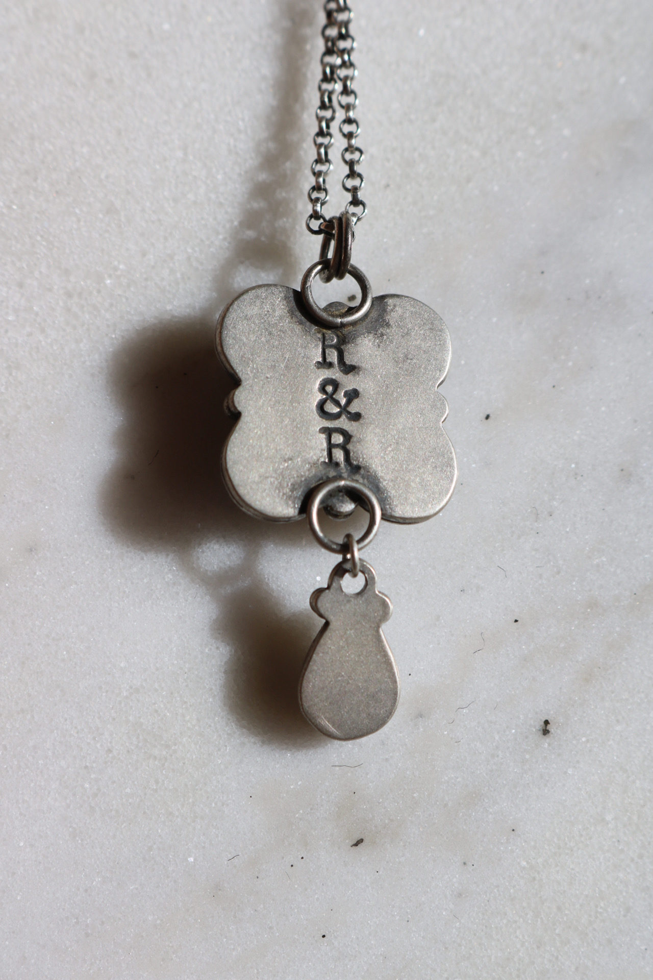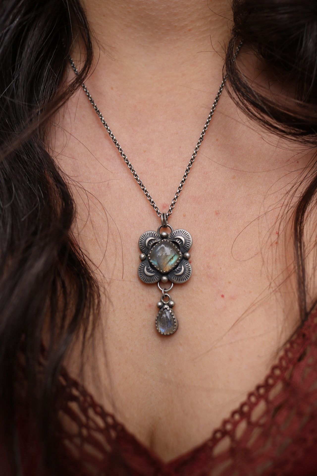 A green flashing labradorite surrounded by raised stamped work and a handcut scalloped edge. A smaller blue labradorite hangs beneath the larger pendant to add an extra touch of magic. The back features a small R&R signature and a small galaxy of stars. Finished with a satin shine and hung from an 18″ chain. All components are sterling silver.