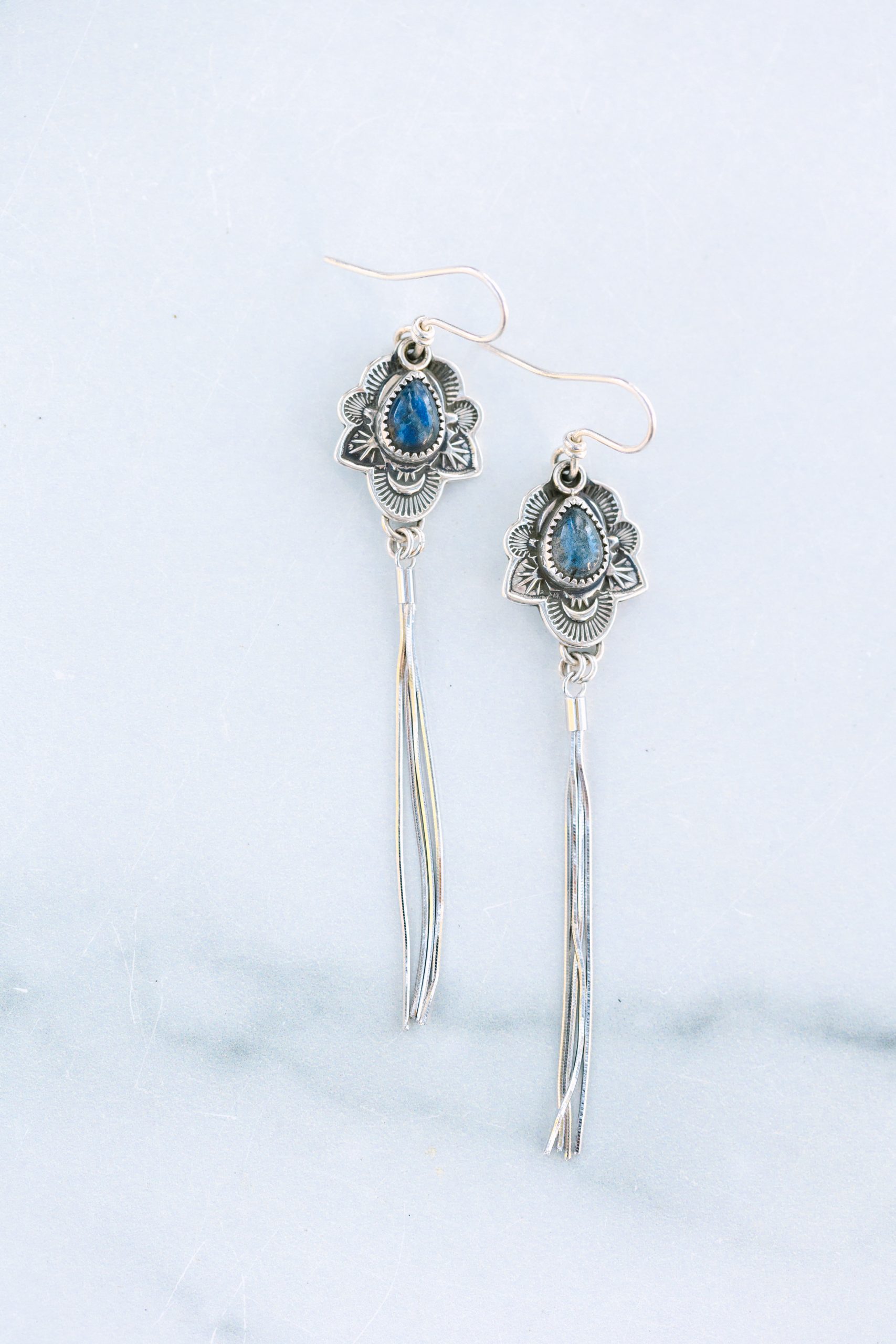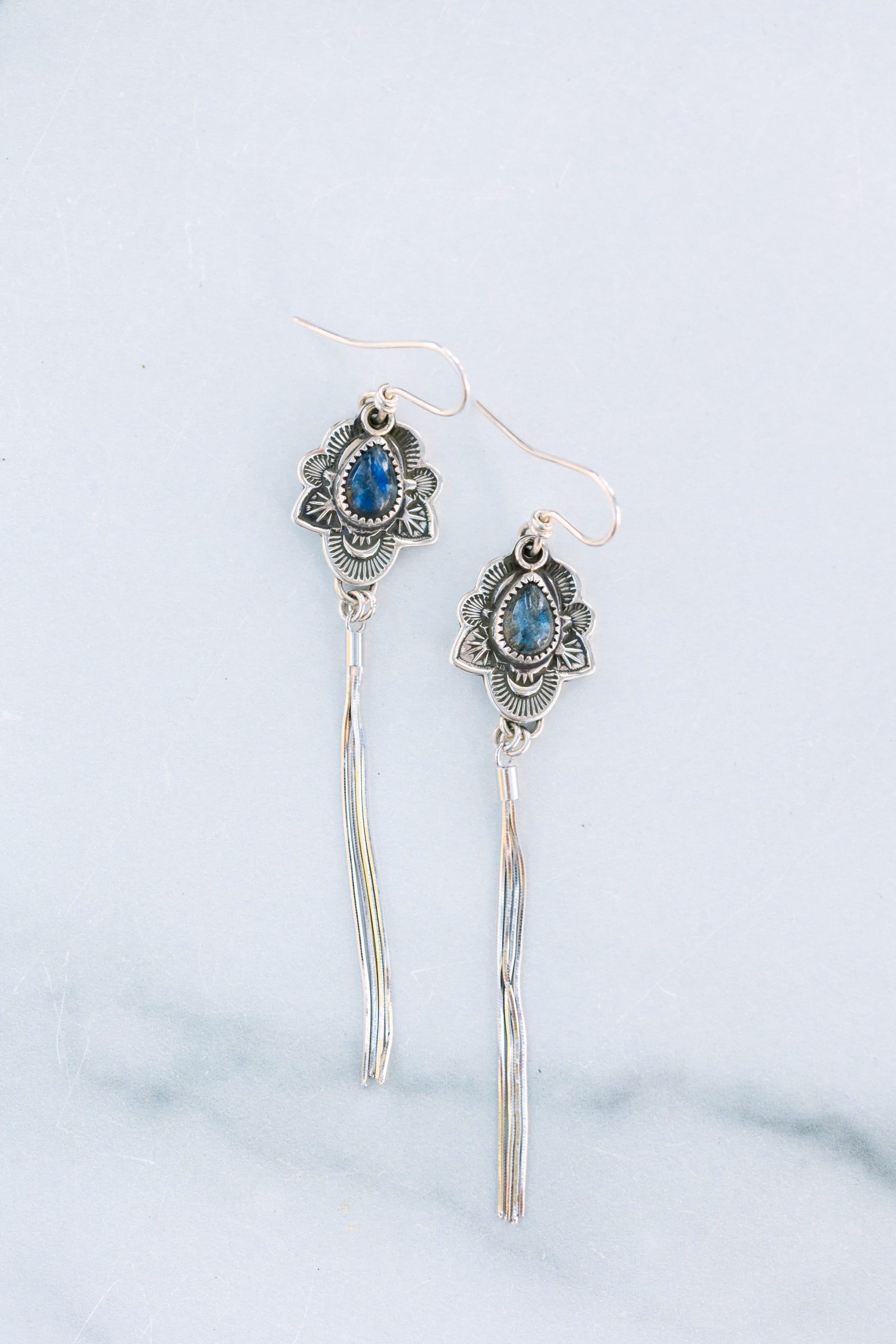 Hand stamped sterling silver surrounding flashing pieces of labradorite and finished with a handcrafted scalloped edge. Attached to the central pendant are 4 strands of sterling silver chain to create a gorgeous fringe. The earrings measure 4′ from the top of the ear wire to the bottom of the pendant. Oxidized and finished with a high shine.