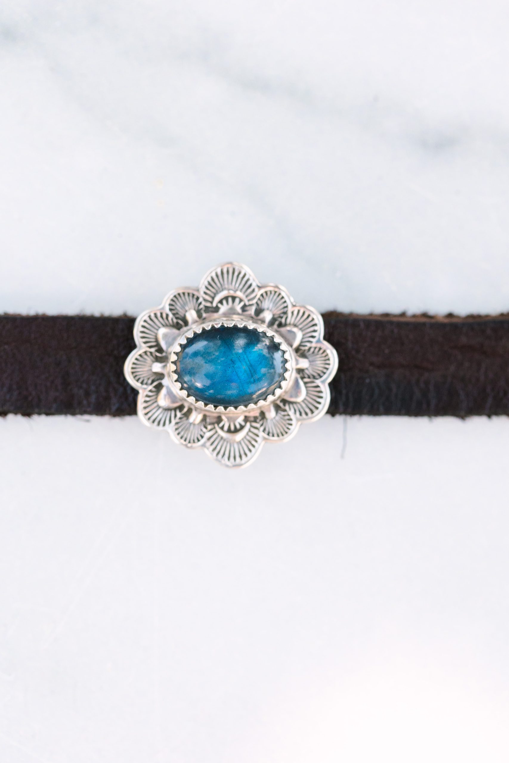 This choker features a gorgeous piece of labradorite with blue flash surrounded by hand stamped detail. Its then give a scalloped edge and finished with a dark oxidation and high shine finish. There is a markers mark on the back of the central pendant as well. The whole thing is strung on a piece of chocolate brown bison leather with a button closure.