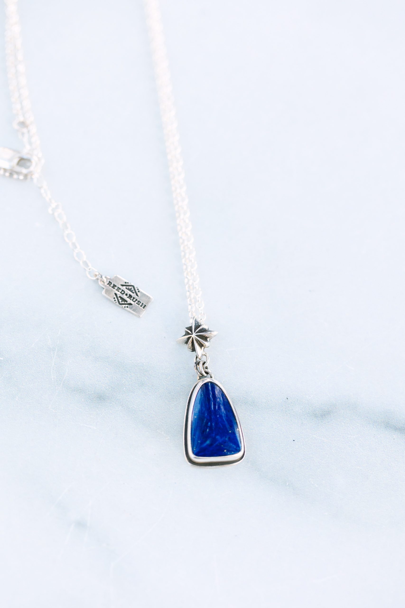 Velaris is the fictional city of starlight and I wanted to make something that embodied that feeling of being transported to a magical new place. How better to do that than with a little starlight portal into the night sky? This pendant features a richly colored piece of lapis that’s framed with sterling silver and finished with a high shine and markers mark on the back. It hangs from a oval rolo chain that’s 20-22″ adjustable.