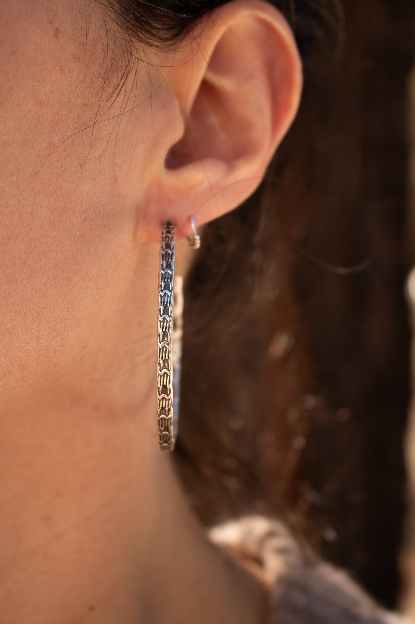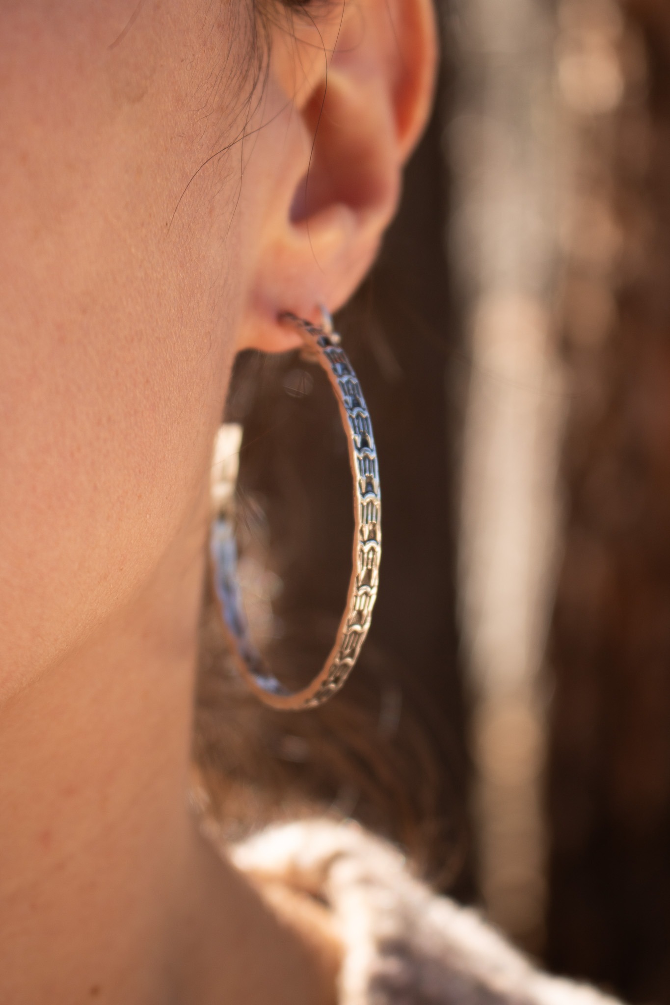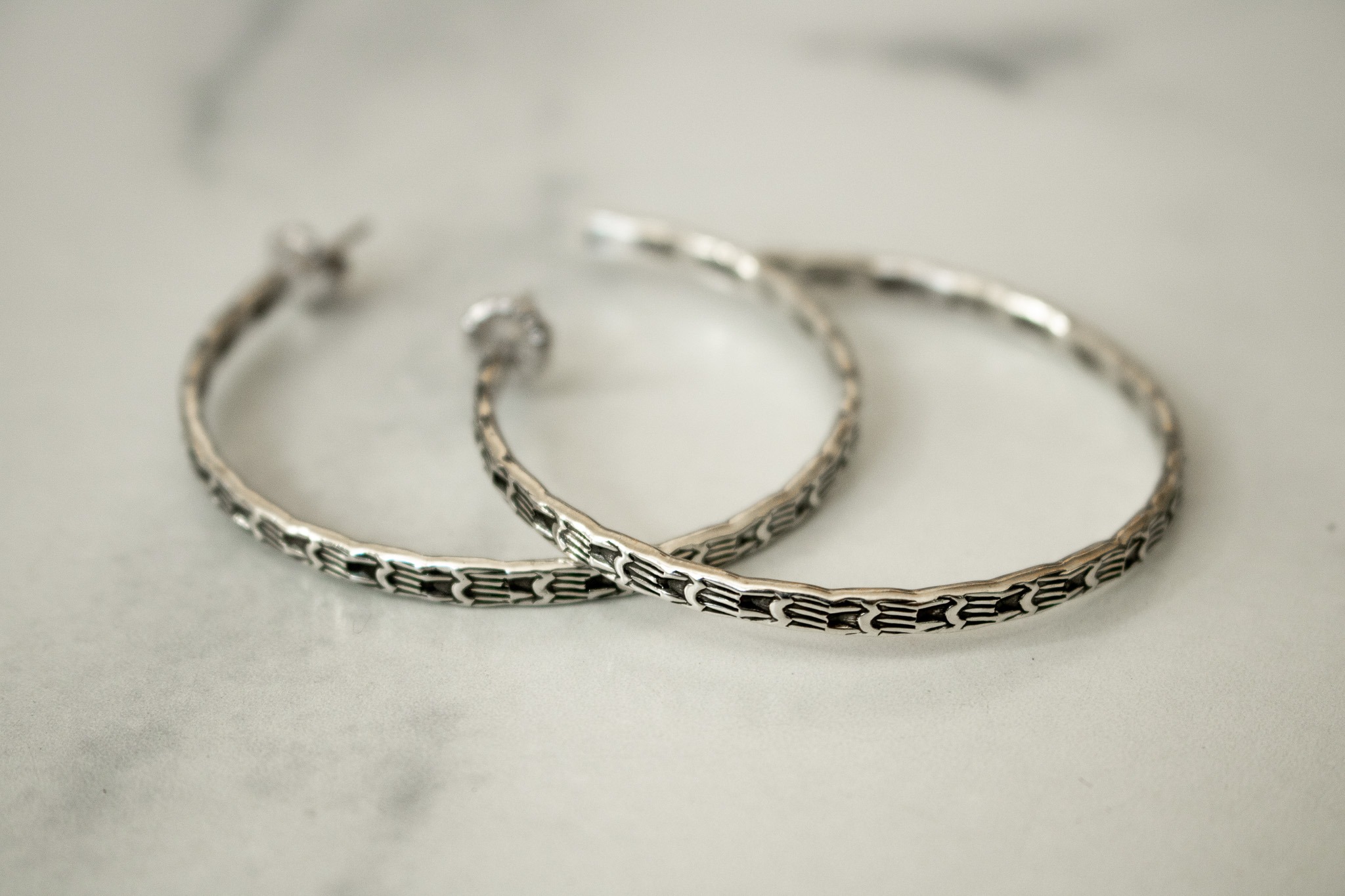 I love these stamped hoops. The big sister to my smaller version, they are here when you want to subtly make a little more of a statement. They start out as 10g full round wire that I flatten out and then hand stamp. They’re then given a post, shaped into a hoop and then finished with a round of oxidation and high shine polish. They include a larger sterling silver ear nut for extra security and comfort.
