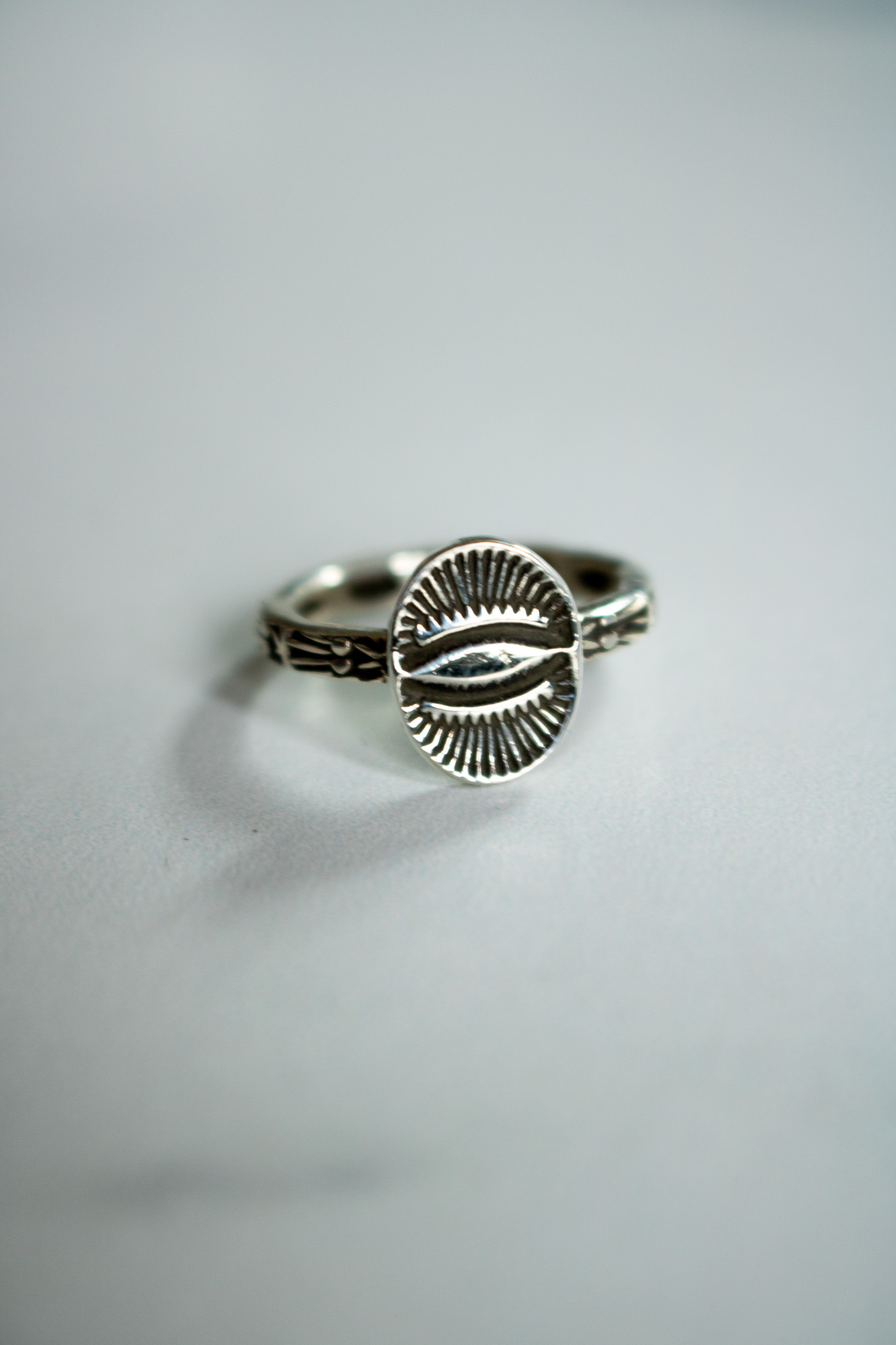 Lucky charm rings started as a joyful side quest one winter afternoon when I let my mind wonder and my creativity steer the ship. The central pendant starts as sterling silver scrap that I melt down and reform into sheet. I then hand stamp it, saw it out and then solder it to a stamped sterling stacker band. These rings are oxidized and given a high shine polish.