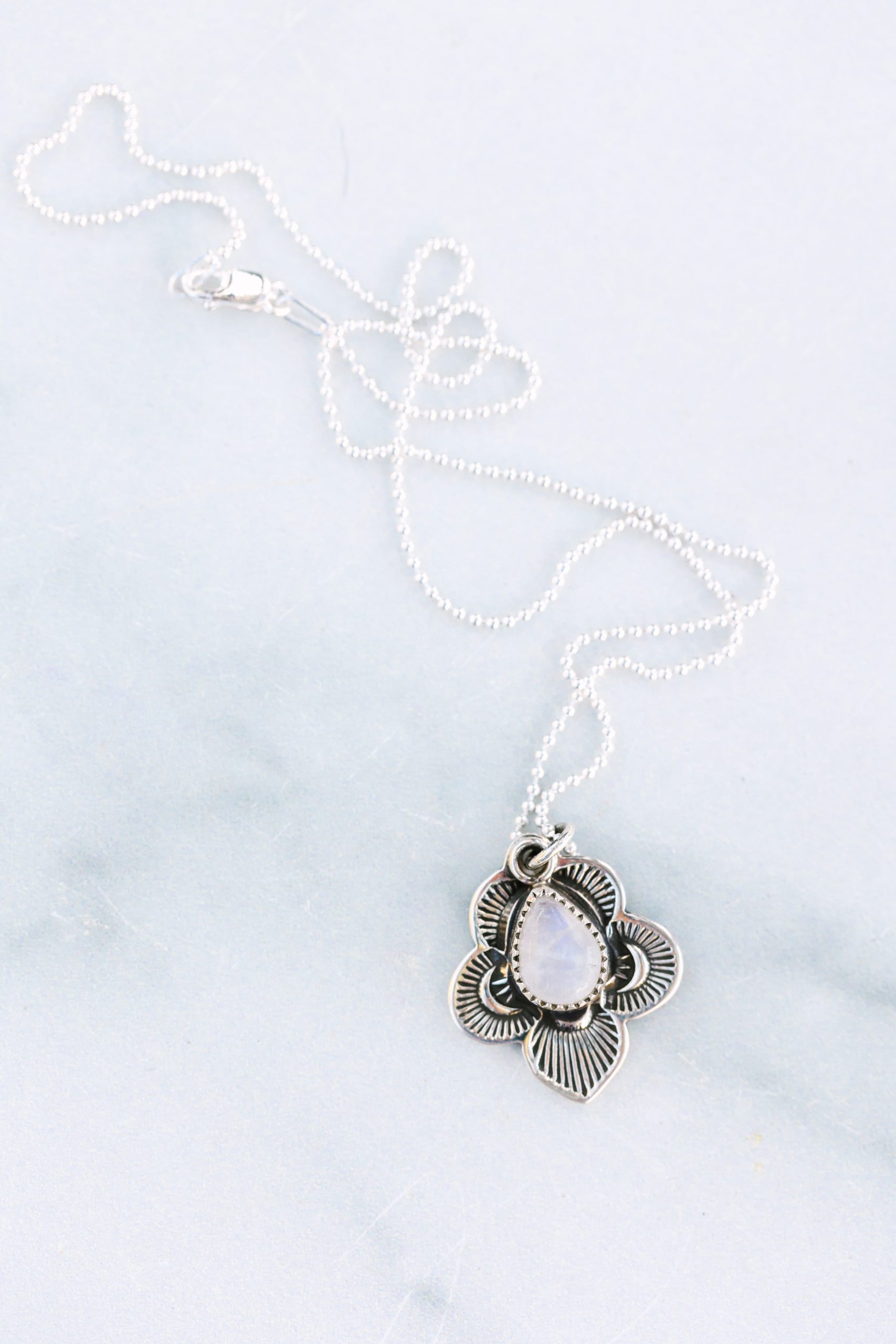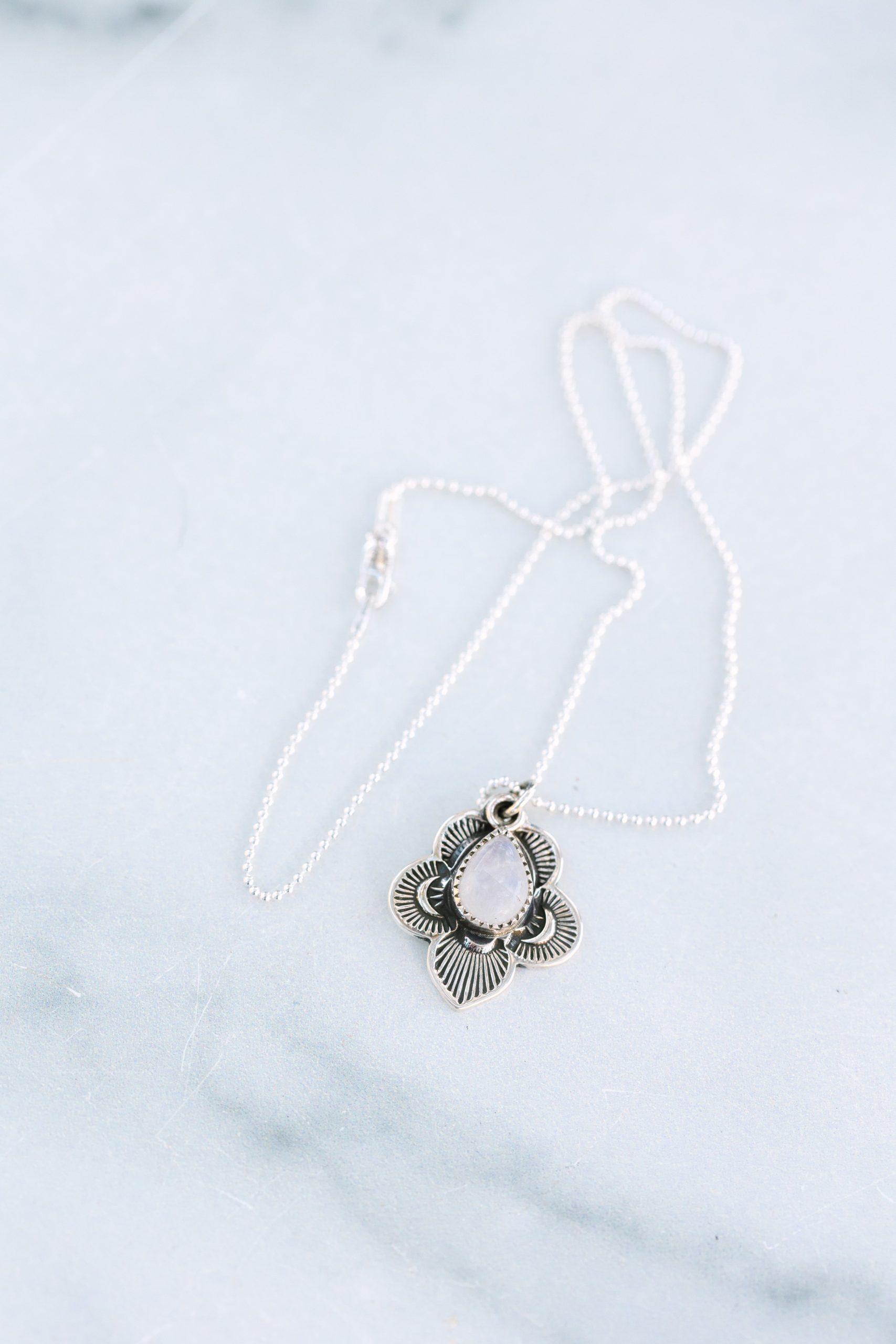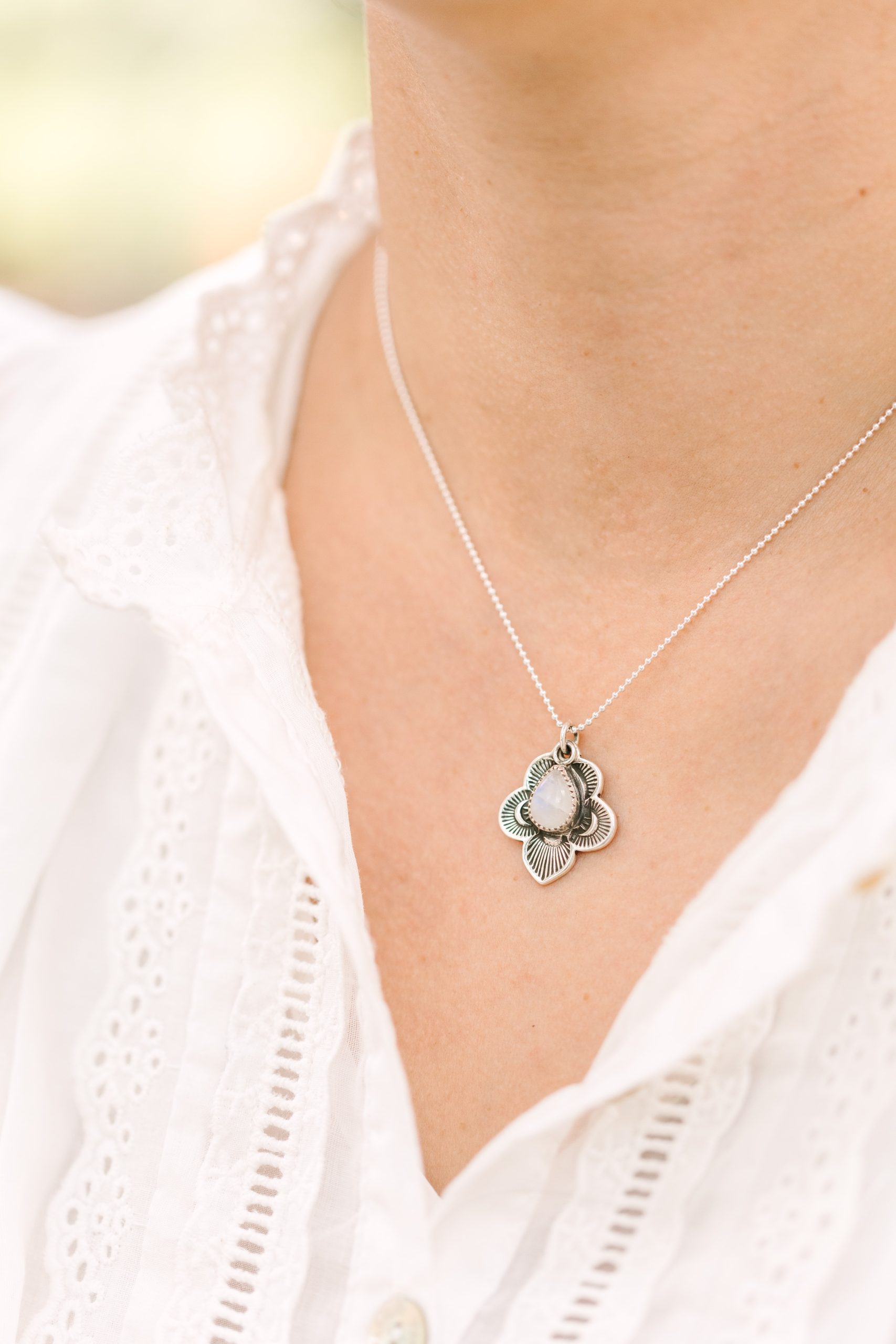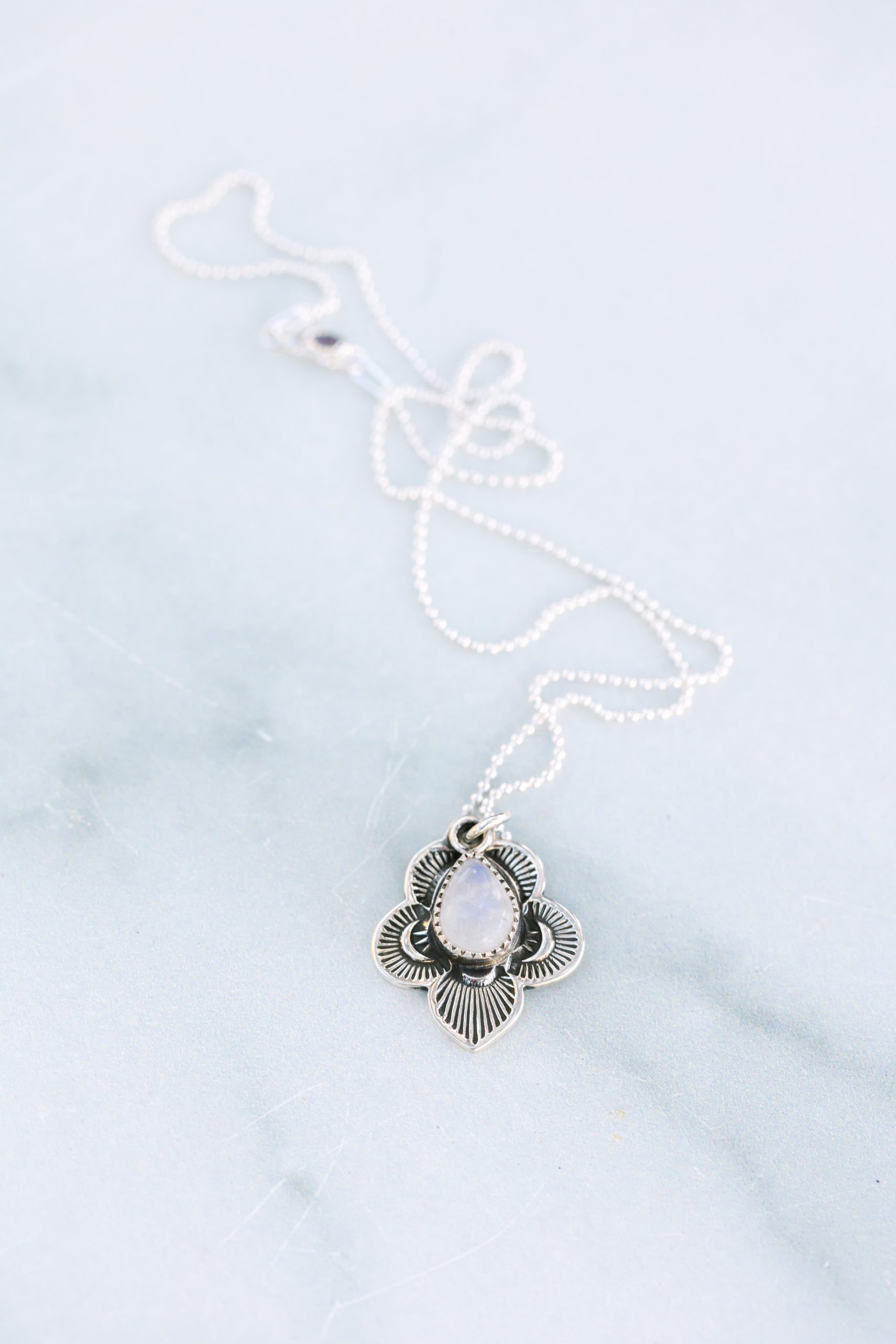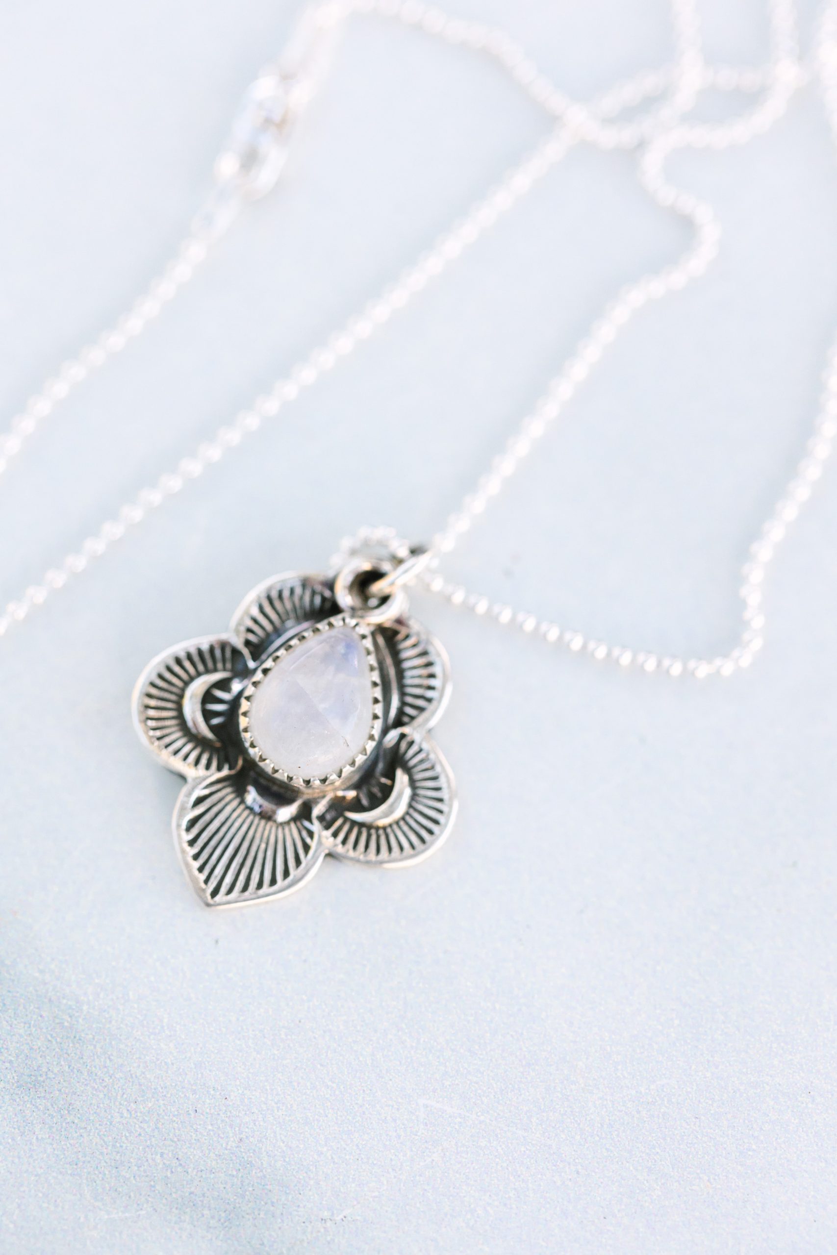 This one features flashing rainbow moonstone by hand stamped sterling silver and a handcrafted scalloped edge. Its then oxidized to highlight the details and finished with a high shine finish and given R&R makers mark at the clasp. The pendant is available with a 16″ or 18″ ball chain. Please note your chain length choice in your order comments.
