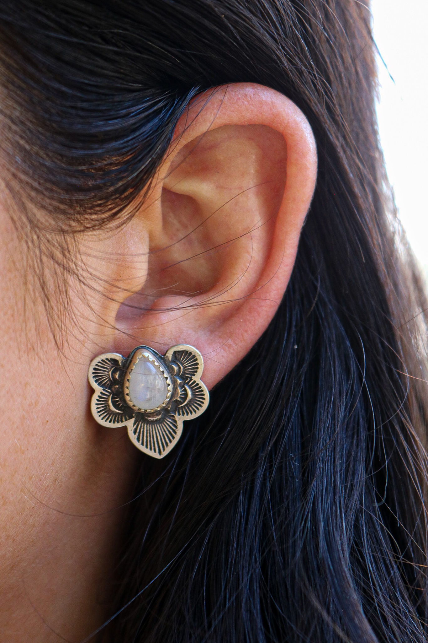Hand stamped sterling silver surrounding moonstone teardrops and given a handcrafted scalloped edge. Oxidized and finished with a soft matte finish. The studs measure 3/4″ and all components are sterling silver.