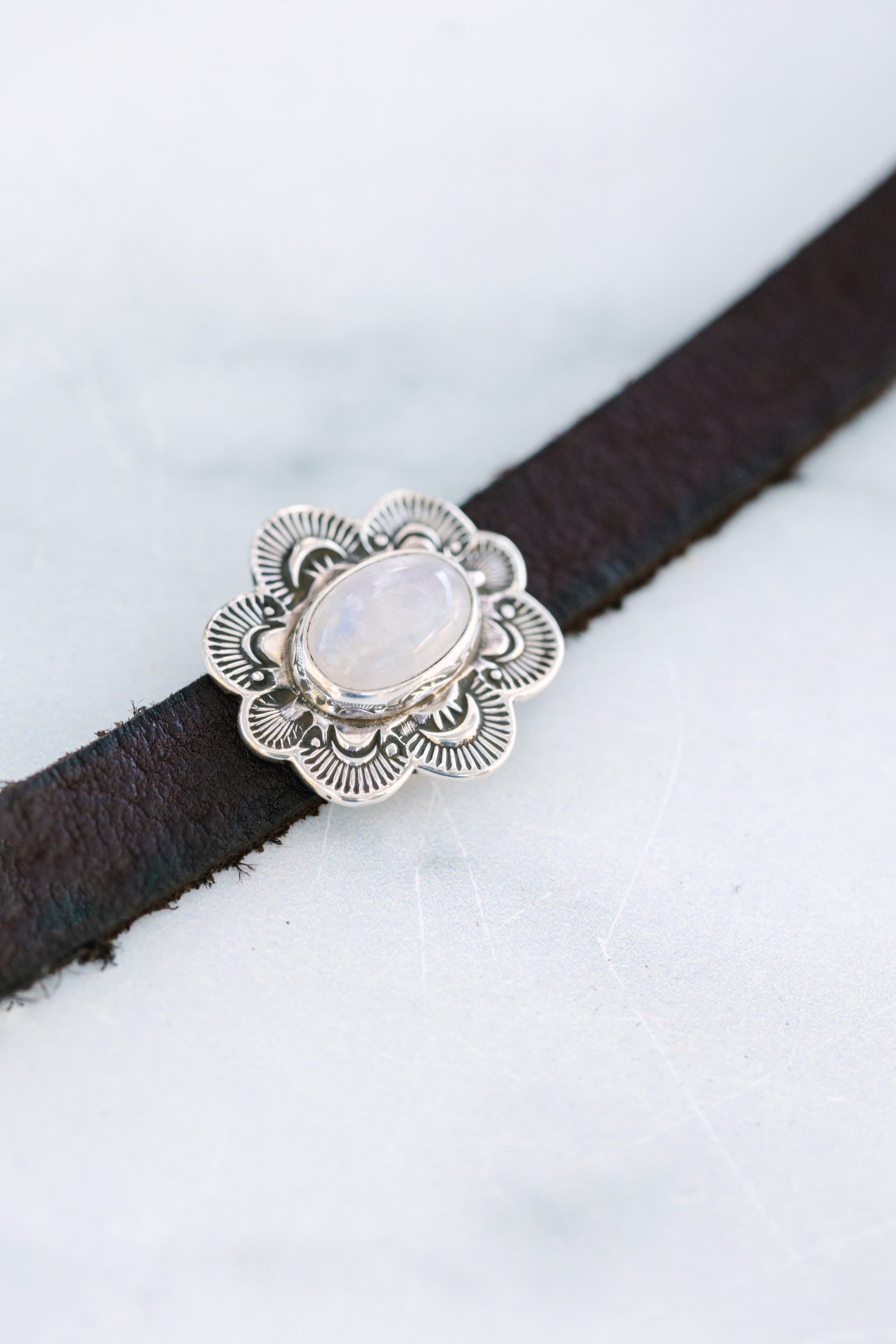 This choker features a gorgeous piece of rainbow moonstone surrounded by hand stamped detail. Its then give a scalloped edge and finished with a dark oxidation and high shine finish. There is a markers mark on the back of the central pendant as well. The whole thing is strung on a piece of chocolate brown bison leather with a button closure.