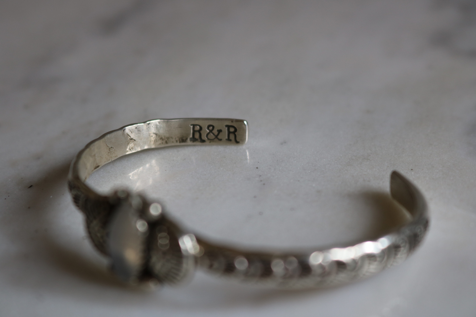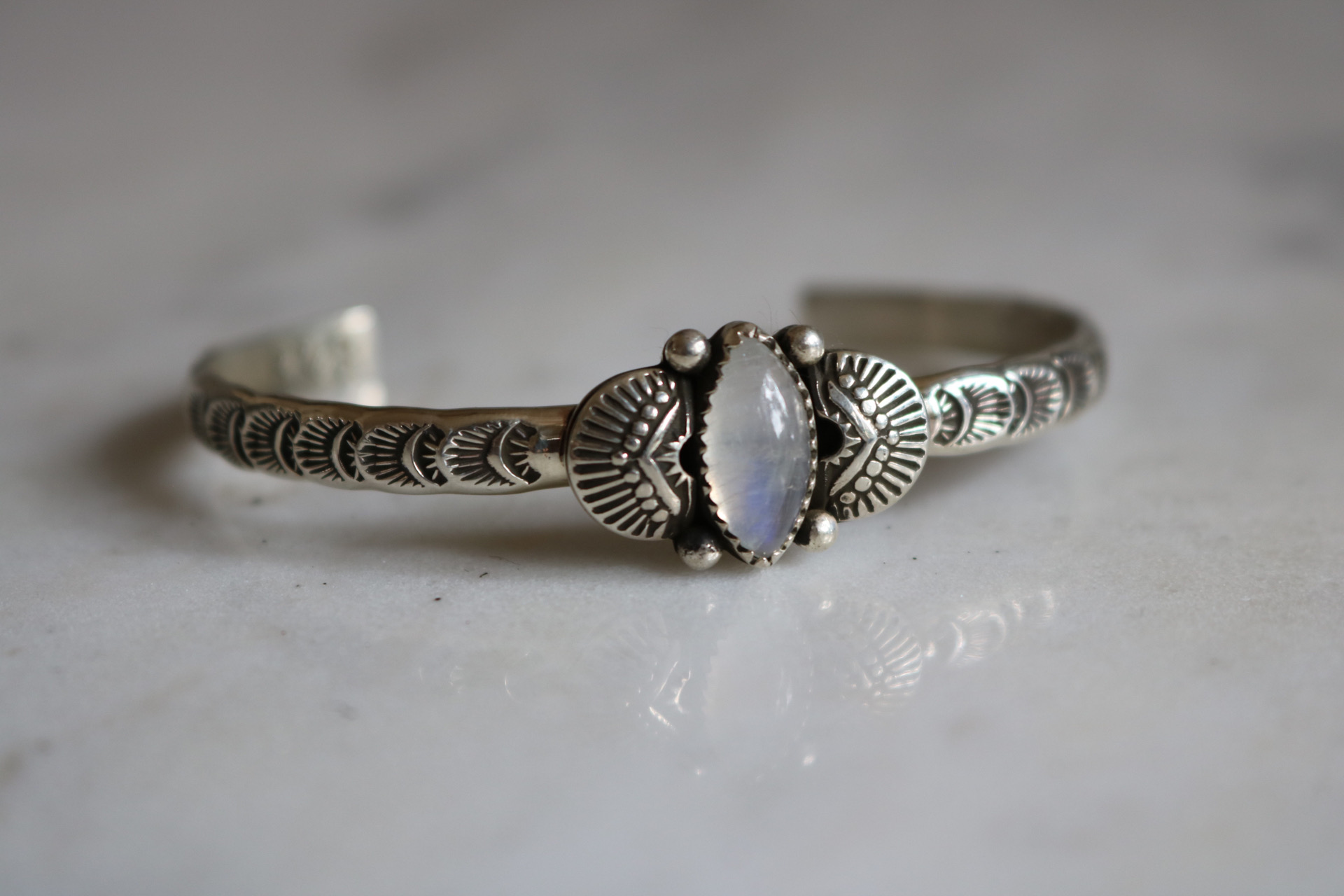 A blue flashing moonstone set on a hand stamped sterling cuff. The stone is flanked by a set of raised stamp work to further emphasize the stone. Oxidized and finished with a high shine. 5.5″ long but can be sized down upon request.