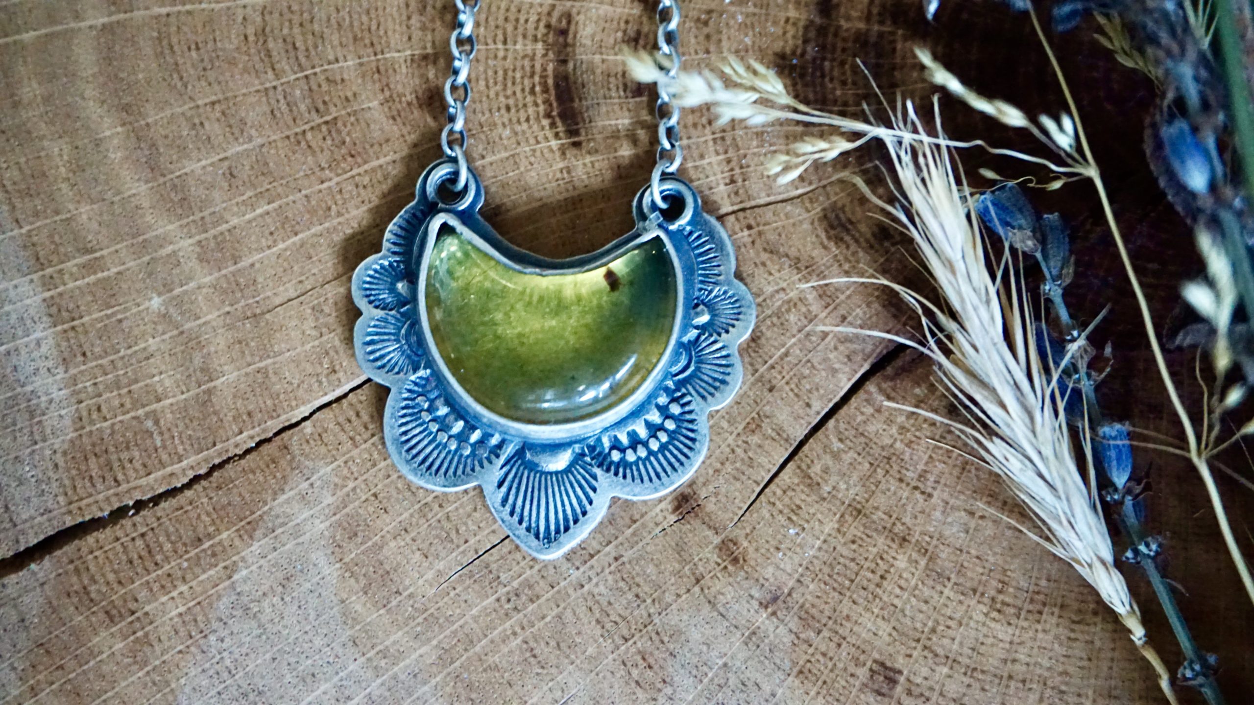 Handstamped moon pendant with Mexican Amber on an adjustable 16″-18″ chain. Given a soft satin finish with a makers mark at the clasp.