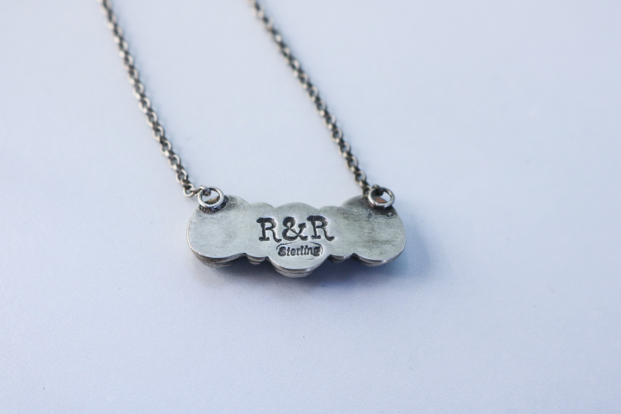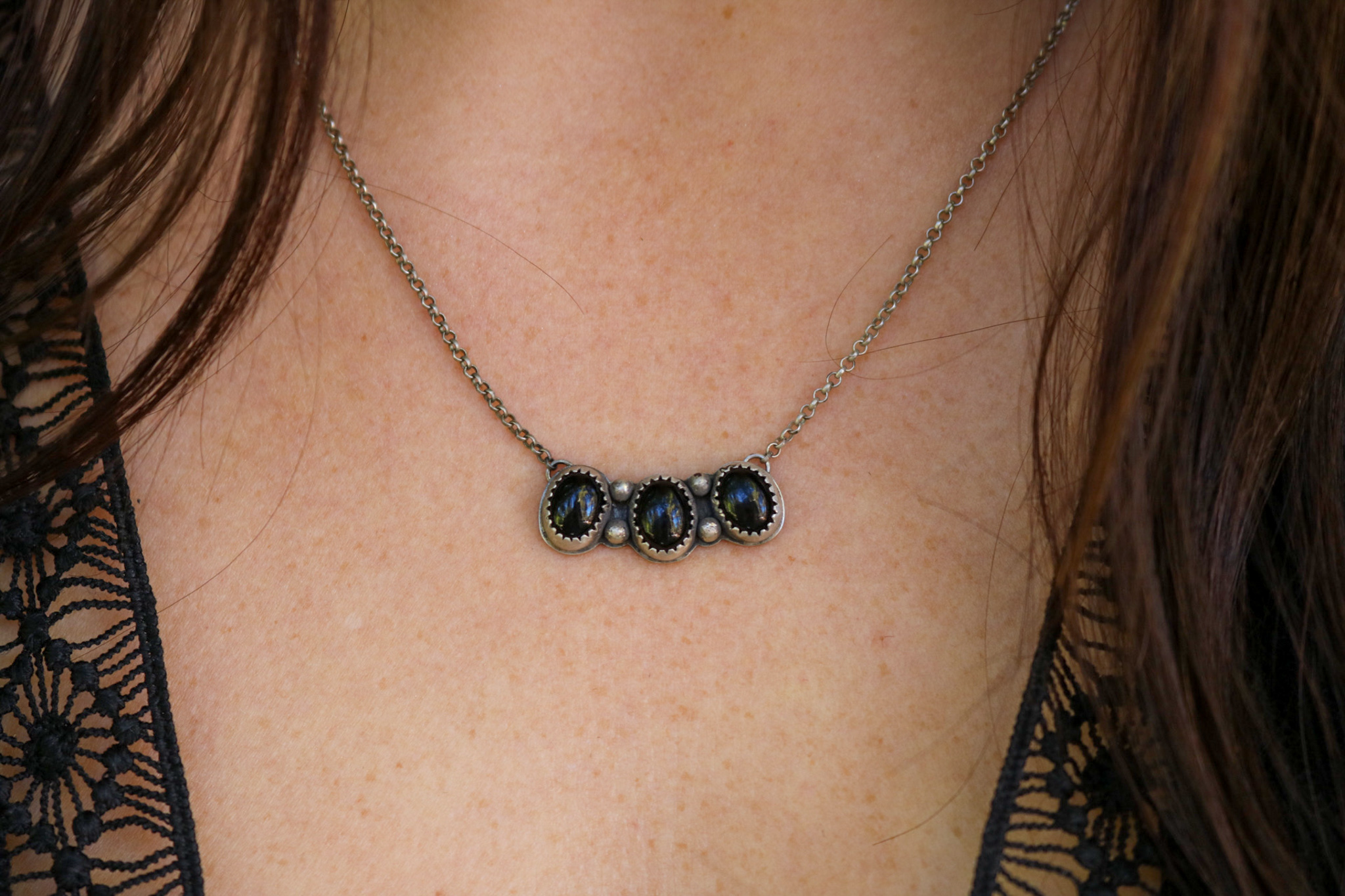 Black onyx stone pendant with bead and serrated bezel details on a 16-18″ adjustable chain. Oxidized and given a soft satin finish with a makers mark on the back of the pendant. Finished with a pear repousee charm at the clasp. All components are sterling silver.