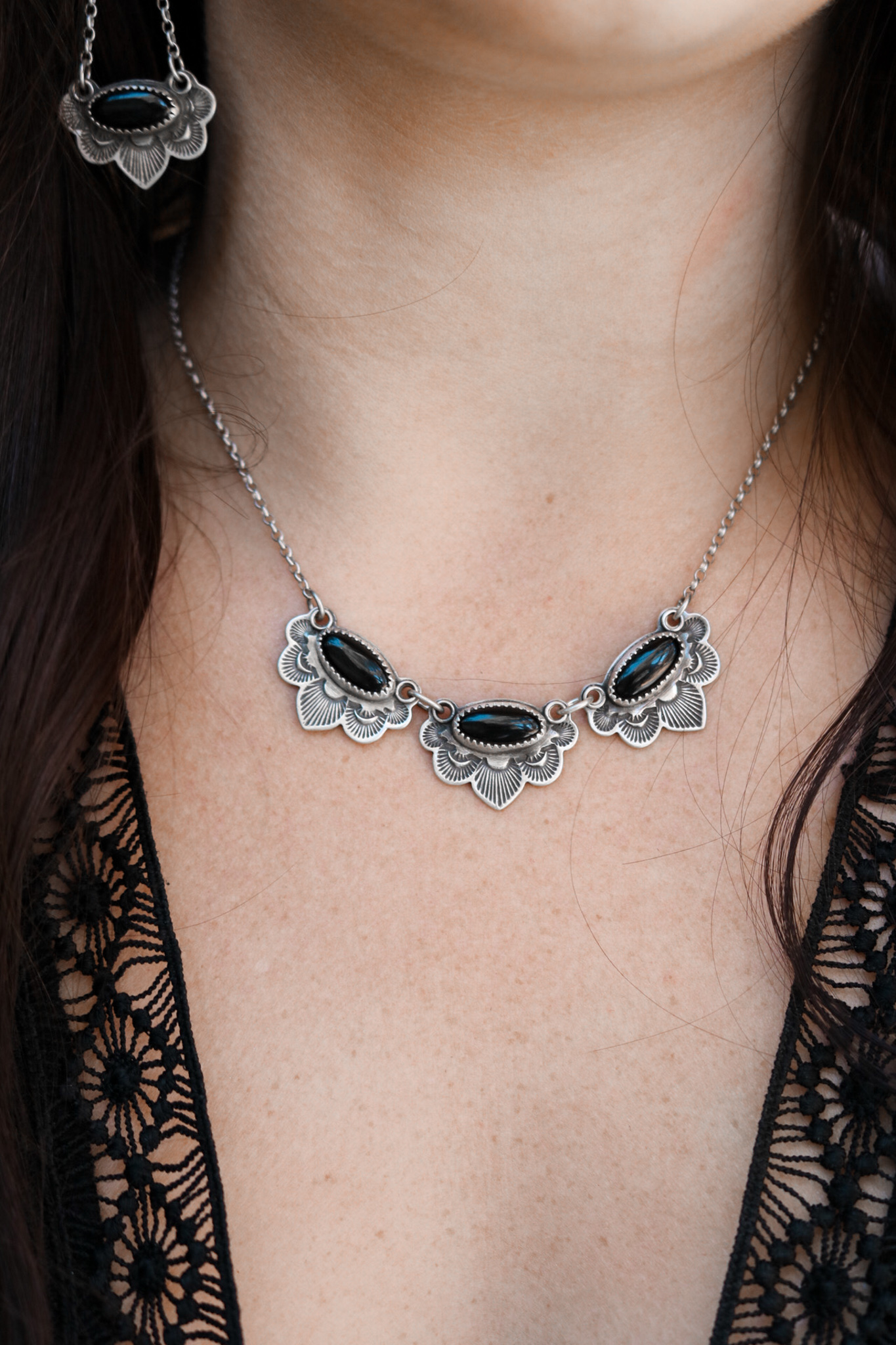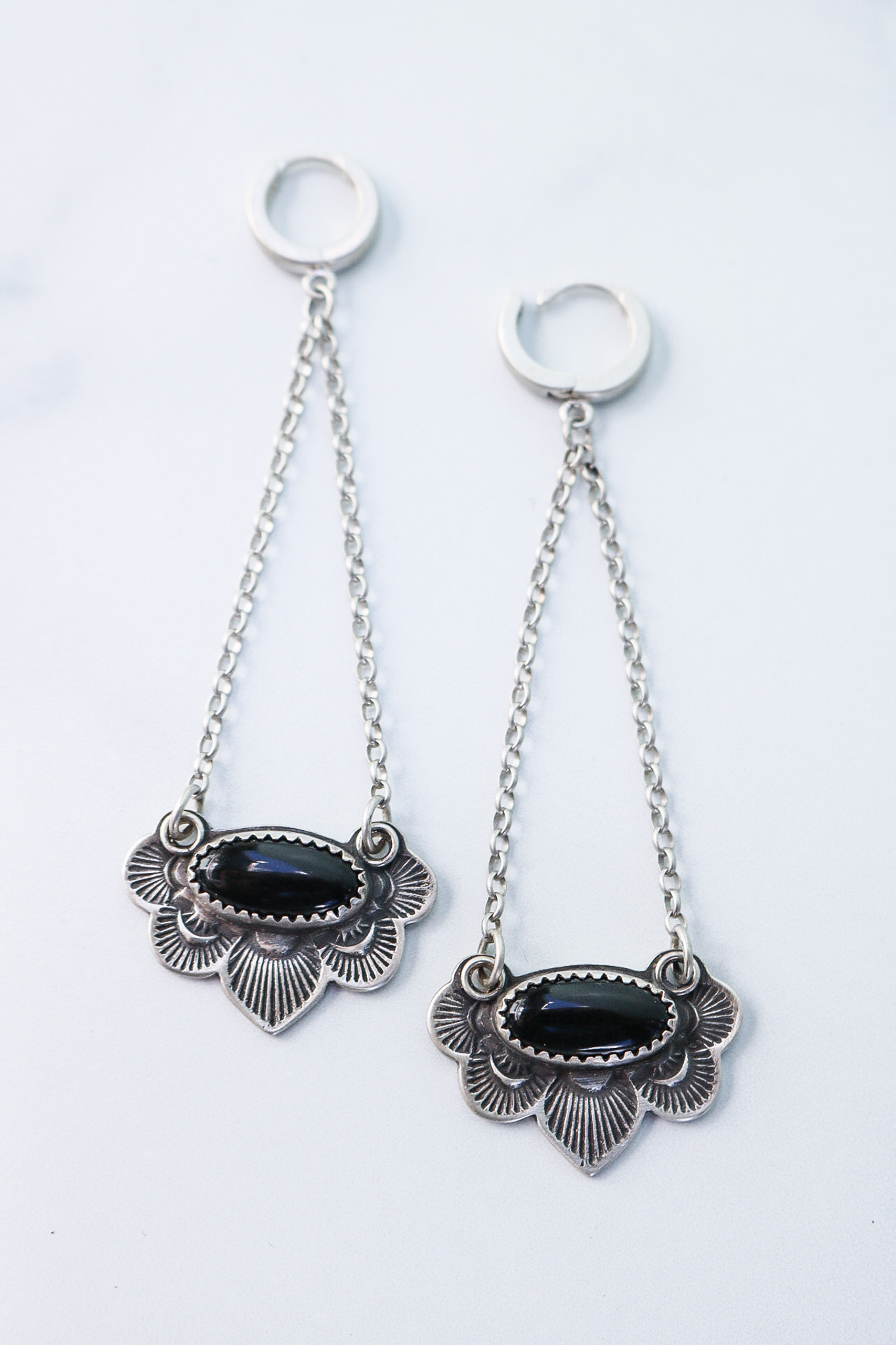 Deep black onyx stones surrounded by stamped sterling silver and a handcrafted scalloped edge. Hung from a 12mm hinged hoop, oxidized and finished with a soft matte finish. The main pendants measure just over an inch wide and 3/4″ high. The hinged hoops clip shut and are perfect for all types of piercing including gauged and stretched. All components are sterling silver.