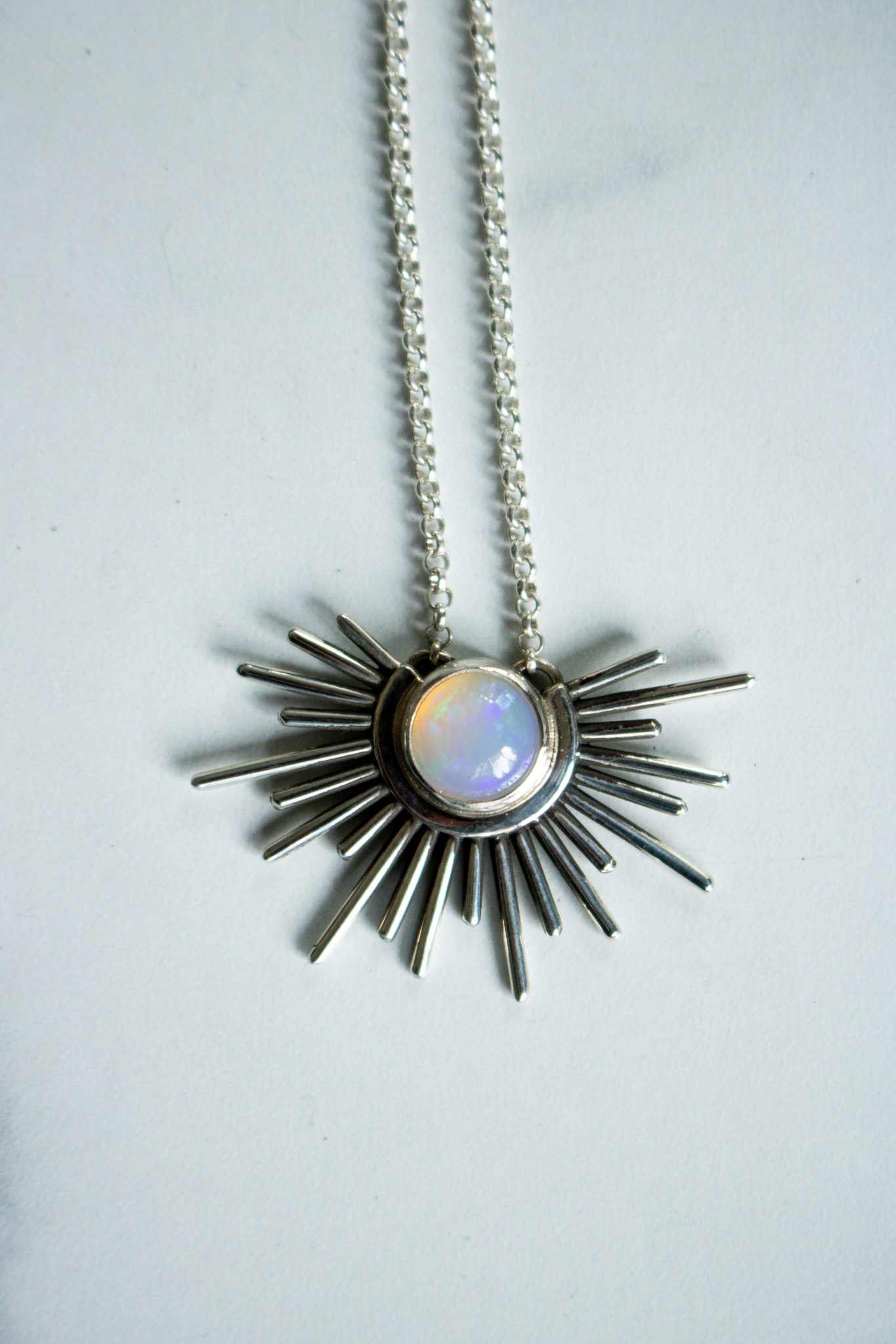 This pendant features brilliant Ethiopian Opal surrounded by hand cut sterling rays. It’s hung from 2mm sterling silver rolo chain and the whole necklace measures 16-18″ long. Finished with a R+R signature tag and a high polish shine.