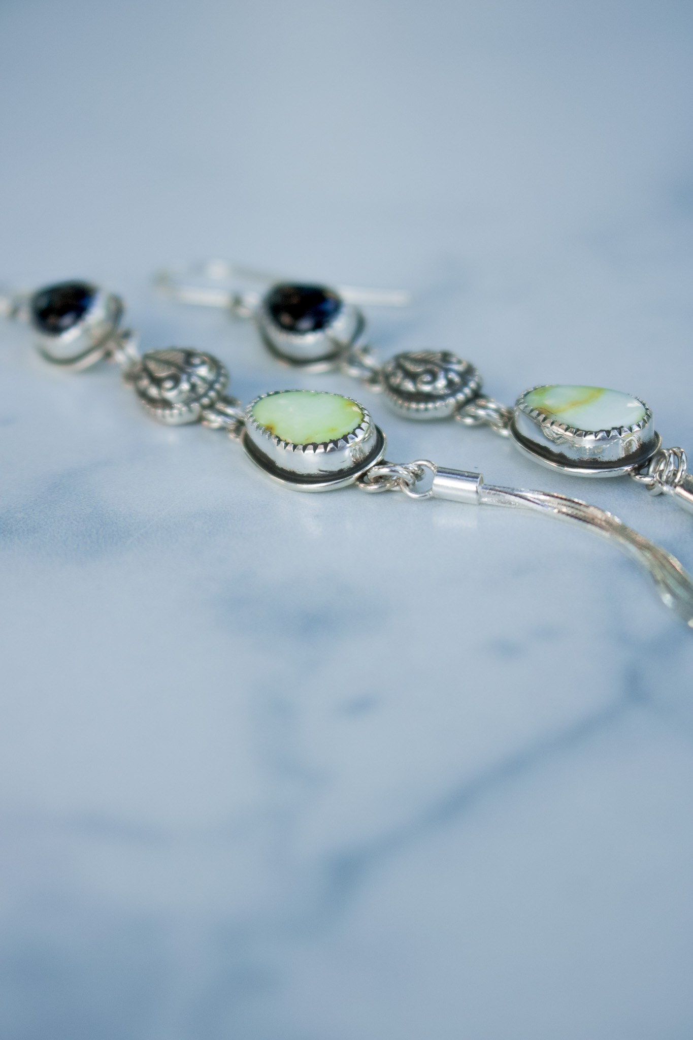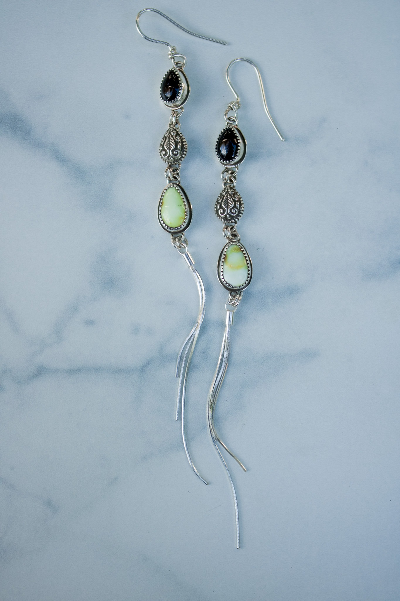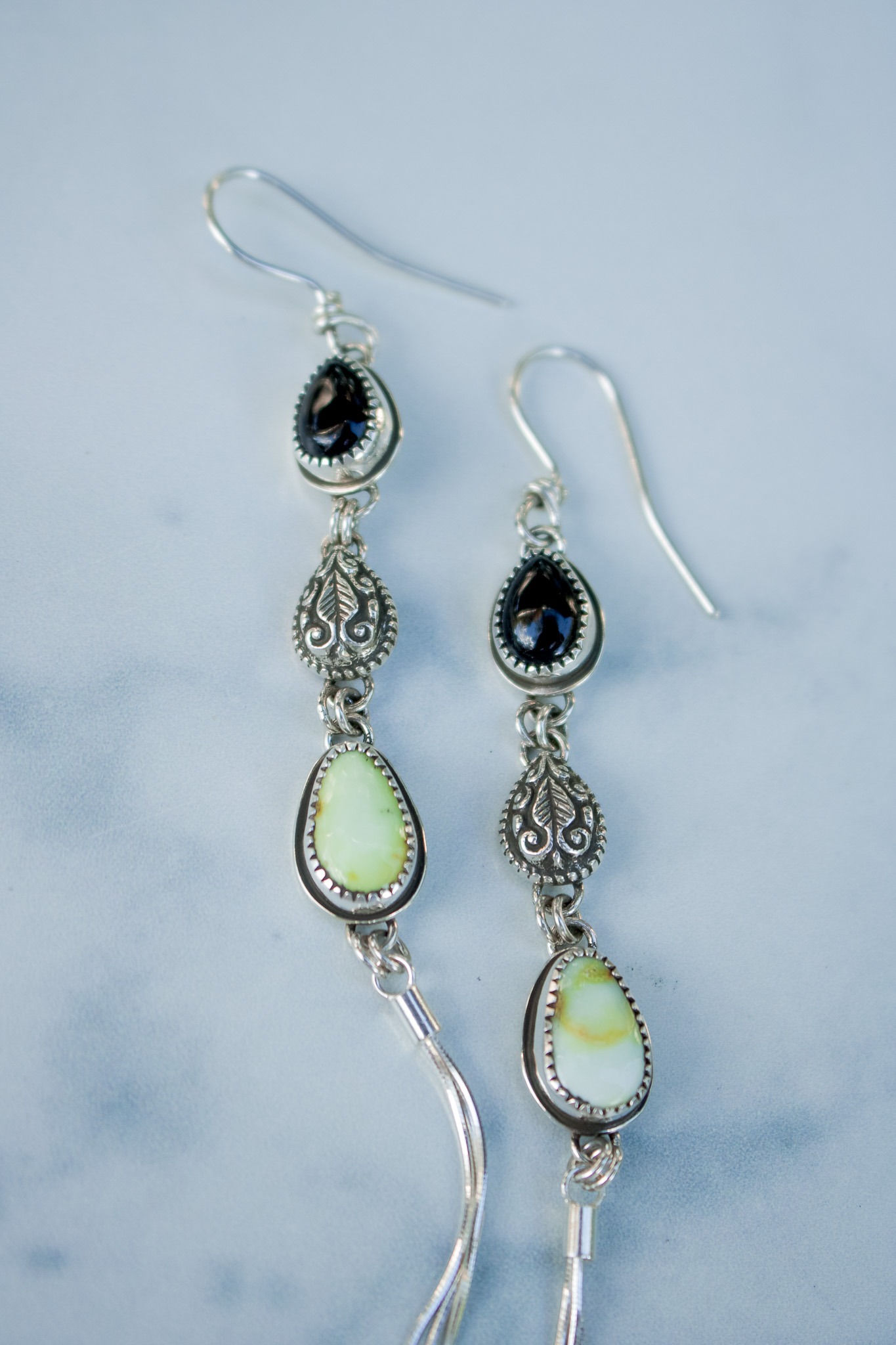 A hand hammered Indian paisley teardrop hangs between Palomino turquoise and onyx stones. Hanging from the central pendants are 3 strands of sterling silver chain to create a gorgeous fringe. The earrings measure 5.75″ from the top of the earwire to the bottom of the pendant. Oxidized and finished with a high shine.