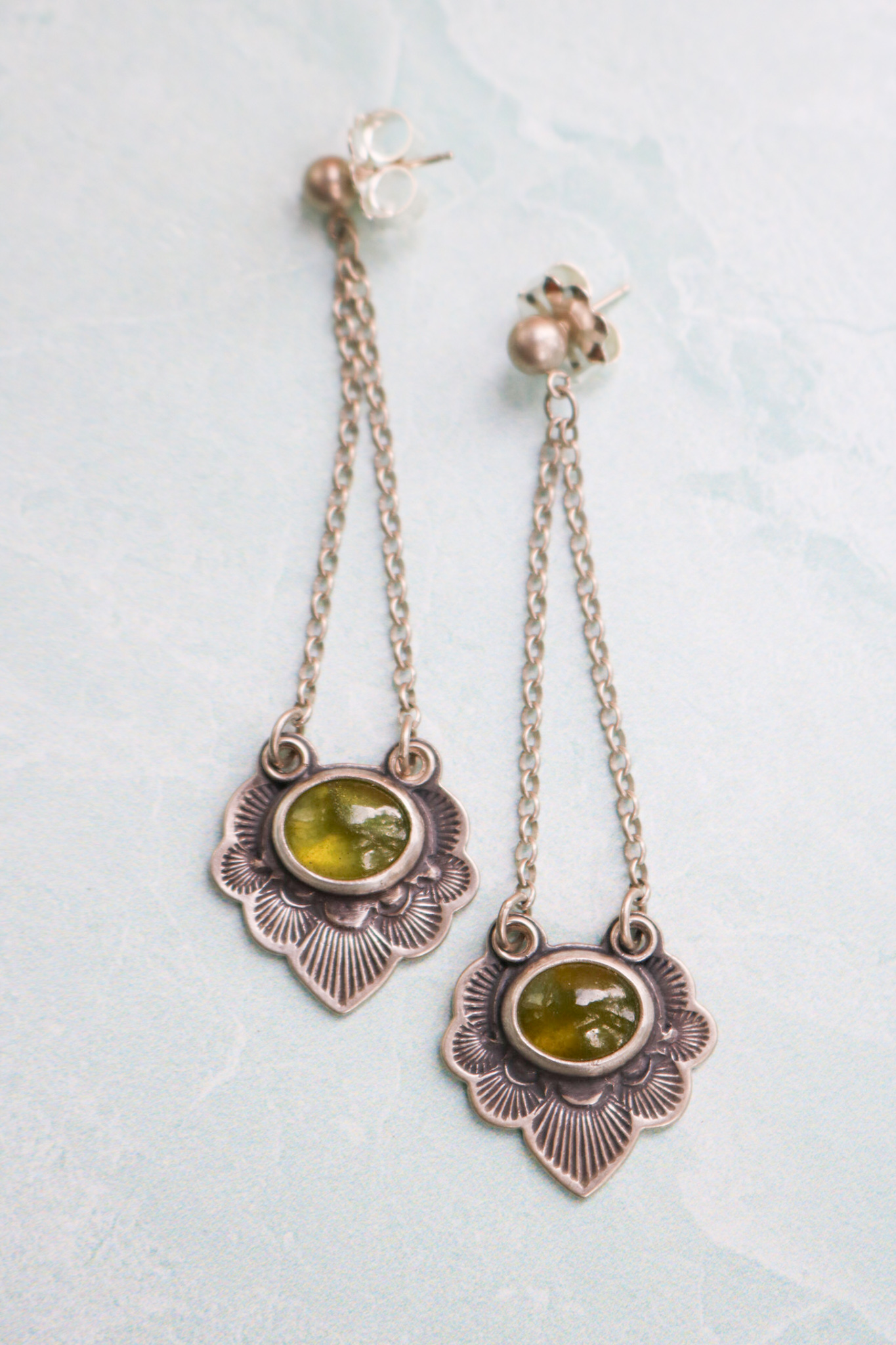 Vibrant peridot stones surrounded by stamped sterling silver and a handcrafted scalloped edge. Hung from a ball post with 1 1’2″ chains, oxidized and finished with a soft matte finish. The main pendants measure just under an inch wide and across. The earrings come with large ear nuts to keep these lightweight hoop secure and all components are sterling silver.