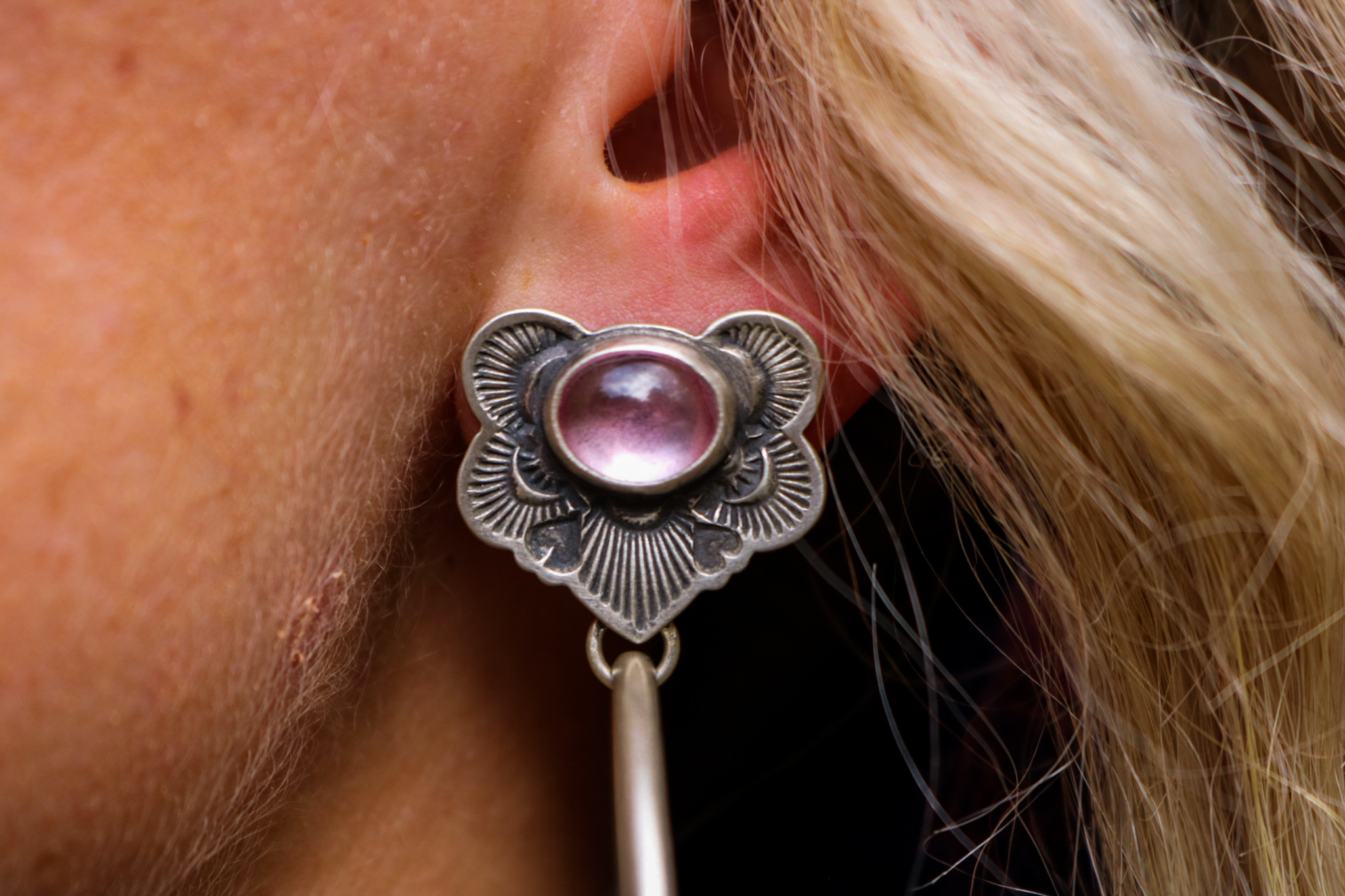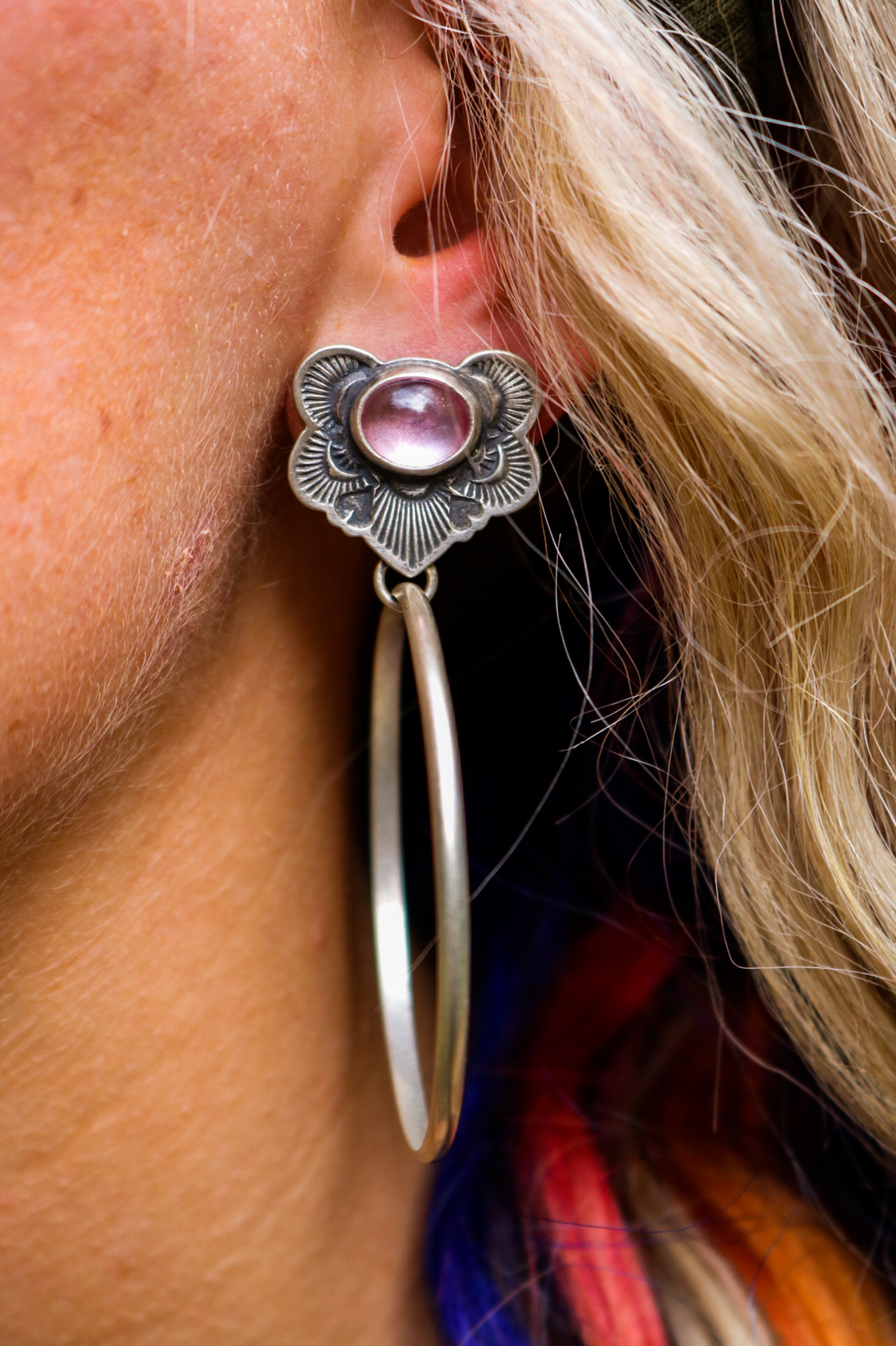 Glowing pink topaz stones surrounded by stamped sterling silver and a handcrafted scalloped edge. The main stud measures just under 1″ wide and 1/2″ tall and supports a 2” hoop made with half round wire. Oxidized and finished with a soft matte finish. The earrings come with large ear nuts to keep these lightweight hoops secure and all components are sterling silver.