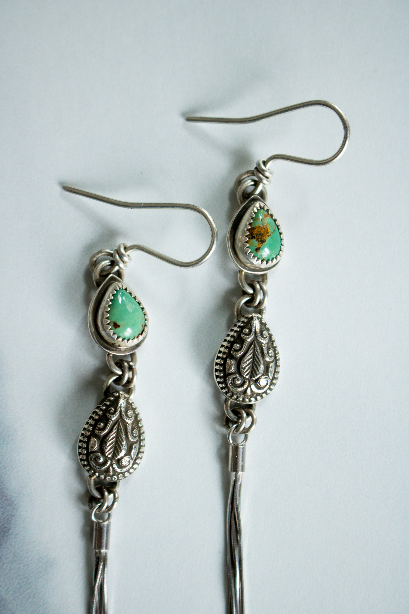 Kingman turquoise surrounded by a serrated bezel and attached to a hand hammered Indian paisley teardrop. Hanging from the central pendants are 4 strands of 2.5″ sterling silver chain to create a gorgeous fringe. The earrings measure 4.5″ from the top of the earwire to the bottom of the pendant. Oxidized and finished with a high shine.