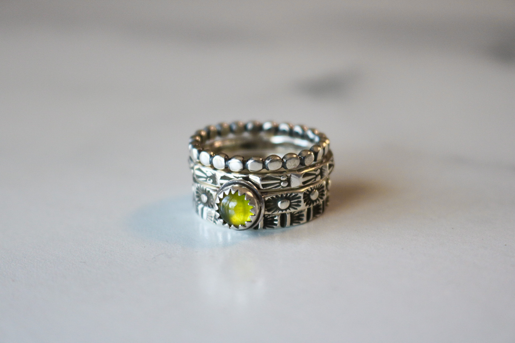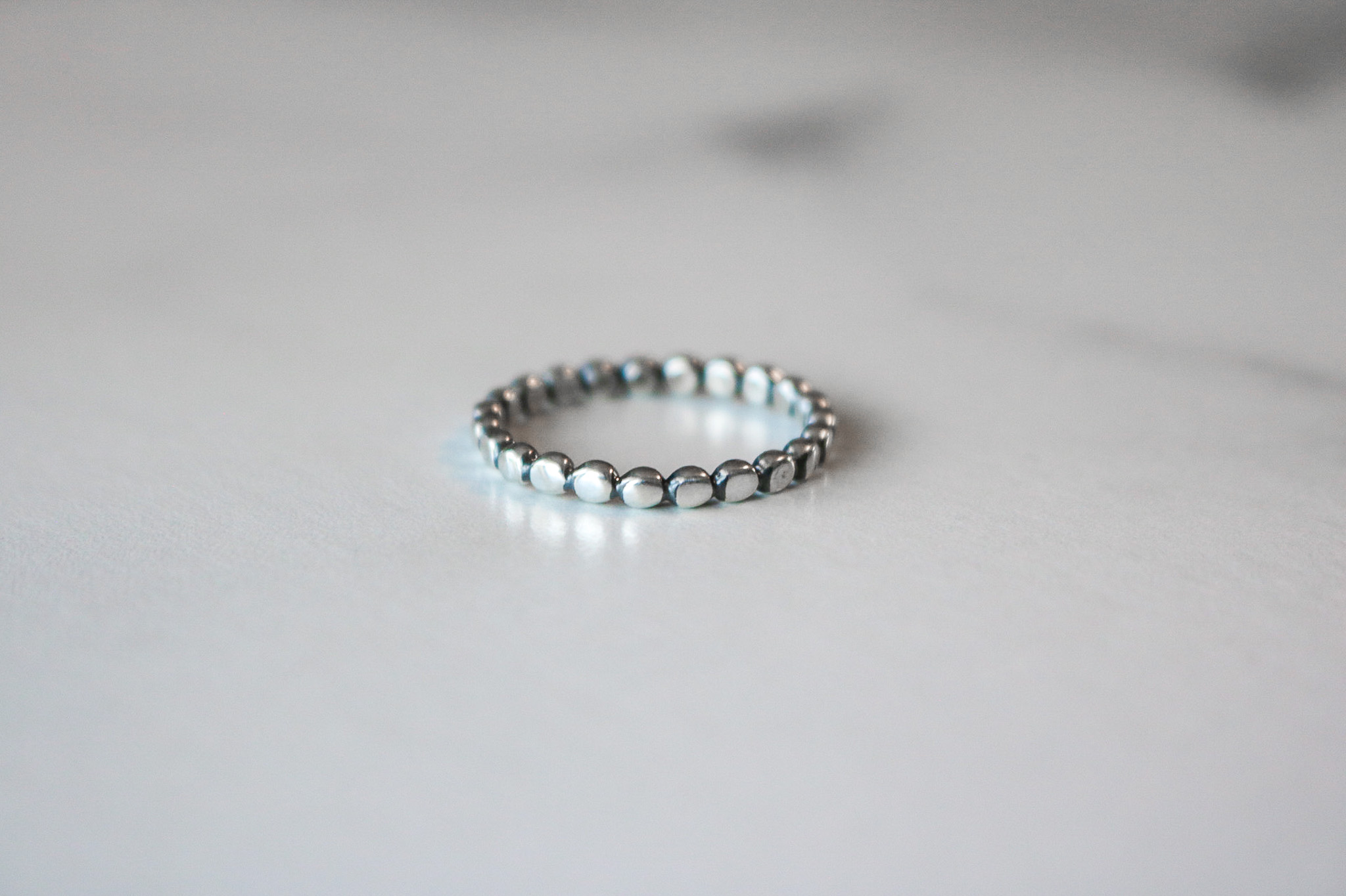 Sterling silver bead ring that has been hand hammered to smooth out the beads. Finished with an oxidation process and then polished to a high shine.