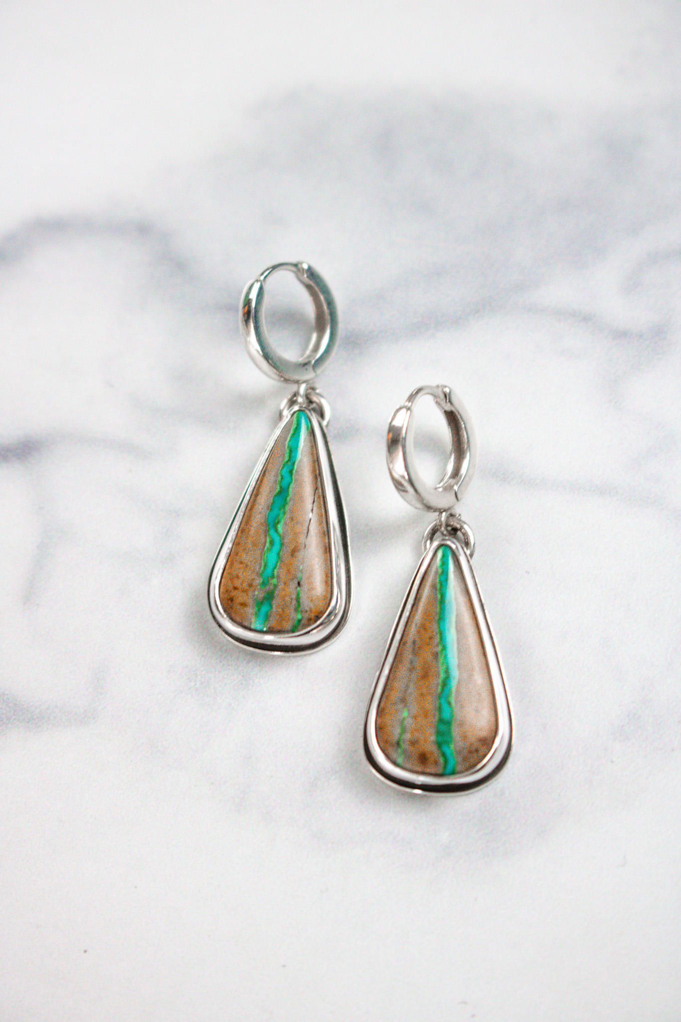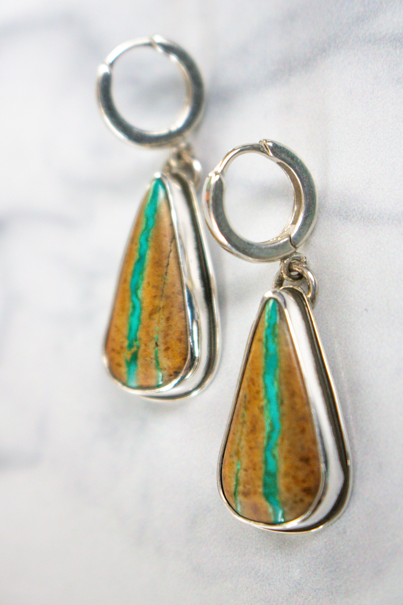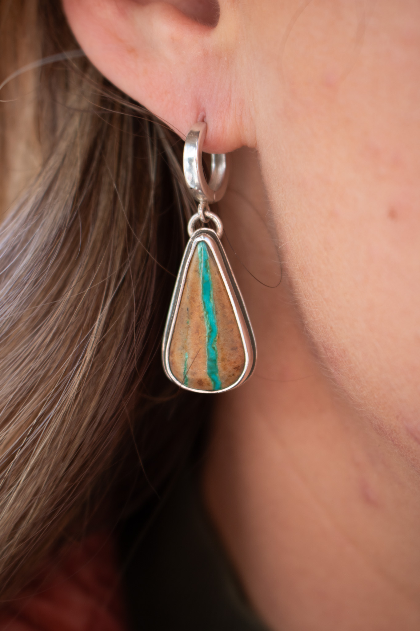 Made with Royston River turquoise, these hoops represent the precious water that runs through our (mostly) desert state and the life it brings with it. We are all connected by it and it remains a sacred place for so many.