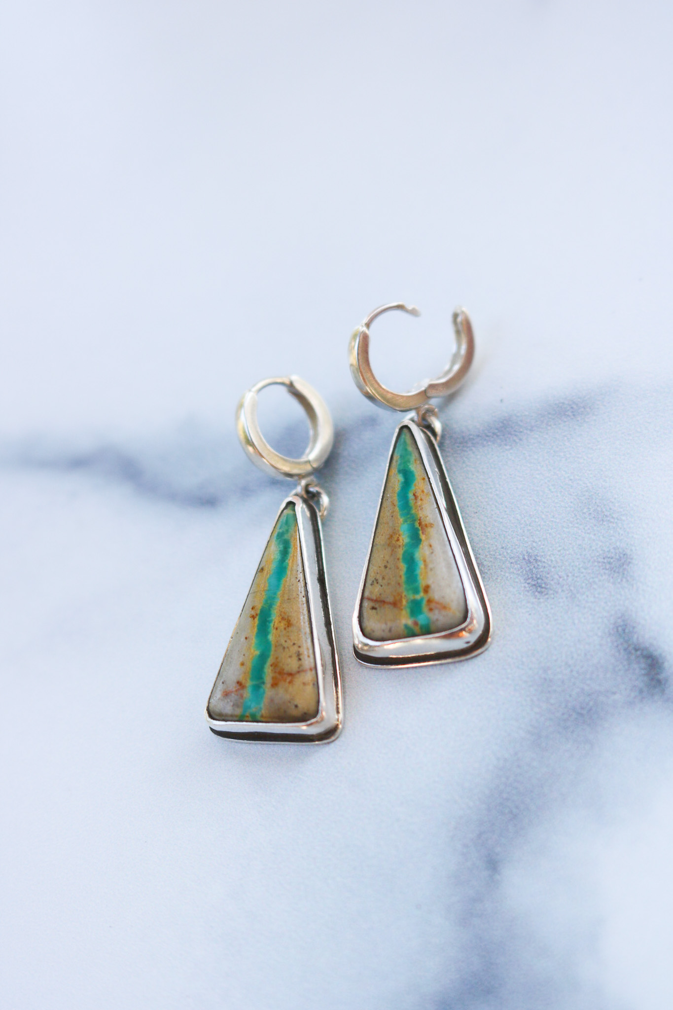 Made with Royston River turquoise, these hoops are a love letter to the water that runs through our (mostly) desert state. We are all connected by it and it remains a sacred place for so many. The earrings have a secure clipping huggie hoop for my adventure babes and are finished with makers mark and a high shine finish.