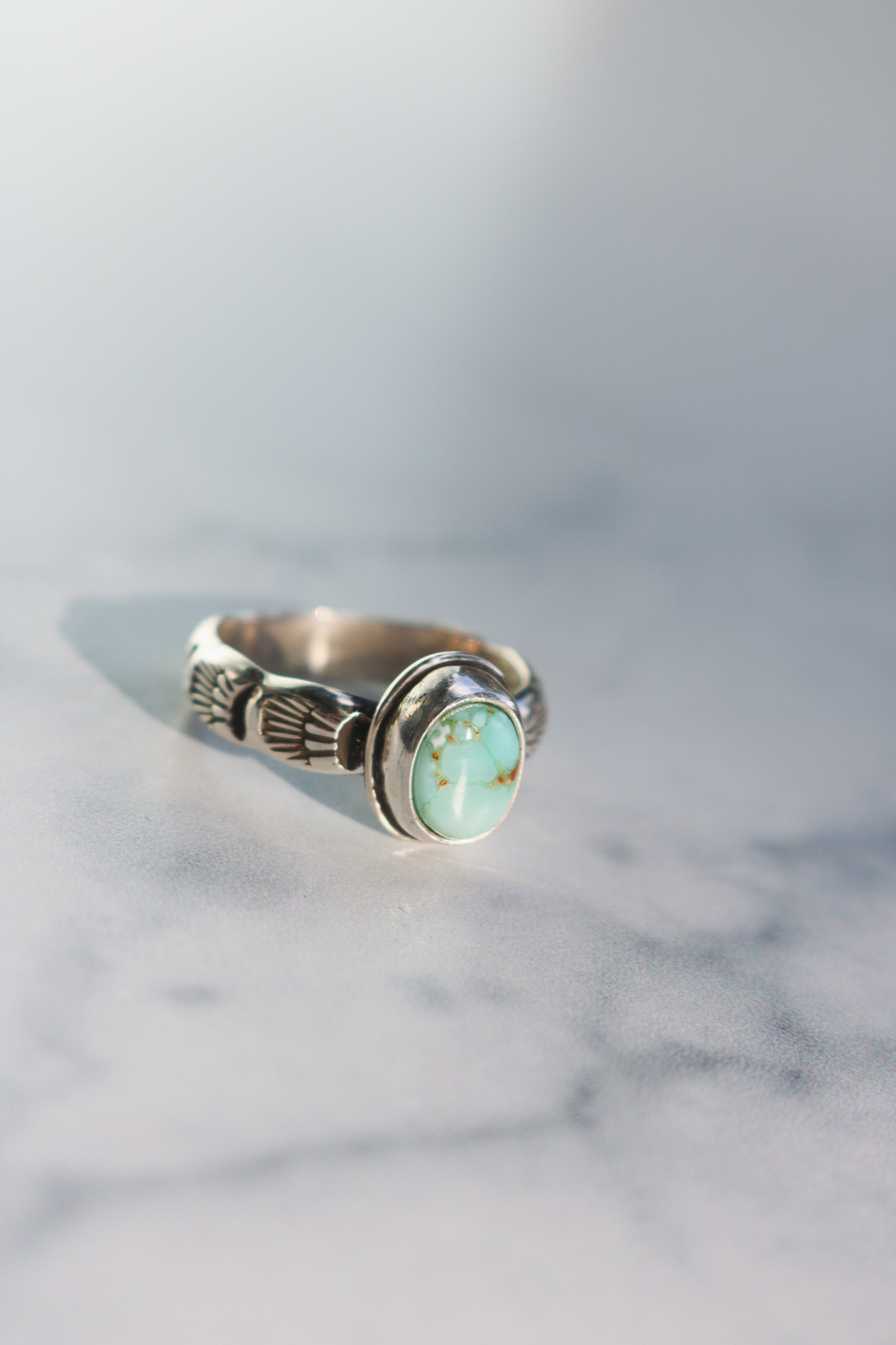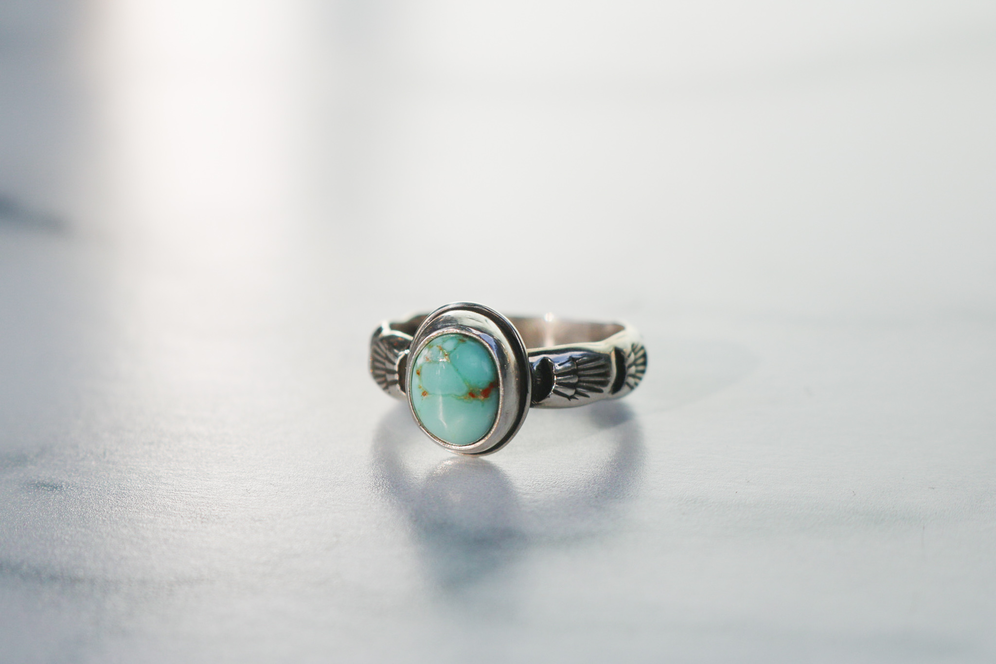 Handcut Sante Fe turquoise set on a sterling silver stacking ring with hand stamped detail. Great as a stand alone ring or stacked with other rings. Oxidized and polished to a high shine. Band is 3/16” wide and a size 7.25.
