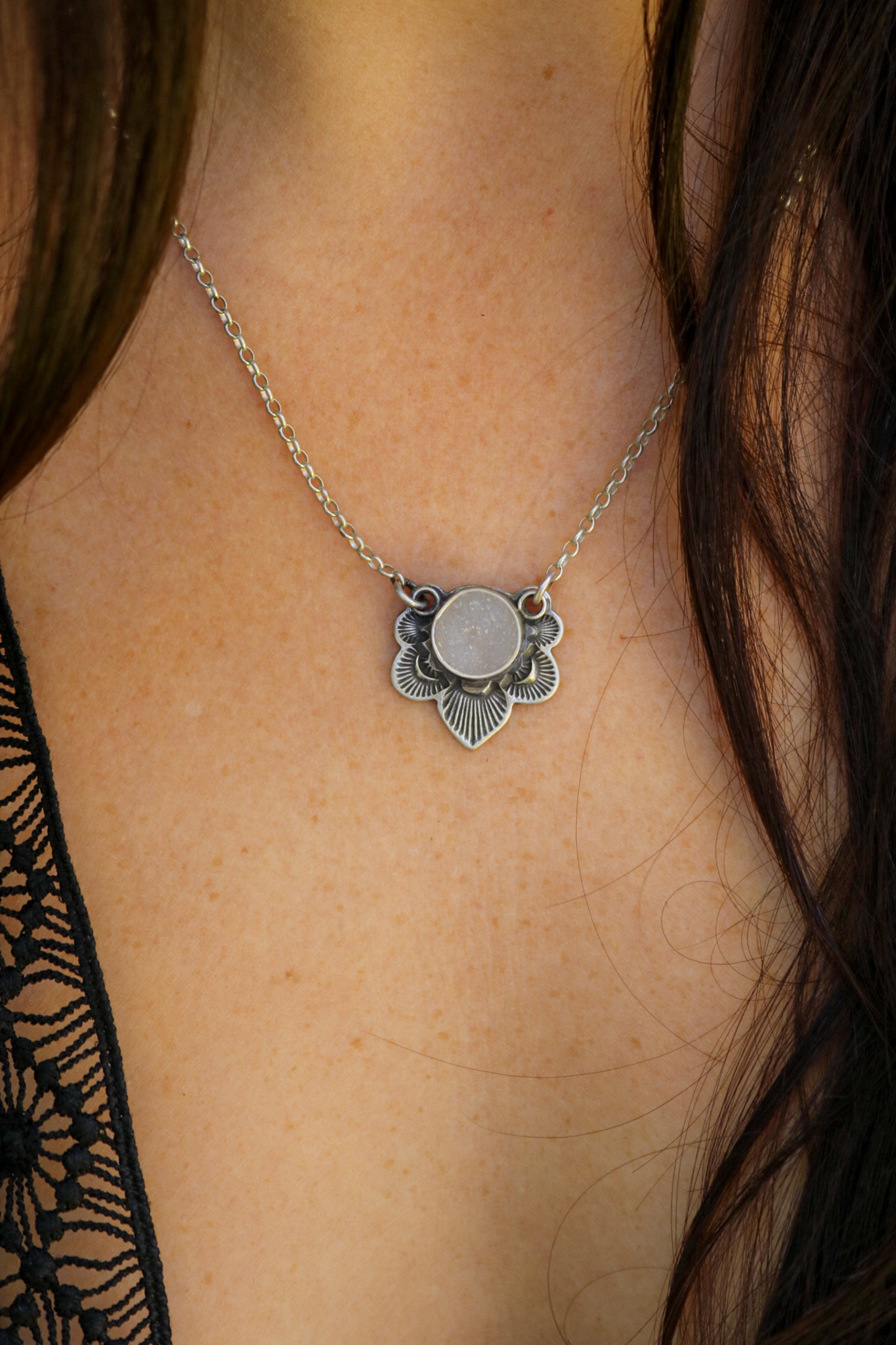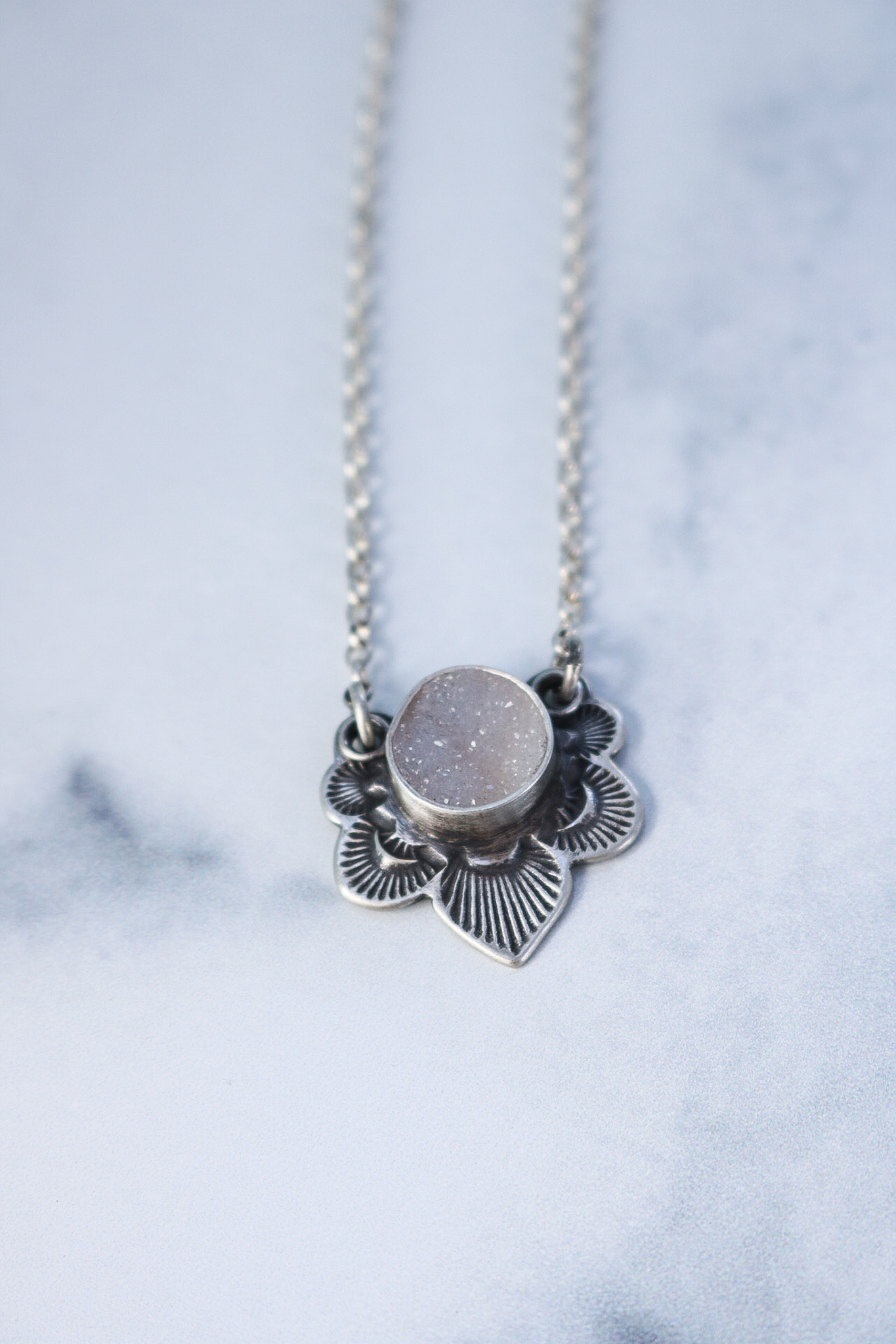 Named for sweet winter moon that rises full in February and gently lights up the snow in Northern Arizona. Druzy crystal set on sterling silver pendant, surrounded by hand stamped detail. Oxidized and given a soft matte finish. Hung from a sterling chain with 16” and 18” length settings for layering or stand-alone wear. Hand stamped R&R retail at the clasp.