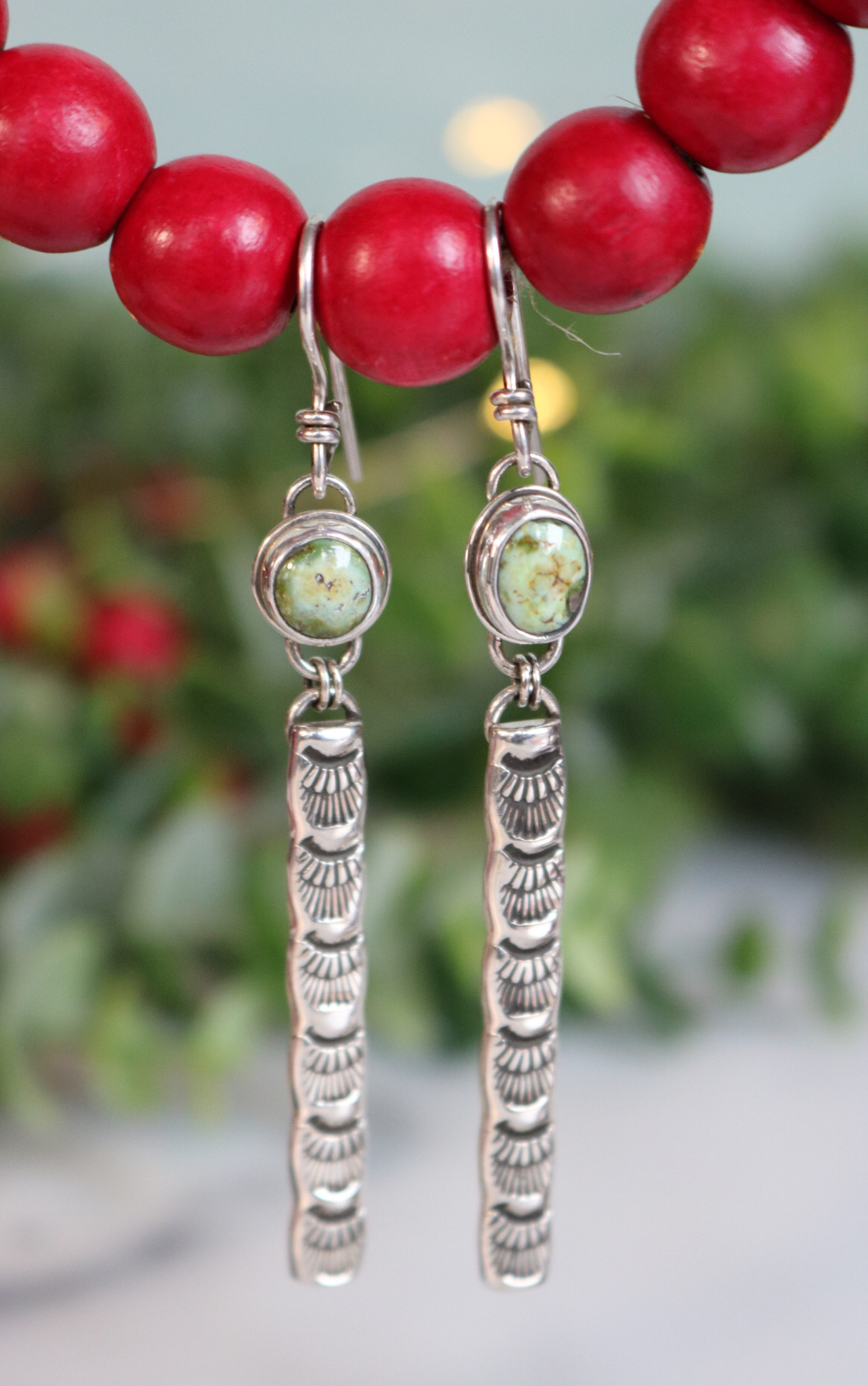 Warm Sonoran Gold stones set over 1.75″ hand stamped bar earrings. Earrings are 3″ long from ear wire to the bottom of the bar and all components are sterling silver.