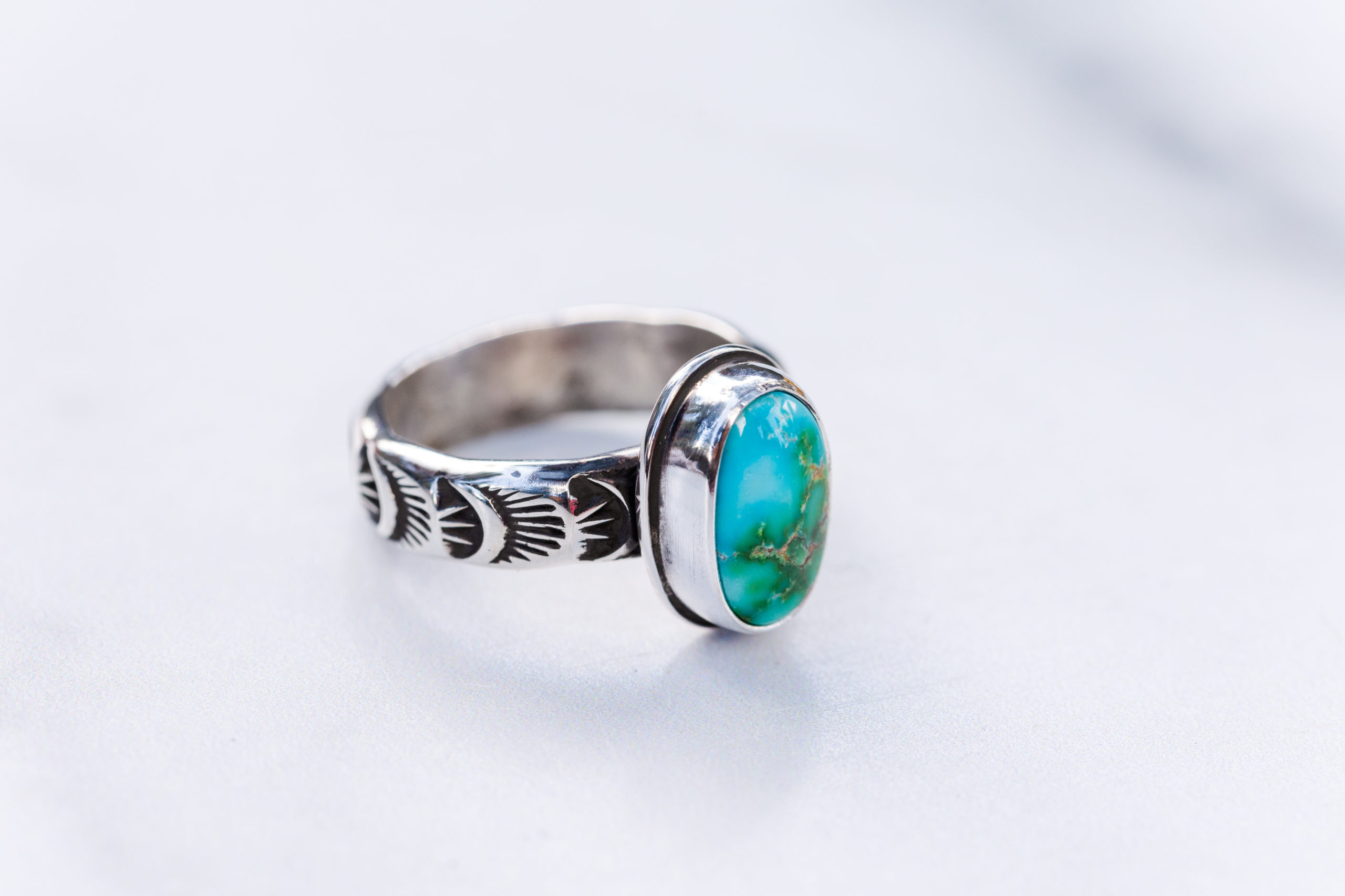 Sonoran Gold turquoise set on a handstamped sterling band. Oxidized and given a high shine. Size 7 but can be sized up to a 7.5.