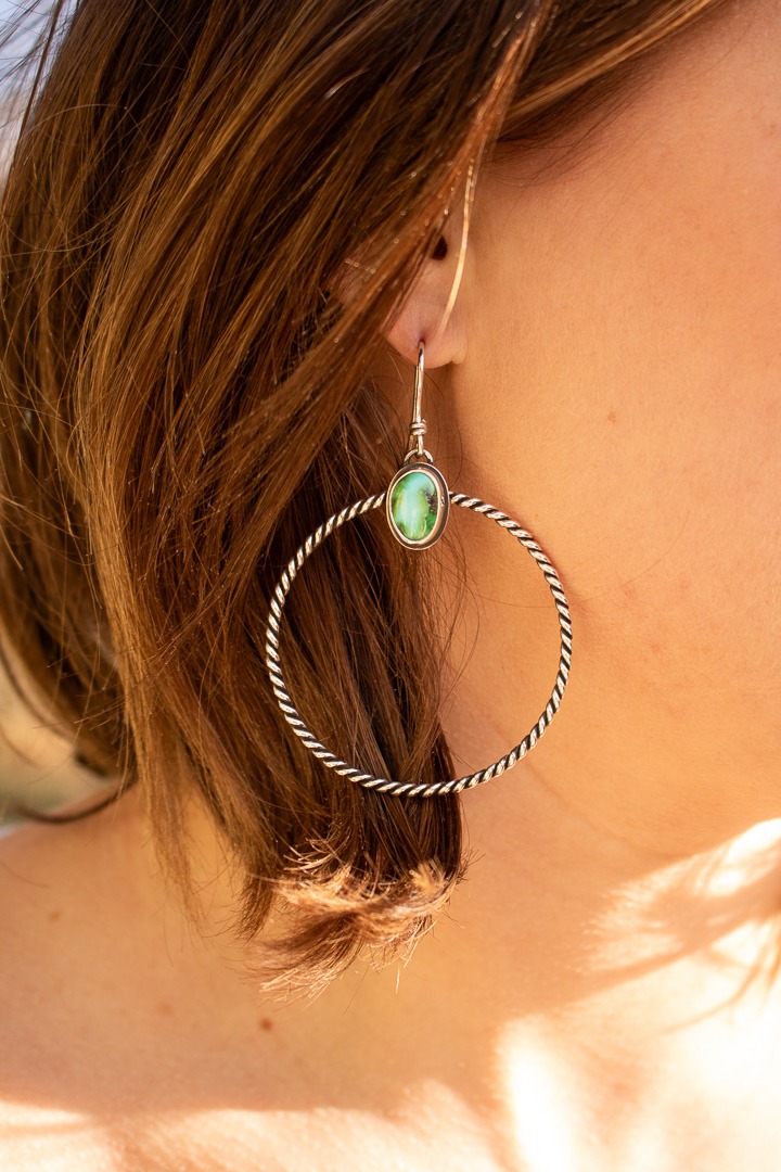 This pair has been made with hand twisted sterling wire and vibrant blue and green Sonoran Mountain stones. Finished with a round of oxidation to showcase the detail and then given a high shine polish.