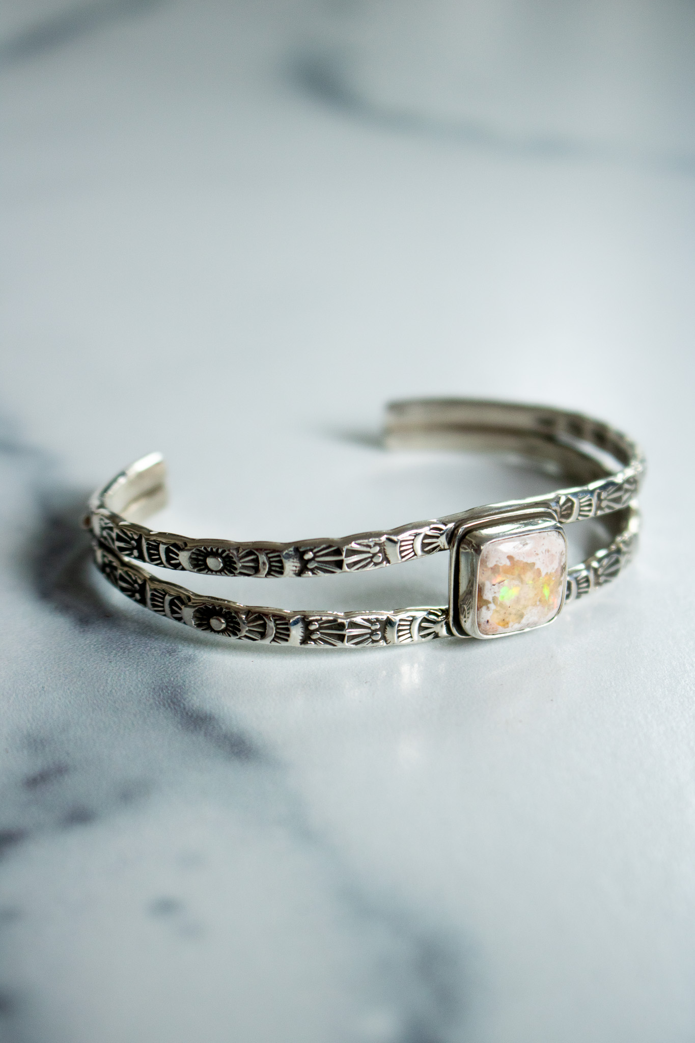 The cuff starts out as two pieces of full round sterling wire that I hammer flat and then hand stamped, including an R+R markers mark and sterling mark inside the band. After its been shaped into a cuff, I solder the bezel for and set a gorgeous square piece of Mexican fire Opal. Its then oxidized to highlight the detail and polished to a high shine. Band is 1/2″ wide at its widest point and is in 5.75” length (medium size) but can be sized down upon request.