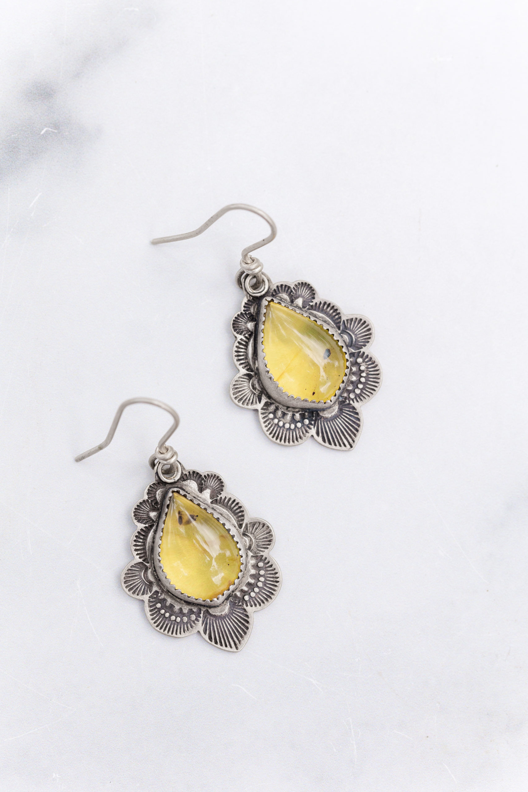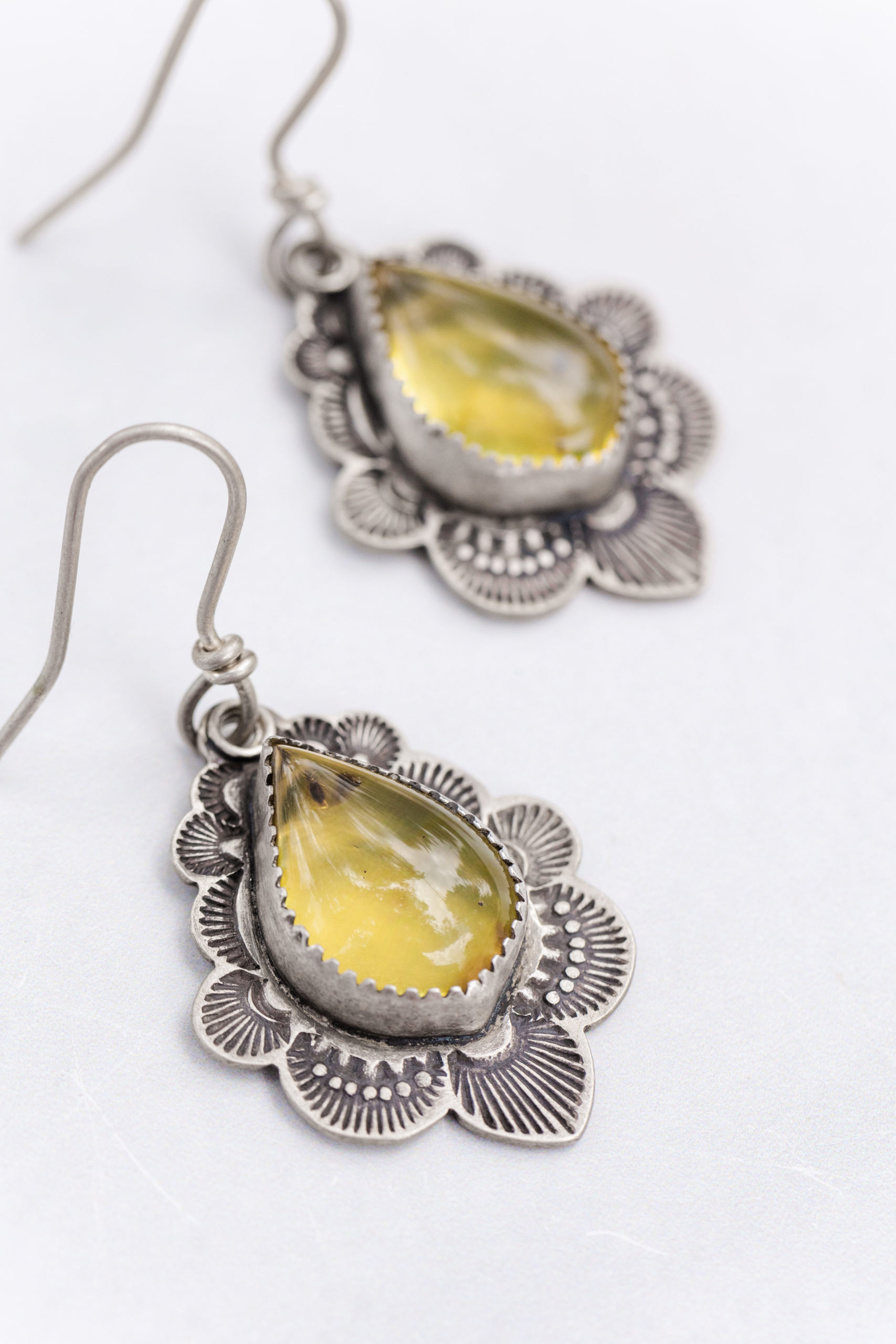 Handcut Mexican Amber decorated with handstamped sterling. The back of the pendant is cut out to let the light shine through the stone. Finished with a satin matte finish and measuring 2″ long.